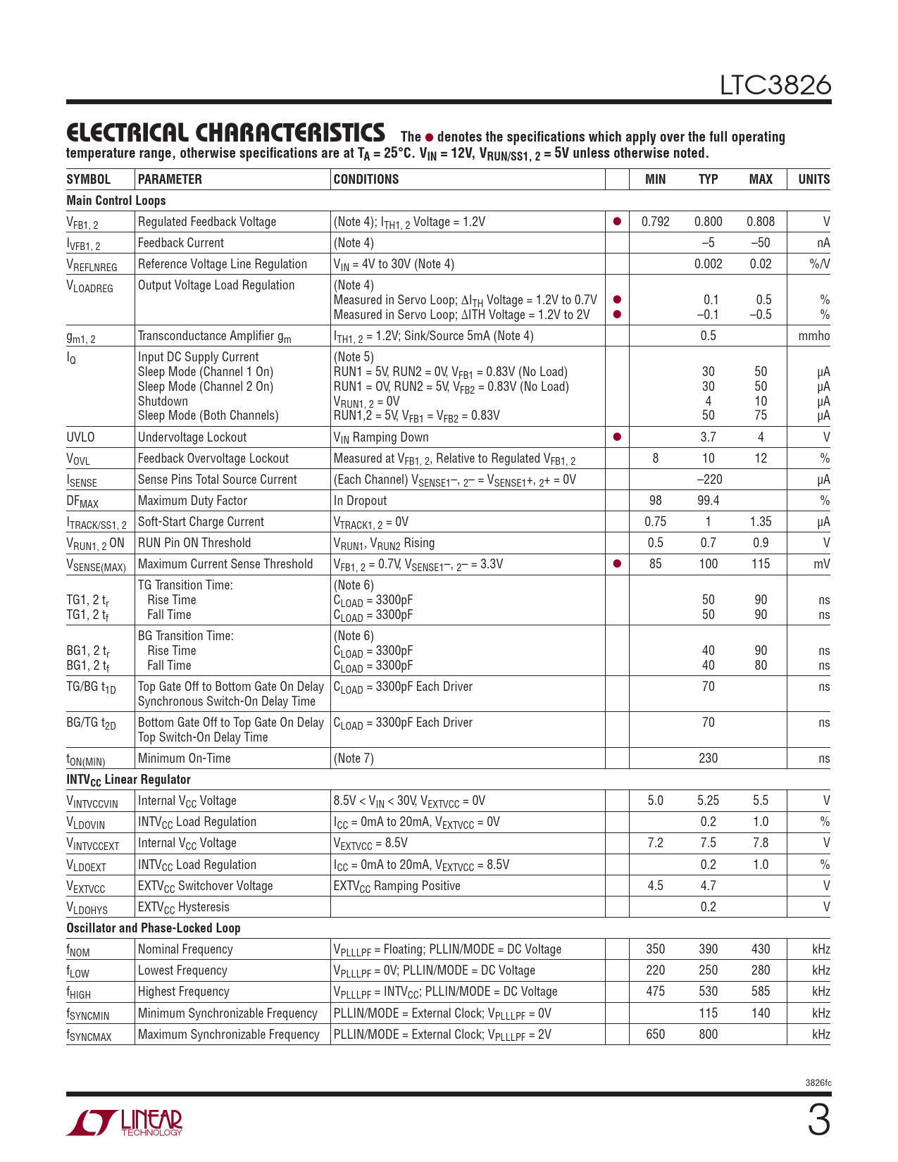 VFB1, 2 Regulated Feedback Voltage (Note 4); ITH1, 2 Voltage = 1.2V l 0.792 0.800 0.808 V IVFB1, 2 Feedback Current (Note 4) –5 –50 nA VREFLNREG Reference Voltage Line Regulation VIN = 4V to 30V (Note 4) 0.002 0.02 %/V VLOADREG Output Voltage Load Regulation (Note 4) Measured in Servo Loop; ΔITH Voltage = 1.2V to 0.7V l 0.1 0.5 % Measured in Servo Loop; ΔITH Voltage = 1.2V to 2V l –0.1 –0.5 % gm1, 2 Transconductance Amplifi er gm ITH1, 2 = 1.2V; Sink/Source 5mA (Note 4) 0.5 mmho IQ Input DC Supply Current (Note 5) Sleep Mode (Channel 1 On) RUN1 = 5V, RUN2 = 0V, VFB1 = 0.83V (No Load) 30 50 μA Sleep Mode (Channel 2 On) RUN1 = OV, RUN2 = 5V, VFB2 = 0.83V (No Load) 30 50 μA Shutdown VRUN1, 2 = 0V 4 10 μA Sleep Mode (Both Channels) RUN1,2 = 5V, VFB1 = VFB2 = 0.83V 50 75 μA UVLO Undervoltage Lockout VIN Ramping Down l 3.7 4 V VOVL Feedback Overvoltage Lockout Measured at VFB1, 2, Relative to Regulated VFB1, 2 8 10 12 % ISENSE Sense Pins Total Source Current (Each Channel) VSENSE1–, 2– = VSENSE1+, 2+ = 0V –220 μA DFMAX Maximum Duty Factor In Dropout 98 99.4 % ITRACK/SS1, 2 Soft-Start Charge Current VTRACK1, 2 = 0V 0.75 1 1.35 μA VRUN1, 2 ON RUN Pin ON Threshold VRUN1, VRUN2 Rising 0.5 0.7 0.9 V VSENSE(MAX) Maximum Current Sense Threshold VFB1, 2 = 0.7V, VSENSE1–, 2– = 3.3V l 85 100 115 mV TG Transition Time: (Note 6) TG1, 2 tr Rise Time CLOAD = 3300pF 50 90 ns TG1, 2 tf Fall Time CLOAD = 3300pF 50 90 ns BG Transition Time: (Note 6) BG1, 2 tr Rise Time CLOAD = 3300pF 40 90 ns BG1, 2 tf Fall Time CLOAD = 3300pF 40 80 ns TG/BG t1D Top Gate Off to Bottom Gate On Delay CLOAD = 3300pF Each Driver 70 ns Synchronous Switch-On Delay Time BG/TG t2D Bottom Gate Off to Top Gate On Delay CLOAD = 3300pF Each Driver 70 ns Top Switch-On Delay Time tON(MIN) Minimum On-Time (Note 7) 230 ns