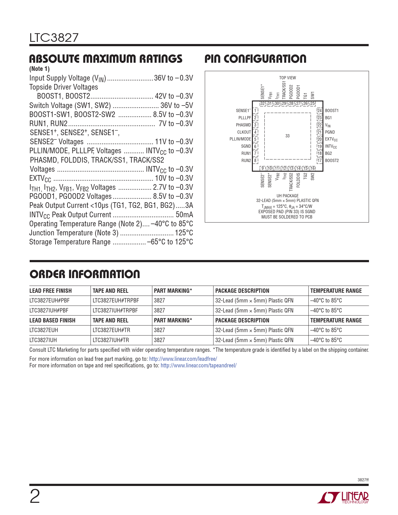LTC3827EUH LTC3827EUH#TR 3827 32-Lead (5mm × 5mm) Plastic QFN –40°C to 85°C LTC3827IUH LTC3827IUH#TR 3827 32-Lead (5mm × 5mm) Plastic QFN –40°C to 85°C Consult LTC Marketing for parts specifi ed with wider operating temperature ranges. *The temperature grade is identifi ed by a label on the shipping container. For more information on lead free part marking, go to: http://www.linear.com/leadfree/ For more information on tape and reel specifi cations, go to: http://www.linear.com/tapeandreel/ 3827ff 2
