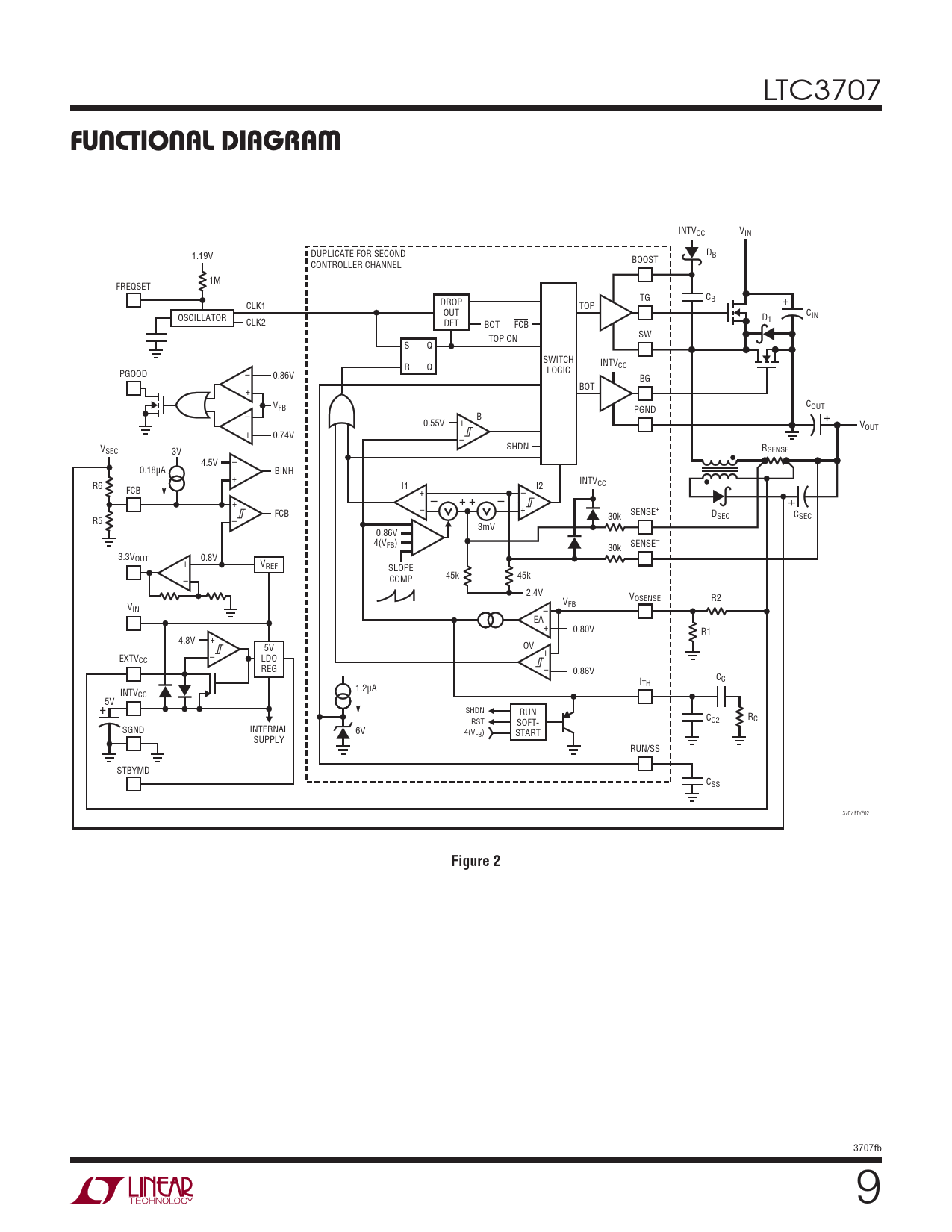 LTC3707 FUNCTIONAL DIAGRAM INTVCC VIN DUPLICATE FOR SECOND D 1.19V B BOOST CONTROLLER CHANNEL 1M FREQSET TG CB CLK1 DROP TOP + OUT CIN OSCILLATOR D CLK2 1 DET BOT FCB SW TOP ON S Q SWITCH INTVCC R Q LOGIC PGOOD – 0.86V BG BOT + V C FB PGND OUT+ – B 0.55V + VOUT + 0.74V – V SHDN SEC 3V RSENSE 4.5V – 0.18μA BINH + INTV R6 CC I1 I2 FCB + – + – + + – + FCB – + SENSE+ D 30k SEC C R5 SEC – 3mV 0.86V 4(VFB) SENSE– 30k 3.3VOUT 0.8V + VREF SLOPE 45k 45k – COMP 2.4V VOSENSE R2 V V FB IN – EA + 0.80V R1 4.8V + 5V OV + EXTV – CC LDO REG – 0.86V C I C TH INTV 1.2μA CC 5V + SHDN RUN C R RST SOFT- C2 C SGND INTERNAL 6V 4(VFB) START SUPPLY RUN/SS STBYMD CSS 3707 FD/F02 Figure 2 3707fb 9