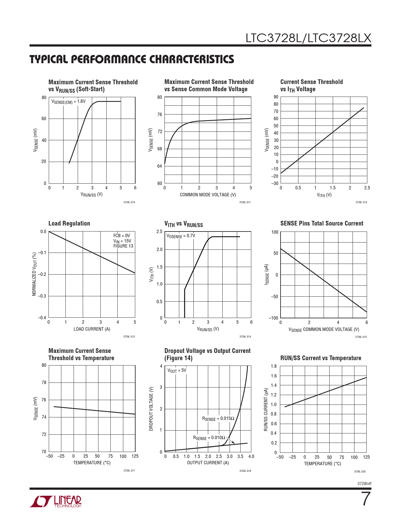 80 80 90 VSENSE(CM) = 1.6V 80 70 76 60 60 50 72 40 (mV) (mV) (mV) 40 30 20 V SENSE V SENSE 68 V SENSE 10 20 0 64 –10 –20 0 60 –30 0 1 2 3 4 5 6 0 1 2 3 4 5 0 0.5 1 1.5 2 2.5 VRUN/SS (V) COMMON MODE VOLTAGE (V) VITH (V) 3728L G10 3728L G11 3728L G12