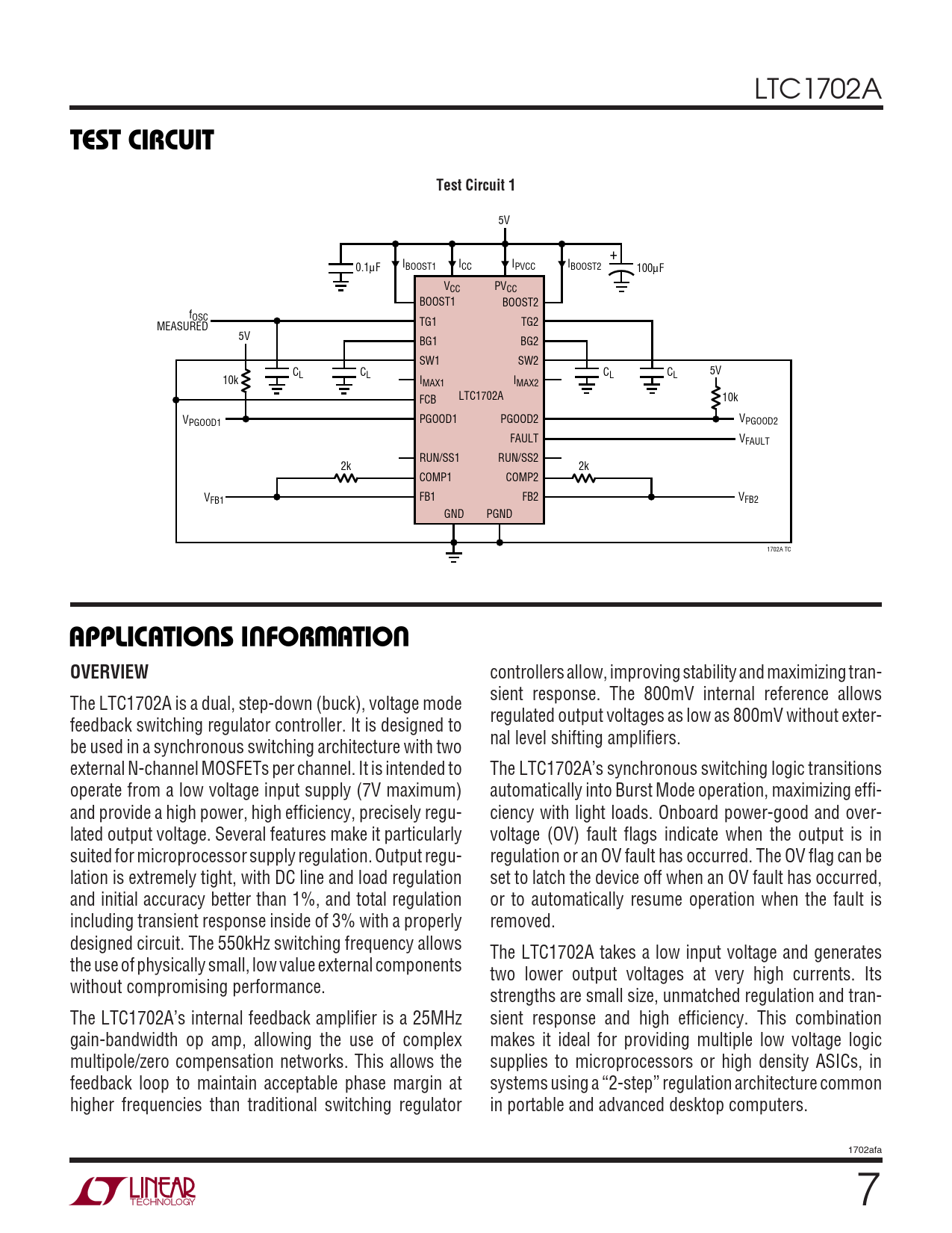 LTC1702A TEST CIRCUITTest Circuit 1 5V + 0.1µF IBOOST1 ICC IPVCC IBOOST2 100µF VCC PVCC BOOST1 BOOST2 fOSC TG1 TG2 MEASURED 5V BG1 BG2 SW1 SW2 CL CL CL CL 5V 10k IMAX1 IMAX2 FCB LTC1702A 10k V PGOOD1 PGOOD2 PGOOD1 VPGOOD2 FAULT VFAULT RUN/SS1 RUN/SS2 2k 2k COMP1 COMP2 V FB1 FB2 FB1 VFB2 GND PGND 1702A TC UUWUAPPLICATIONS INFORMATIONOVERVIEW controllers allow, improving stability and maximizing tran- sient response. The 800mV internal reference allows The LTC1702A is a dual, step-down (buck), voltage mode regulated output voltages as low as 800mV without exter- feedback switching regulator controller. It is designed to nal level shifting amplifiers. be used in a synchronous switching architecture with two external N-channel MOSFETs per channel. It is intended to The LTC1702A’s synchronous switching logic transitions operate from a low voltage input supply (7V maximum) automatically into Burst Mode operation, maximizing effi- and provide a high power, high efficiency, precisely regu- ciency with light loads. Onboard power-good and over- lated output voltage. Several features make it particularly voltage (OV) fault flags indicate when the output is in suited for microprocessor supply regulation. Output regu- regulation or an OV fault has occurred. The OV flag can be lation is extremely tight, with DC line and load regulation set to latch the device off when an OV fault has occurred, and initial accuracy better than 1%, and total regulation or to automatically resume operation when the fault is including transient response inside of 3% with a properly removed. designed circuit. The 550kHz switching frequency allows The LTC1702A takes a low input voltage and generates the use of physically small, low value external components two lower output voltages at very high currents. Its without compromising performance. strengths are small size, unmatched regulation and tran- The LTC1702A’s internal feedback amplifier is a 25MHz sient response and high efficiency. This combination gain-bandwidth op amp, allowing the use of complex makes it ideal for providing multiple low voltage logic multipole/zero compensation networks. This allows the supplies to microprocessors or high density ASICs, in feedback loop to maintain acceptable phase margin at systems using a “2-step” regulation architecture common higher frequencies than traditional switching regulator in portable and advanced desktop computers. 1702afa 7