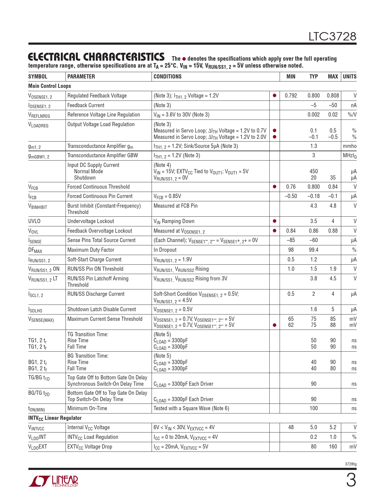VOSENSE1, 2 Regulated Feedback Voltage (Note 3); ITH1, 2 Voltage = 1.2V l 0.792 0.800 0.808 V IOSENSE1, 2 Feedback Current (Note 3) –5 –50 nA VREFLNREG Reference Voltage Line Regulation VIN = 3.6V to 30V (Note 3) 0.002 0.02 %/V VLOADREG Output Voltage Load Regulation (Note 3) Measured in Servo Loop; ΔITH Voltage = 1.2V to 0.7V l 0.1 0.5 % Measured in Servo Loop; ΔITH Voltage = 1.2V to 2.0V l –0.1 –0.5 % gm1, 2 Transconductance Amplifi er gm ITH1, 2 = 1.2V; Sink/Source 5μA (Note 3) 1.3 mmho gmGBW1, 2 Transconductance Amplifi er GBW ITH1, 2 = 1.2V (Note 3) 3 MHzIQ Input DC Supply Current (Note 4) Normal Mode VIN = 15V; EXTVCC Tied to VOUT1; VOUT1 = 5V 450 μA Shutdown VRUN/SS1, 2 = 0V 20 35 μA VFCB Forced Continuous Threshold l 0.76 0.800 0.84 V IFCB Forced Continuous Pin Current VFCB = 0.85V –0.50 –0.18 –0.1 μA VBINHIBIT Burst Inhibit (Constant-Frequency) Measured at FCB Pin 4.3 4.8 V Threshold UVLO Undervoltage Lockout VIN Ramping Down l 3.5 4 V VOVL Feedback Overvoltage Lockout Measured at VOSENSE1, 2 l 0.84 0.86 0.88 V ISENSE Sense Pins Total Source Current (Each Channel); VSENSE1–, 2– = VSENSE1+, 2+ = 0V –85 –60 μA DFMAX Maximum Duty Factor In Dropout 98 99.4 % IRUN/SS1, 2 Soft-Start Charge Current VRUN/SS1, 2 = 1.9V 0.5 1.2 μA VRUN/SS1, 2 ON RUN/SS Pin ON Threshold VRUN/SS1, VRUN/SS2 Rising 1.0 1.5 1.9 V VRUN/SS1, 2 LT RUN/SS Pin Latchoff Arming VRUN/SS1, VRUN/SS2 Rising from 3V 3.8 4.5 V Threshold ISCL1, 2 RUN/SS Discharge Current Soft-Short Condition VOSENSE1, 2 = 0.5V; 0.5 2 4 μA VRUN/SS1, 2 = 4.5V ISDLHO Shutdown Latch Disable Current VOSENSE1, 2 = 0.5V 1.6 5 μA VSENSE(MAX) Maximum Current Sense Threshold VOSENSE1, 2 = 0.7V, VOSENSE1–, 2– = 5V 65 75 85 mV VOSENSE1, 2 = 0.7V, VOSENSE1–, 2– = 5V l 62 75 88 mV TG Transition Time: (Note 5) TG1, 2 tr Rise Time CLOAD = 3300pF 50 90 ns TG1, 2 tf Fall Time CLOAD = 3300pF 50 90 ns BG Transition Time: (Note 5) BG1, 2 tr Rise Time CLOAD = 3300pF 40 90 ns BG1, 2 tf Fall Time CLOAD = 3300pF 40 80 ns TG/BG t1D Top Gate Off to Bottom Gate On Delay Synchronous Switch-On Delay Time CLOAD = 3300pF Each Driver 90 ns BG/TG t2D Bottom Gate Off to Top Gate On Delay Top Switch-On Delay Time CLOAD = 3300pF Each Driver 90 ns tON(MIN) Minimum On-Time Tested with a Square Wave (Note 6) 100 ns
