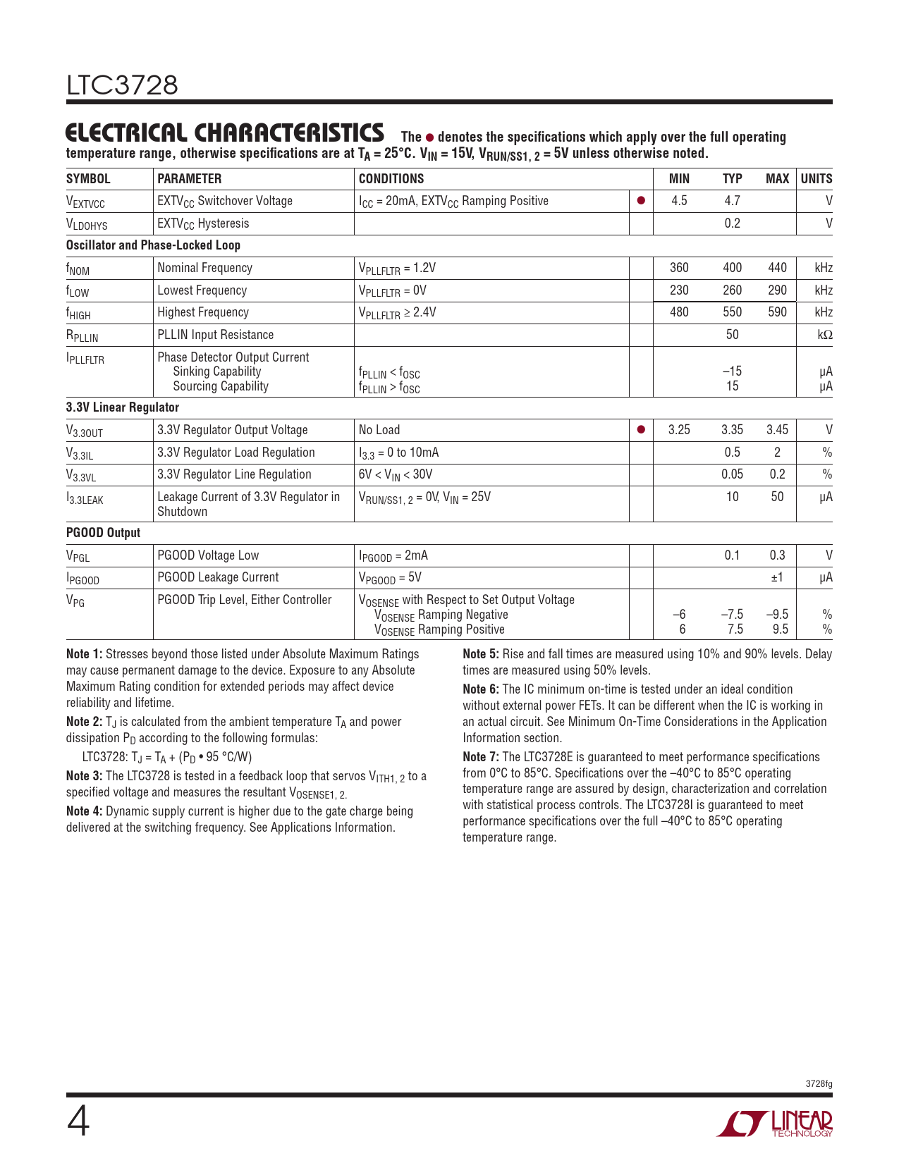 LTC3728 ELECTRICAL CHARACTERISTICSThe l denotes the specifi cations which apply over the full operatingtemperature range, otherwise specifi cations are at TA = 25°C. VIN = 15V, VRUN/SS1, 2 = 5V unless otherwise noted.SYMBOLPARAMETERCONDITIONSMINTYPMAX UNITS VEXTVCC EXTVCC Switchover Voltage ICC = 20mA, EXTVCC Ramping Positive l 4.5 4.7 V VLDOHYS EXTVCC Hysteresis 0.2 V Oscillator and Phase-Locked Loop fNOM Nominal Frequency VPLLFLTR = 1.2V 360 400 440 kHz fLOW Lowest Frequency VPLLFLTR = 0V 230 260 290 kHz fHIGH Highest Frequency VPLLFLTR ≥ 2.4V 480 550 590 kHz RPLLIN PLLIN Input Resistance 50 kΩ IPLLFLTR Phase Detector Output Current Sinking Capability fPLLIN < fOSC –15 μA Sourcing Capability fPLLIN > fOSC 15 μA 3.3V Linear Regulator V3.3OUT 3.3V Regulator Output Voltage No Load l 3.25 3.35 3.45 V V3.3IL 3.3V Regulator Load Regulation I3.3 = 0 to 10mA 0.5 2 % V3.3VL 3.3V Regulator Line Regulation 6V < VIN < 30V 0.05 0.2 % I3.3LEAK Leakage Current of 3.3V Regulator in VRUN/SS1, 2 = 0V, VIN = 25V 10 50 μA Shutdown PGOOD Output VPGL PGOOD Voltage Low IPGOOD = 2mA 0.1 0.3 V IPGOOD PGOOD Leakage Current VPGOOD = 5V ±1 μA VPG PGOOD Trip Level, Either Controller VOSENSE with Respect to Set Output Voltage VOSENSE Ramping Negative –6 –7.5 –9.5 % VOSENSE Ramping Positive 6 7.5 9.5 % Note 1: Stresses beyond those listed under Absolute Maximum Ratings Note 5: Rise and fall times are measured using 10% and 90% levels. Delay may cause permanent damage to the device. Exposure to any Absolute times are measured using 50% levels. Maximum Rating condition for extended periods may affect device Note 6: The IC minimum on-time is tested under an ideal condition reliability and lifetime. without external power FETs. It can be different when the IC is working in Note 2: TJ is calculated from the ambient temperature TA and power an actual circuit. See Minimum On-Time Considerations in the Application dissipation PD according to the following formulas: Information section. LTC3728: TJ = TA + (PD • 95 °C/W) Note 7: The LTC3728E is guaranteed to meet performance specifi cations Note 3: The LTC3728 is tested in a feedback loop that servos V from 0°C to 85°C. Specifi cations over the –40°C to 85°C operating ITH1, 2 to a specifi ed voltage and measures the resultant V temperature range are assured by design, characterization and correlation OSENSE1, 2. Note 4: Dynamic supply current is higher due to the gate charge being with statistical process controls. The LTC3728I is guaranteed to meet delivered at the switching frequency. See Applications Information. performance specifi cations over the full –40°C to 85°C operating temperature range. 3728fg 4