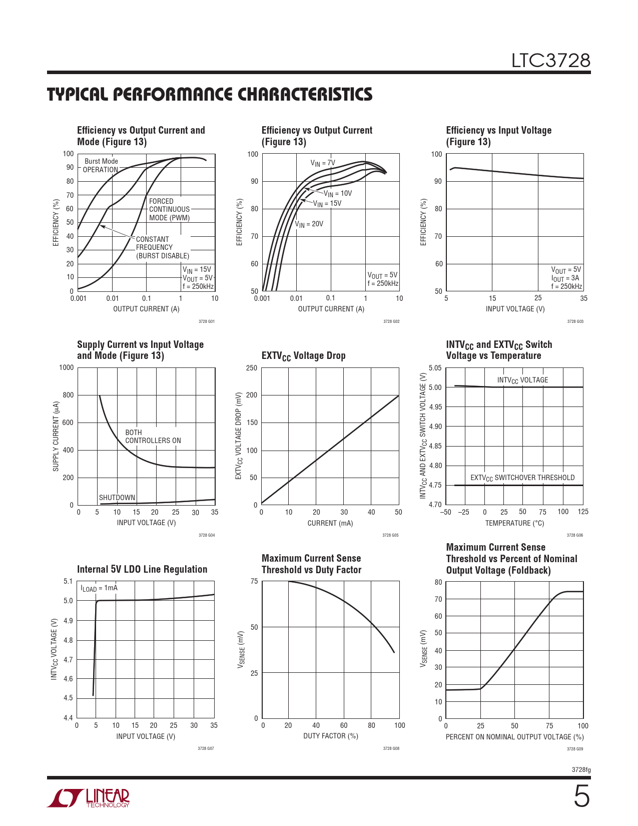 5.1 75 80 ILOAD = 1mA 5.0 70 60 4.9 50 50 4.8 (mV) (mV) 40 VOLTAGE (V) 4.7 CC SENSE SENSE V V 30 25 INTV 4.6 20 4.5 10 4.4 0 0 0 5 10 15 20 25 30 35 0 20 40 60 80 100 0 25 50 75 100 INPUT VOLTAGE (V) DUTY FACTOR (%) PERCENT ON NOMINAL OUTPUT VOLTAGE (%) 3728 G07 3728 G08 3728 G09 3728fg 5
