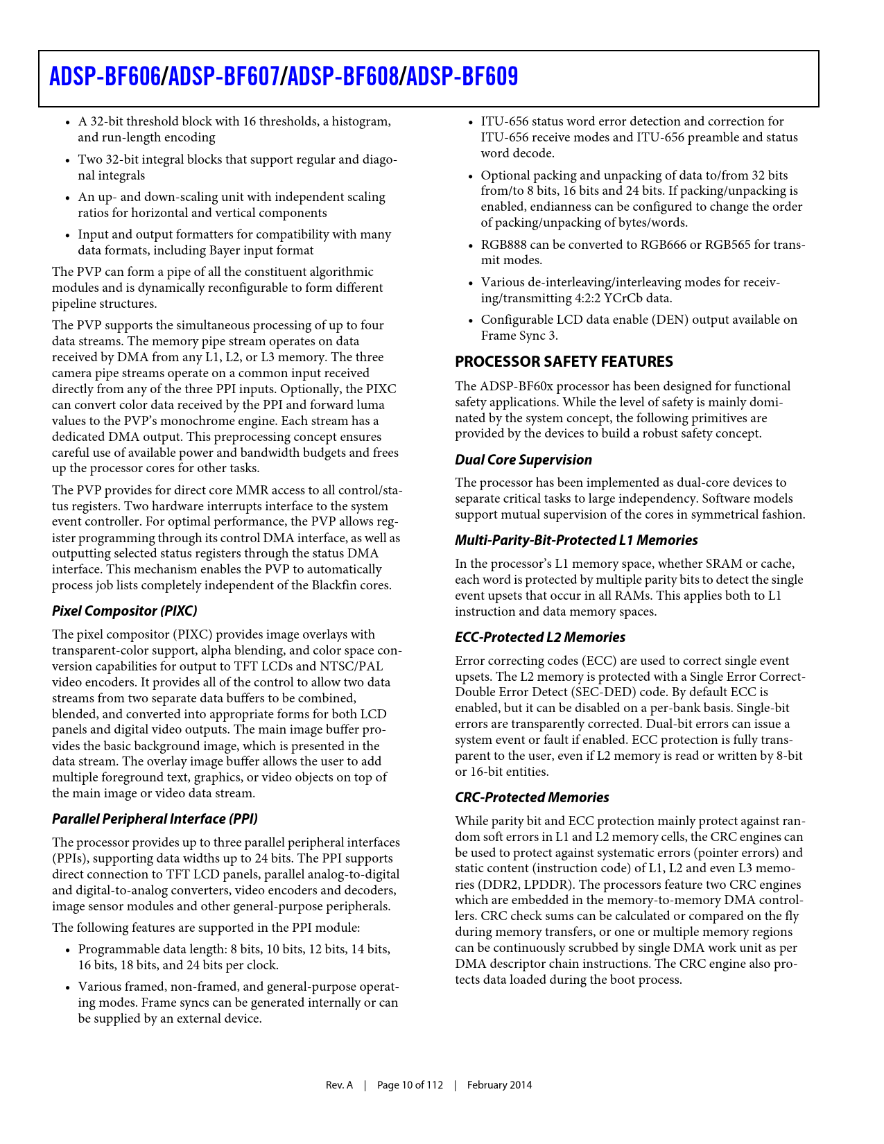 outputting selected status registers through the status DMA interface. This mechanism enables the PVP to automatically In the processor’s L1 memory space, whether SRAM or cache, process job lists completely independent of the Blackfin cores. each word is protected by multiple parity bits to detect the single event upsets that occur in all RAMs. This applies both to L1