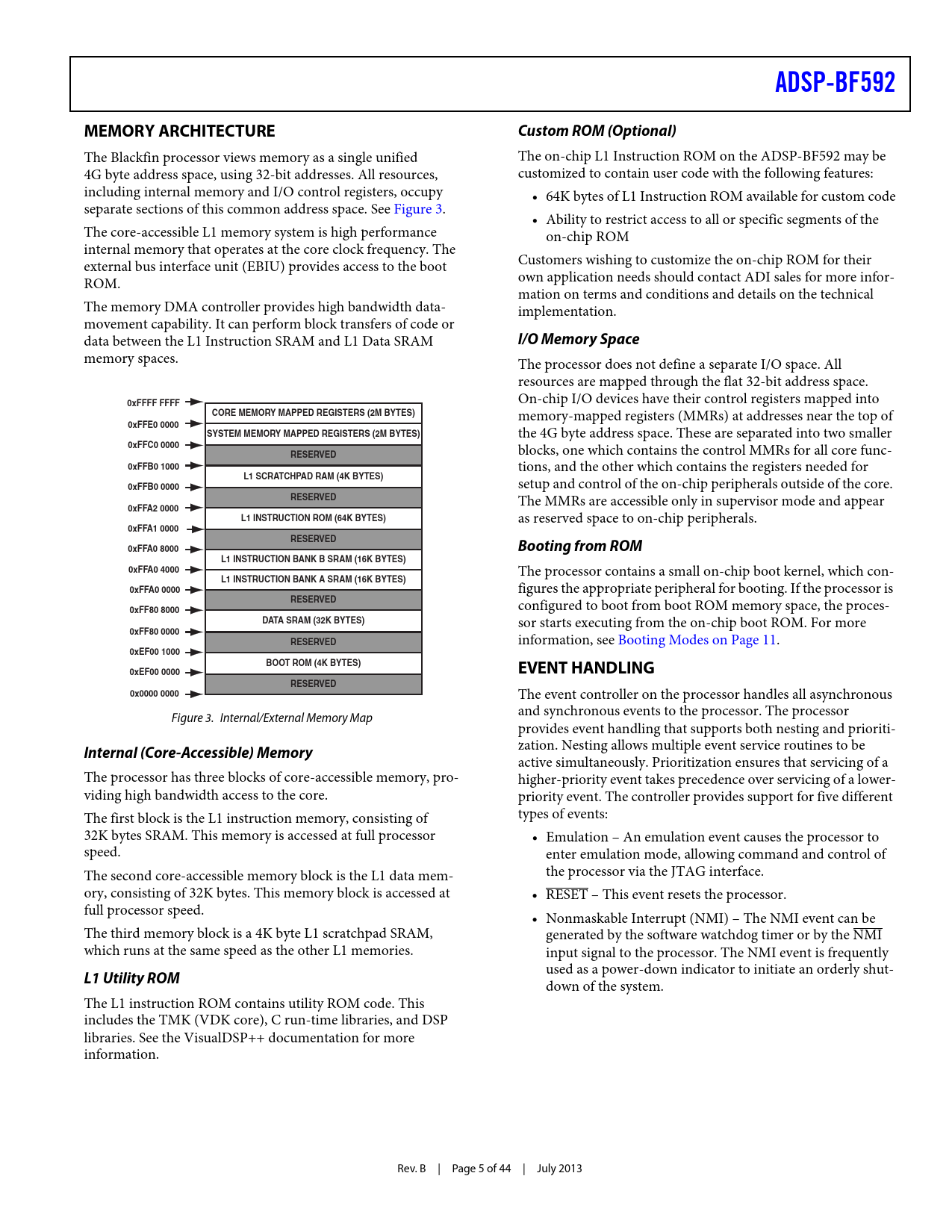 link to page 5 link to page 11 ADSP-BF592MEMORY ARCHITECTURECustom ROM (Optional) The Blackfin processor views memory as a single unified The on-chip L1 Instruction ROM on the ADSP-BF592 may be 4G byte address space, using 32-bit addresses. All resources, customized to contain user code with the following features: including internal memory and I/O control registers, occupy • 64K bytes of L1 Instruction ROM available for custom code separate sections of this common address space. See Figure 3. • Ability to restrict access to all or specific segments of the The core-accessible L1 memory system is high performance on-chip ROM internal memory that operates at the core clock frequency. The external bus interface unit (EBIU) provides access to the boot Customers wishing to customize the on-chip ROM for their ROM. own application needs should contact ADI sales for more infor- mation on terms and conditions and details on the technical The memory DMA controller provides high bandwidth data- implementation. movement capability. It can perform block transfers of code or data between the L1 Instruction SRAM and L1 Data SRAM I/O Memory Space memory spaces. The processor does not define a separate I/O space. All resources are mapped through the flat 32-bit address space. 0xFFFF FFFF On-chip I/O devices have their control registers mapped into CORE MEMORY MAPPED REGISTERS (2M BYTES) memory-mapped registers (MMRs) at addresses near the top of 0xFFE0 0000SYSTEM MEMORY MAPPED REGISTERS (2M BYTES) the 4G byte address space. These are separated into two smaller 0xFFC0 0000 blocks, one which contains the control MMRs for all core func- RESERVED0xFFB0 1000 tions, and the other which contains the registers needed for L1 SCRATCHPAD RAM (4K BYTES)0xFFB0 0000 setup and control of the on-chip peripherals outside of the core. RESERVED The MMRs are accessible only in supervisor mode and appear 0xFFA2 0000L1 INSTRUCTION ROM (64K BYTES) as reserved space to on-chip peripherals. 0xFFA1 0000RESERVED0xFFA0 8000Booting from ROML1 INSTRUCTION BANK B SRAM (16K BYTES)0xFFA0 4000 The processor contains a small on-chip boot kernel, which con- L1 INSTRUCTION BANK A SRAM (16K BYTES)0xFFA0 0000 figures the appropriate peripheral for booting. If the processor is RESERVED0xFF80 8000 configured to boot from boot ROM memory space, the proces- DATA SRAM (32K BYTES) sor starts executing from the on-chip boot ROM. For more 0xFF80 0000RESERVED information, see Booting Modes on Page 11. 0xEF00 1000BOOT ROM (4K BYTES)0xEF00 0000EVENT HANDLINGRESERVED0x0000 0000 The event controller on the processor handles all asynchronous and synchronous events to the processor. The processor Figure 3. Internal/External Memory Map provides event handling that supports both nesting and prioriti- zation. Nesting allows multiple event service routines to be Internal (Core-Accessible) Memory active simultaneously. Prioritization ensures that servicing of a The processor has three blocks of core-accessible memory, pro- higher-priority event takes precedence over servicing of a lower- viding high bandwidth access to the core. priority event. The controller provides support for five different The first block is the L1 instruction memory, consisting of types of events: 32K bytes SRAM. This memory is accessed at full processor • Emulation – An emulation event causes the processor to speed. enter emulation mode, allowing command and control of The second core-accessible memory block is the L1 data mem- the processor via the JTAG interface. ory, consisting of 32K bytes. This memory block is accessed at • RESET – This event resets the processor. full processor speed. • Nonmaskable Interrupt (NMI) – The NMI event can be The third memory block is a 4K byte L1 scratchpad SRAM, generated by the software watchdog timer or by the NMI which runs at the same speed as the other L1 memories. input signal to the processor. The NMI event is frequently used as a power-down indicator to initiate an orderly shut- L1 Utility ROM down of the system. The L1 instruction ROM contains utility ROM code. This includes the TMK (VDK core), C run-time libraries, and DSP libraries. See the VisualDSP++ documentation for more information. Rev. B | Page 5 of 44 | July 2013 Document Outline Blackfin Embedded Processor Features Memory Peripherals Table Of Contents Revision History General Description Portable Low Power Architecture System Integration Blackfin Processor Core Memory Architecture Internal (Core-Accessible) Memory L1 Utility ROM Custom ROM (Optional) I/O Memory Space Booting from ROM Event Handling Core Event Controller (CEC) System Interrupt Controller (SIC) DMA Controllers Processor Peripherals Watchdog Timer Timers Serial Ports Serial Peripheral Interface (SPI) Ports UART Port Parallel Peripheral Interface (PPI) General-Purpose Mode Descriptions ITU-R 656 Mode Descriptions TWI Controller Interface Ports General-Purpose I/O (GPIO) Dynamic Power Management Full-On Operating Mode—Maximum Performance Active Operating Mode—Moderate Dynamic Power Savings Sleep Operating Mode—High Dynamic Power Savings Deep Sleep Operating Mode—Maximum Dynamic Power Savings Hibernate State—Maximum Static Power Savings Power Savings Voltage Regulation Clock Signals Booting Modes Instruction Set Description Development Tools Integrated Development Environments (IDEs) EZ-KIT Lite Evaluation Board EZ-KIT Lite Evaluation Kits Software Add-Ins for CrossCore Embedded Studio Board Support Packages for Evaluation Hardware Middleware Packages Algorithmic Modules Designing an Emulator-Compatible DSP Board (Target) Additional Information Related Signal Chains Signal Descriptions Specifications Operating Conditions ADSP-BF592 Clock Related Operating Conditions Electrical Characteristics Total Power Dissipation Absolute Maximum Ratings ESD Sensitivity Package Information Timing Specifications Clock and Reset Timing Parallel Peripheral Interface Timing Serial Ports Serial Peripheral Interface 