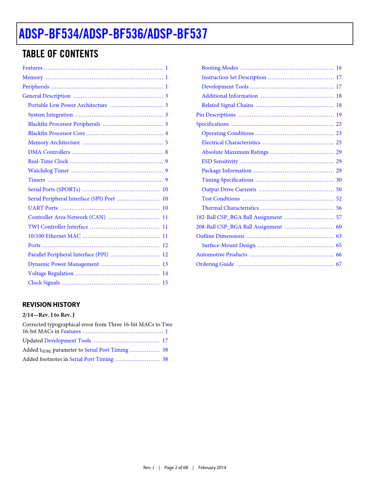 link to page 1 link to page 1 link to page 1 link to page 3 link to page 3 link to page 3 link to page 3 link to page 4 link to page 5 link to page 8 link to page 9 link to page 9 link to page 9 link to page 10 link to page 10 link to page 10 link to page 11 link to page 11 link to page 11 link to page 12 link to page 12 link to page 13 link to page 14 link to page 15 link to page 16 link to page 17 link to page 17 link to page 18 link to page 18 link to page 19 link to page 23 link to page 23 link to page 25 link to page 29 link to page 29 link to page 29 link to page 30 link to page 50 link to page 52 link to page 56 link to page 57 link to page 60 link to page 63 link to page 65 link to page 66 link to page 67 link to page 1 link to page 38 link to page 17 link to page 38 ADSP-BF534/ADSP-BF536/ADSP-BF537TABLE OF CONTENTS Features ... 1 Booting Modes ... 16 Memory .. 1 Instruction Set Description .. 17 Peripherals ... 1 Development Tools .. 17 General Description ... 3 Additional Information .. 18 Portable Low Power Architecture ... 3 Related Signal Chains ... 18 System Integration .. 3 Pin Descriptions .. 19 Blackfin Processor Peripherals ... 3 Specifications .. 23 Blackfin Processor Core .. 4 Operating Conditions ... 23 Memory Architecture .. 5 Electrical Characteristics ... 25 DMA Controllers .. 8 Absolute Maximum Ratings ... 29 Real-Time Clock ... 9 ESD Sensitivity ... 29 Watchdog Timer .. 9 Package Information .. 29 Timers ... 9 Timing Specifications ... 30 Serial Ports (SPORTs) .. 10 Output Drive Currents ... 50 Serial Peripheral Interface (SPI) Port ... 10 Test Conditions .. 52 UART Ports .. 10 Thermal Characteristics .. 56 Controller Area Network (CAN) .. 11 182-Ball CSP_BGA Ball Assignment ... 57 TWI Controller Interface .. 11 208-Ball CSP_BGA Ball Assignment ... 60 10/100 Ethernet MAC .. 11 Outline Dimensions .. 63 Ports .. 12 Surface-Mount Design .. 65 Parallel Peripheral Interface (PPI) ... 12 Automotive Products .. 66 Dynamic Power Management .. 13 Ordering Guide ... 67 Voltage Regulation .. 14 Clock Signals ... 15 REVISION HISTORY2/14—Rev. I to Rev. J Corrected typographical error from Three 16-bit MACs to Two 16-bit MACs in Features .. 1 Updated Development Tools .. 17 Added tHDRE parameter to Serial Port Timing .. 38 Added footnotes in Serial Port Timing .. 38 Rev. J | Page 2 of 68 | February 2014 Document Outline Blackfin Embedded Processor Features Memory Peripherals Table Of Contents Revision History General Description Portable Low Power Architecture System Integration Blackfin Processor Peripherals Blackfin Processor Core Memory Architecture Internal (On-Chip) Memory External (Off-Chip) Memory I/O Memory Space Booting Event Handling Core Event Controller (CEC) System Interrupt Controller (SIC) Event Control DMA Controllers Real-Time Clock Watchdog Timer Timers Serial Ports (SPORTs) Serial Peripheral Interface (SPI) Port UART Ports Controller Area Network (CAN) TWI Controller Interface 10/100 Ethernet MAC Ports General-Purpose I/O (GPIO) Parallel Peripheral Interface (PPI) General-Purpose Mode Descriptions Input Mode Frame Capture Mode Output Mode ITU-R 656 Mode Descriptions Active Video Mode Vertical Blanking Interval Mode Entire Field Mode Dynamic Power Management Full-On Operating Mode—Maximum Performance Active Operating Mode—Moderate Dynamic Power Savings Sleep Operating Mode—High Dynamic Power Savings Deep Sleep Operating Mode—Maximum Dynamic Power Savings Hibernate State—Maximum Static Power Savings Power Savings Voltage Regulation Clock Signals Booting Modes Instruction Set Description Development Tools Integrated Development Environments (IDEs) EZ-KIT Lite Evaluation Board EZ-KIT Lite Evaluation Kits Software Add-Ins for CrossCore Embedded Studio Board Support Packages for Evaluation Hardware Middleware Packages Algorithmic Modules Designing an Emulator-Compatible DSP Board (Target) Additional Information Related Signal Chains Pin Descriptions Specifications Operating Conditions Electrical Characteristics Absolute Maximum Ratings ESD Sensitivity Package Information Timing Specifications Clock and Reset Timing Asynchronous Memory Read Cycle Timing Asynchronous Memory Write Cycle Timing External Port Bus Request and Grant Cycle Timing SDRAM Interface Timing External DMA Request Timing Parallel Peripheral Interface Timing Serial Port Timing Serial Peripheral Interface Port—Master Timing Serial Peripheral Interface Port—Slave Timing General-Purpose Port Timing Universal Asynchronous Receiver-Transmitter (UART) Ports—Receive and Transmit Timing Timer Clock Timing Timer Cycle Timing JTAG Test and Emulation Port Timing 10/100 Ethernet MAC Controller Timing Output Drive Currents Test Conditions Output Enable Time Output Disable Time Example System Hold Time Calculation Capacitive Loading Thermal Characteristics 182-Ball CSP_BGA Ball Assignment 208-Ball CSP_BGA Ball Assignment Outline Dimensions Surface-Mount Design Automotive Products Ordering Guide