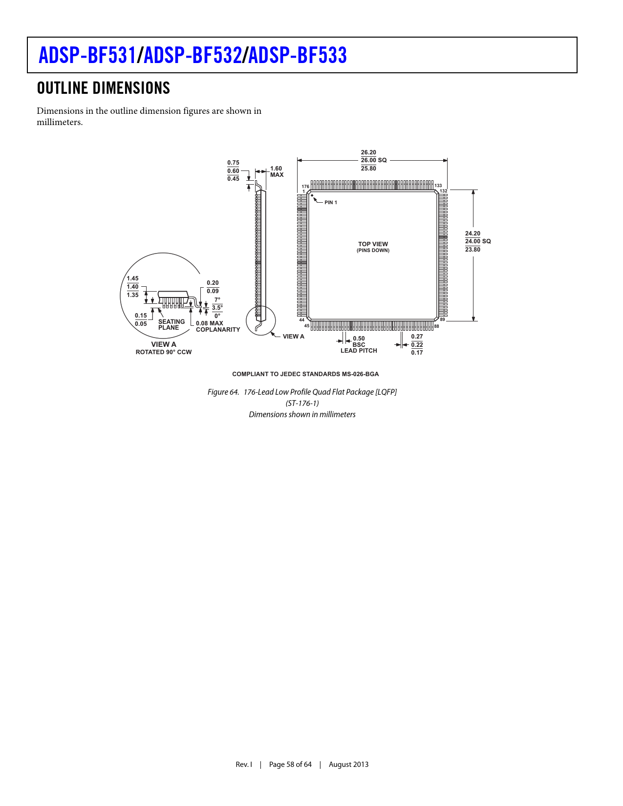 ADSP-BF531/ADSP-BF532/ADSP-BF533OUTLINE DIMENSIONS Dimensions in the outline dimension figures are shown in millimeters. 26.200.7526.00 SQ1.600.6025.80MAX0.451761331132PIN 124.20TOP VIEW24.00 SQ(PINS DOWN)23.801.45 1.400.201.350.097°3.5°0.150°44890.05SEATING0.08 MAX4588PLANECOPLANARITYVIEW A0.270.50VIEW ABSC0.22ROTATED 90° CCWLEAD PITCH0.17COMPLIANT TO JEDEC STANDARDS MS-026-BGA Figure 64. 176-Lead Low Profile Quad Flat Package [LQFP] (ST-176-1) Dimensions shown in millimeters Rev. I | Page 58 of 64 | August 2013 Document Outline Blackfin Embedded Processor Features Memory Peripherals Table Of Contents Revision History General Description Portable Low Power Architecture System Integration Processor Peripherals Blackfin Processor Core Memory Architecture Internal (On-Chip) Memory External (Off-Chip) Memory I/O Memory Space Booting Event Handling Core Event Controller (CEC) System Interrupt Controller (SIC) Event Control DMA Controllers Real-Time Clock Watchdog Timer Timers Serial Ports (SPORTs) Serial Peripheral Interface (SPI) Port UART Port General-Purpose I/O Port F Parallel Peripheral Interface General-Purpose Mode Descriptions Input Mode Frame Capture Mode Output Mode ITU-R 656 Mode Descriptions Active Video Only Mode Vertical Blanking Interval Mode Entire Field Mode Dynamic Power Management Full-On Operating Mode—Maximum Performance Active Operating Mode—Moderate Power Savings Sleep Operating Mode—High Dynamic Power Savings Deep Sleep Operating Mode—Maximum Dynamic Power Savings Hibernate State—Maximum Static Power Savings Power Savings Voltage Regulation Voltage Regulator Layout Guidelines Clock Signals Booting Modes Instruction Set Description Development Tools Integrated Development Environments (IDEs) EZ-KIT Lite Evaluation Board EZ-KIT Lite Evaluation Kits Software Add-Ins for CrossCore Embedded Studio Board Support Packages for Evaluation Hardware Middleware Packages Algorithmic Modules Designing an Emulator-Compatible DSP Board (Target) Additional Information Related Signal Chains Pin Descriptions Specifications Operating Conditions Electrical Characteristics Absolute Maximum Ratings ESD Sensitivity Package Information Timing Specifications Clock and Reset Timing Asynchronous Memory Read Cycle Timing Asynchronous Memory Write Cycle Timing SDRAM Interface Timing External Port Bus Request and Grant Cycle Timing Parallel Peripheral Interface Timing Serial Port Timing Serial Peripheral Interface (SPI) Port—Master Timing Serial Peripheral Interface (SPI) Port—Slave Timing General-Purpose I/O Port F Pin Cycle Timing Universal Asynchronous Receiver-Transmitter (UART) Ports—Receive and Transmit Timing Timer Clock Timing Timer Cycle Timing JTAG Test and Emulation Port Timing Output Drive Currents Test Conditions Output Enable Time Measurement Output Disable Time Measurement Example System Hold Time Calculation Capacitive Loading Thermal Characteristics 160-Ball CSP_BGA Ball Assignment 169-Ball PBGA Ball Assignment 176-Lead LQFP Pinout Outline Dimensions Surface-Mount Design Automotive Products Ordering Guide