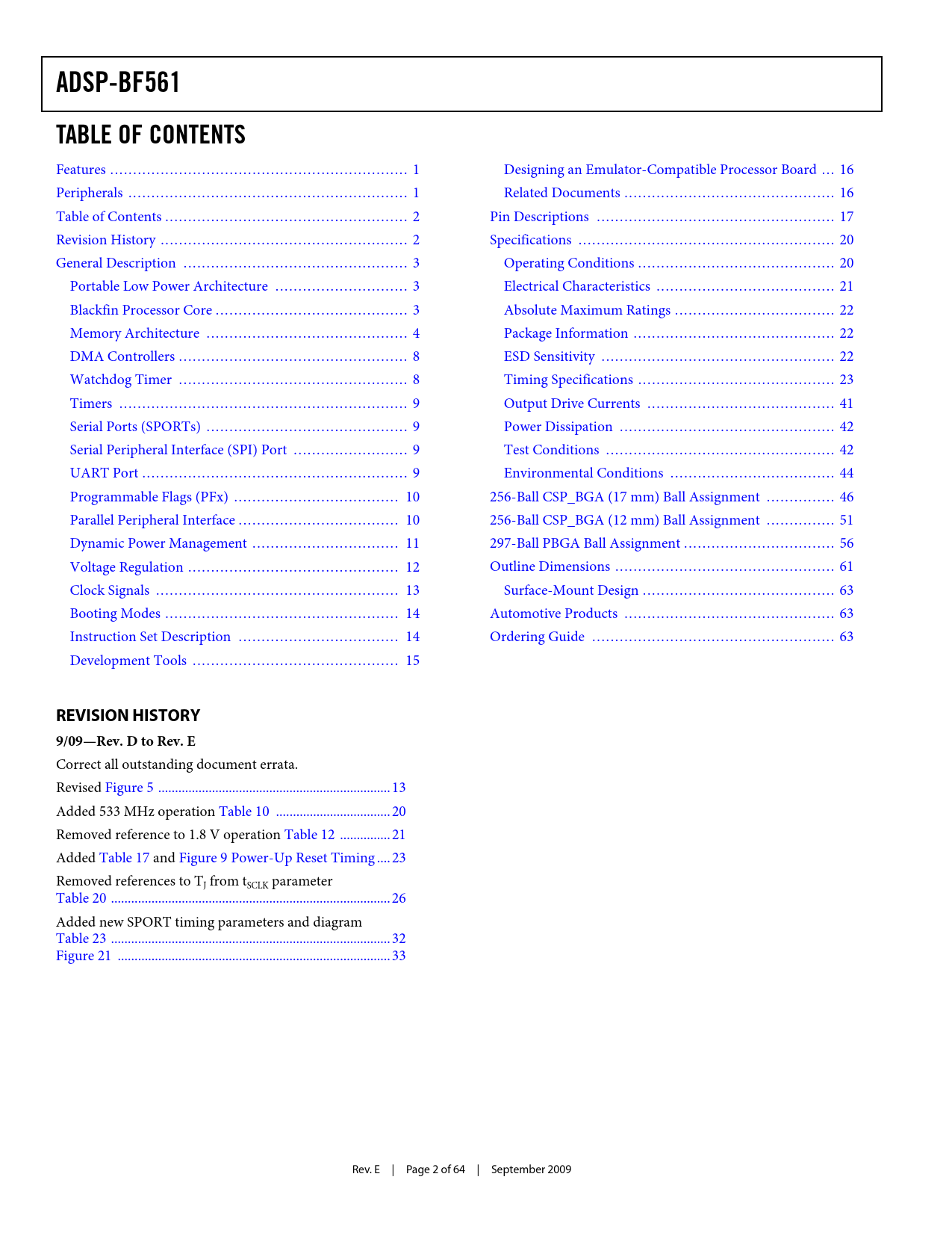 link to page 1 link to page 1 link to page 2 link to page 2 link to page 3 link to page 3 link to page 3 link to page 4 link to page 8 link to page 8 link to page 9 link to page 9 link to page 9 link to page 9 link to page 10 link to page 10 link to page 11 link to page 12 link to page 13 link to page 14 link to page 14 link to page 15 link to page 16 link to page 16 link to page 17 link to page 20 link to page 20 link to page 21 link to page 22 link to page 22 link to page 22 link to page 23 link to page 41 link to page 42 link to page 42 link to page 44 link to page 46 link to page 51 link to page 56 link to page 61 link to page 63 link to page 63 link to page 63 link to page 13 link to page 13 link to page 21 link to page 21 link to page 33 link to page 33 link to page 32 link to page 32 link to page 23 link to page 26 link to page 26 link to page 23 link to page 23 link to page 20 link to page 20 ADSP-BF561 TABLE OF CONTENTS Features ... 1 Designing an Emulator-Compatible Processor Board ... 16 Peripherals ... 1 Related Documents .. 16 Table of Contents ... 2 Pin Descriptions .. 17 Revision History .. 2 Specifications .. 20 General Description ... 3 Operating Conditions ... 20 Portable Low Power Architecture ... 3 Electrical Characteristics ... 21 Blackfin Processor Core .. 3 Absolute Maximum Ratings ... 22 Memory Architecture .. 4 Package Information .. 22 DMA Controllers .. 8 ESD Sensitivity ... 22 Watchdog Timer .. 8 Timing Specifications ... 23 Timers ... 9 Output Drive Currents ... 41 Serial Ports (SPORTs) .. 9 Power Dissipation ... 42 Serial Peripheral Interface (SPI) Port ... 9 Test Conditions .. 42 UART Port .. 9 Environmental Conditions .. 44 Programmable Flags (PFx) .. 10 256-Ball CSP_BGA (17 mm) Ball Assignment ... 46 Parallel Peripheral Interface ... 10 256-Ball CSP_BGA (12 mm) Ball Assignment ... 51 Dynamic Power Management .. 11 297-Ball PBGA Ball Assignment ... 56 Voltage Regulation .. 12 Outline Dimensions .. 61 Clock Signals ... 13 Surface-Mount Design .. 63 Booting Modes ... 14 Automotive Products .. 63 Instruction Set Description ... 14 Ordering Guide ... 63 Development Tools ... 15 REVISION HISTORY9/09—Rev. D to Rev. E Correct all outstanding document errata. Revised Figure 5 ... 13 Added 533 MHz operation Table 10 .. 20 Removed reference to 1.8 V operation Table 12 ... 21 Added Table 17 and Figure 9 Power-Up Reset Timing .. 23 Removed references to TJ from tSCLK parameter Table 20 ... 26 Added new SPORT timing parameters and diagram Table 23 ... 32 Figure 21 ... 33 Rev. E | Page 2 of 64 | September 2009 Document Outline Features Peripherals Table of Contents Revision History General Description Portable Low Power Architecture Blackfin Processor Core Memory Architecture Internal (On-Chip) Memory External (Off-Chip) Memory I/O Memory Space Booting Event Handling Core Event Controller (CEC) System Interrupt Controller (SIC) Event Control DMA Controllers Watchdog Timer Timers Serial Ports (SPORTs) Serial Peripheral Interface (SPI) Port UART Port Programmable Flags (PFx) Parallel Peripheral Interface General-Purpose Mode Descriptions Input Mode Frame Capture Mode Output Mode ITU-R 656 Mode Descriptions Active Video Only Mode Vertical Blanking Interval Mode Entire Field Mode Dynamic Power Management Full-On Operating Mode-Maximum Performance Active Operating Mode-Moderate Power Savings Sleep Operating Mode-High Dynamic Power Savings Deep Sleep Operating Mode-Maximum Dynamic Power Savings Hibernate State-Maximum Static Power Savings Power Savings Voltage Regulation Voltage Regulator Layout Guidelines Clock Signals Booting Modes Instruction Set Description Development Tools EZ-KIT Lite Evaluation Board Designing an Emulator-Compatible Processor Board Related Documents Pin Descriptions Specifications Operating Conditions Electrical Characteristics Absolute Maximum Ratings Package Information ESD Sensitivity Timing Specifications Clock and Reset Timing Asynchronous Memory Read Cycle Timing Asynchronous Memory Write Cycle Timing SDRAM Interface Timing External Port Bus Request and Grant Cycle Timing Parallel Peripheral Interface Timing Serial Ports Serial Peripheral Interface (SPI) Port- Master Timing Serial Peripheral Interface (SPI) Port- Slave Timing Universal Asynchronous Receiver Transmitter (UART) Port-Receive and Transmit Timing Programmable Flags Cycle Timing Timer Cycle Timing JTAG Test and Emulation Port Timing Output Drive Currents Power Dissipation Test Conditions Output Enable Time Measurement Output Disable Time Measurement Example System Hold Time Calculation Capacitive Loading Environmental Conditions 256-Ball CSP_BGA (17 mm) Ball Assignment 256-Ball CSP_BGA (12 mm) Ball Assignment 297-Ball PBGA Ball Assignment Outline Dimensions Surface-Mount Design Automotive Products Ordering Guide