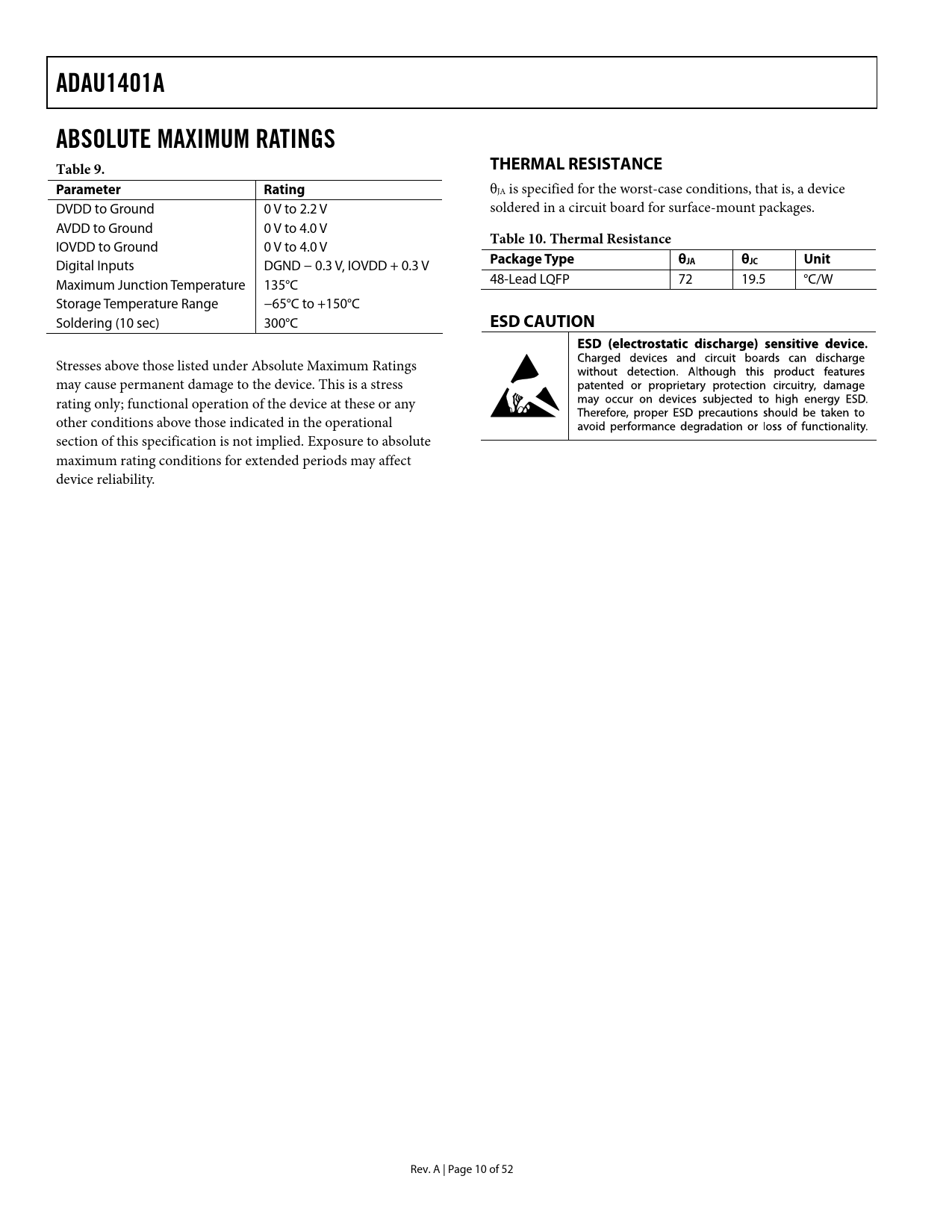 ADAU1401A. ABSOLUTE MAXIMUM RATINGS. THERMAL RESISTANCE. Table 9. Parameter Rating. Table 10. Thermal Resistance. Package Type