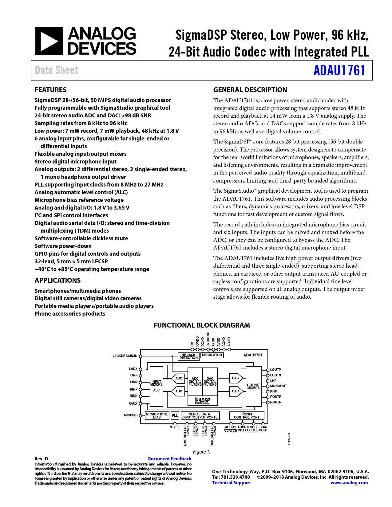 SigmaDSP Stereo, Low Power, 96 kHz,. 24-Bit Audio Codec with Integrated PLL. Data Sheet. ADAU1761. FEATURES. GENERAL DESCRIPTION