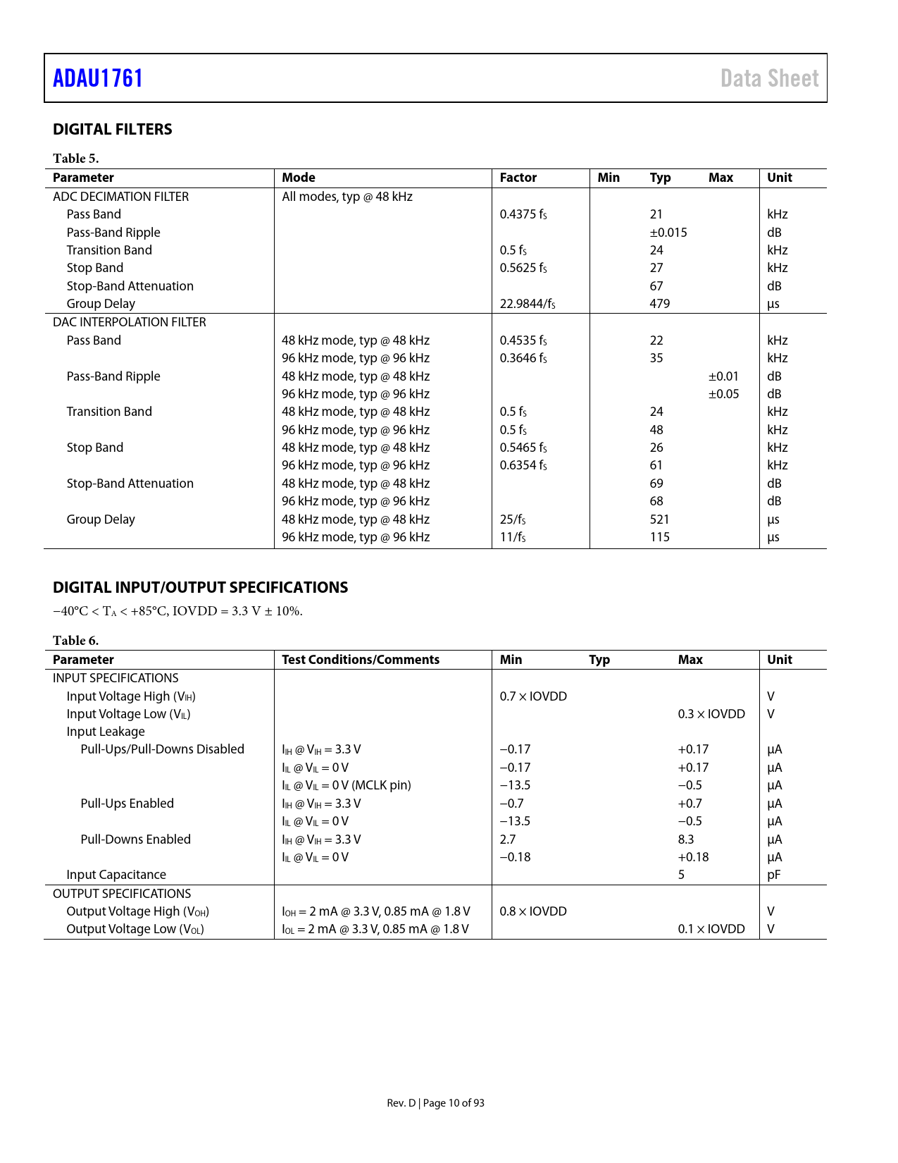 ADAU1761. Data Sheet. DIGITAL FILTERS. Table 5. Parameter. Mode. Factor. Min. Typ. Max. Unit. DIGITAL INPUT/OUTPUT SPECIFICATIONS
