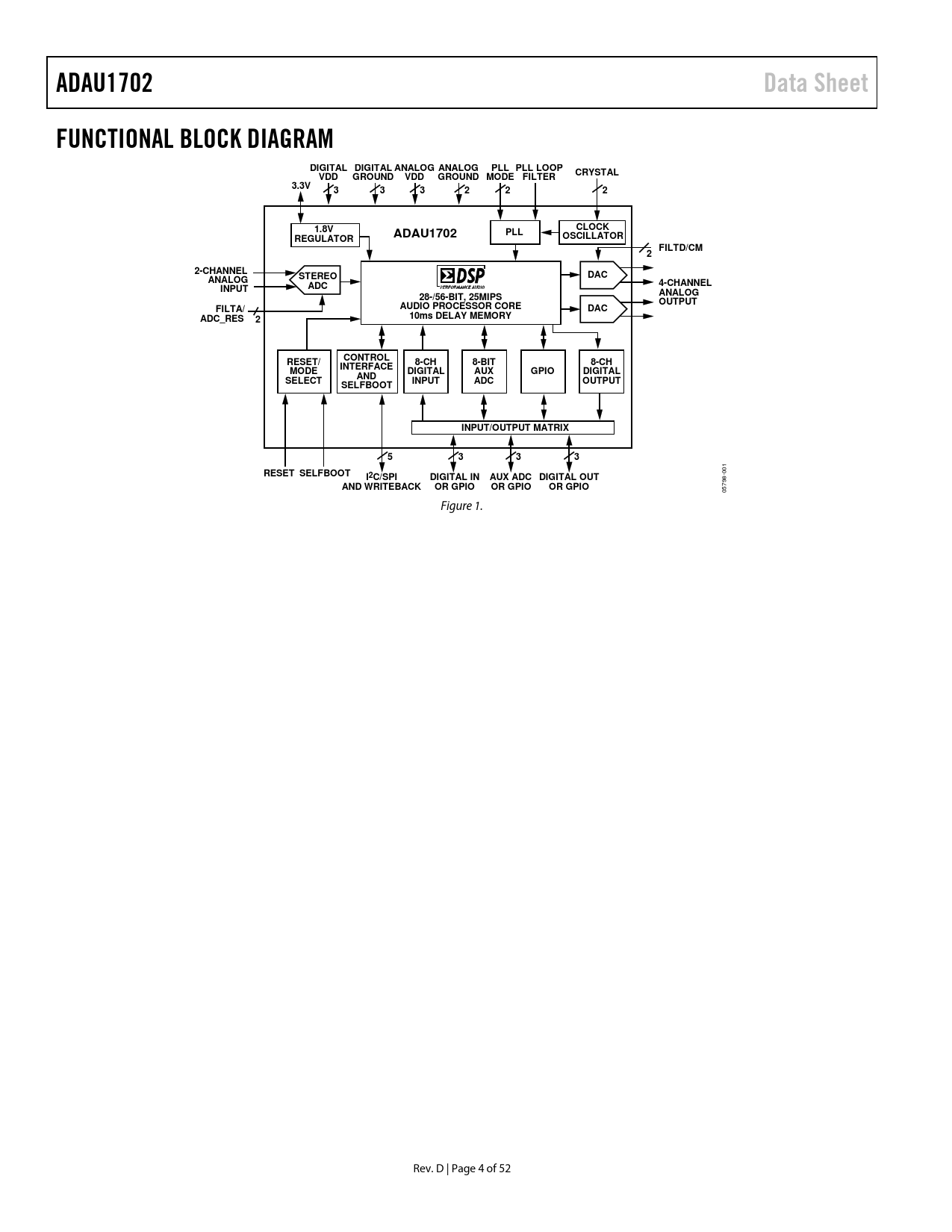 ADAU1702Data SheetFUNCTIONAL BLOCK DIAGRAMDIGITAL DIGITAL ANALOG ANALOGPLL PLL LOOPCRYSTALVDDGROUNDVDDGROUND MODE FILTER3.3V3332221.8VCLOCKPLLADAU1702REGULATOROSCILLATORFILTD/CM22-CHANNELDACANALOGSTEREO4-CHANNELINPUTADCANALOG28-/56-BIT, 25MIPSOUTPUTAUDIO PROCESSOR COREFILTA/DACADC_RES210ms DELAY MEMORYCONTROLRESET/8-CH8-BIT8-CHINTERFACEMODEDIGITALAUXGPIODIGITALANDSELECTINPUTADCOUTPUTSELFBOOTINPUT/OUTPUT MATRIX5333RESET SELFBOOT 001 I2C/SPIDIGITAL INAUX ADC DIGITAL OUTAND WRITEBACKOR GPIOOR GPIOOR GPIO 05798- Figure 1. Rev. D | Page 4 of 52 Document Outline FEATURES APPLICATIONS GENERAL DESCRIPTION TABLE OF CONTENTS REVISION HISTORY FUNCTIONAL BLOCK DIAGRAM SPECIFICATIONS ANALOG PERFORMANCE DIGITAL INPUT/OUTPUT POWER PLL AND OSCILLATOR REGULATOR DIGITAL TIMING SPECIFICATIONS Digital Timing Diagrams ABSOLUTE MAXIMUM RATINGS THERMAL RESISTANCE ESD CAUTION PIN CONFIGURATION AND FUNCTION DESCRIPTIONS TYPICAL PERFORMANCE CHARACTERISTICS SYSTEM BLOCK DIAGRAM THEORY OF OPERATION INITIALIZATION POWER-UP SEQUENCE CONTROL REGISTERS SETUP DSP Core Control Register (Address 2076) DAC Setup Register (Address 2087) RECOMMENDED PROGRAM/PARAMETER LOADING PROCEDURE POWER REDUCTION MODES USING THE OSCILLATOR SETTING MASTER CLOCK/PLL MODE VOLTAGE REGULATOR AUDIO ADCs AUDIO DACs CONTROL PORTS I2C PORT Addressing I2C Read and Write Operations SPI PORT Chip Address R/ Subaddress Data Bytes SELF-BOOT EEPROM Format Writeback SIGNAL PROCESSING NUMERIC FORMATS Numerical Format: 5.23 PROGRAMMING RAMS AND REGISTERS ADDRESS MAPS PARAMETER RAM Direct Read/Write Safeload Write DATA RAM READ/WRITE DATA FORMATS CONTROL REGISTER MAP CONTROL REGISTER DETAILS ADDRESS 2048 TO ADDRESS 2055 (0x0800 TO 0x0807)—INTERFACE REGISTERS ADDRESS 2056 (0x0808)—GPIO PIN SETTING REGISTER ADDRESS 2057 TO ADDRESS 2060 (0x0809 TO 0x080C)—AUXILIARY ADC DATA REGISTERS ADDRESS 2064 TO ADDRESS 2068 (0x0810 TO 0x0814)—SAFELOAD DATA REGISTERS ADDRESS 2069 TO ADDRESS 2073 (0x0815 TO 0x0819)—SAFELOAD ADDRESS REGISTERS ADDRESS 2074 TO ADDRESS 2075 (0x081A TO 0x081B)—DATA CAPTURE REGISTERS ADDRESS 2076 (0x081C)—DSP CORE CONTROL REGISTER ADDRESS 2078 (0x081E)—SERIAL OUTPUT CONTROL REGISTER ADDRESS 2079 (0x081F)—SERIAL INPUT CONTROL REGISTER ADDRESS 2080 TO ADDRESS 2081 (0x0820 TO 0x0821)—MULTIPURPOSE PIN CONFIGURATION REGISTERS ADDRESS 2082 (0x0822)—AUXILIARY ADC AND POWER CONTROL REGISTER ADDRESS 2084 (0x0824)—AUXILIARY ADC ENABLE REGISTER ADDRESS 2086 (0x0826)—OSCILLATOR POWER-DOWN REGISTER ADDRESS 2087 (0x0827)—DAC SETUP MULTIPURPOSE PINS AUXILIARY ADC GENERAL-PURPOSE INPUT/OUTPUT PINS SERIAL DATA INPUT/OUTPUT PORTS LAYOUT RECOMMENDATIONS PARTS PLACEMENT GROUNDING TYPICAL APPLICATION SCHEMATICS SELF-BOOT MODE I2C CONTROL SPI CONTROL OUTLINE DIMENSIONS ORDERING GUIDE