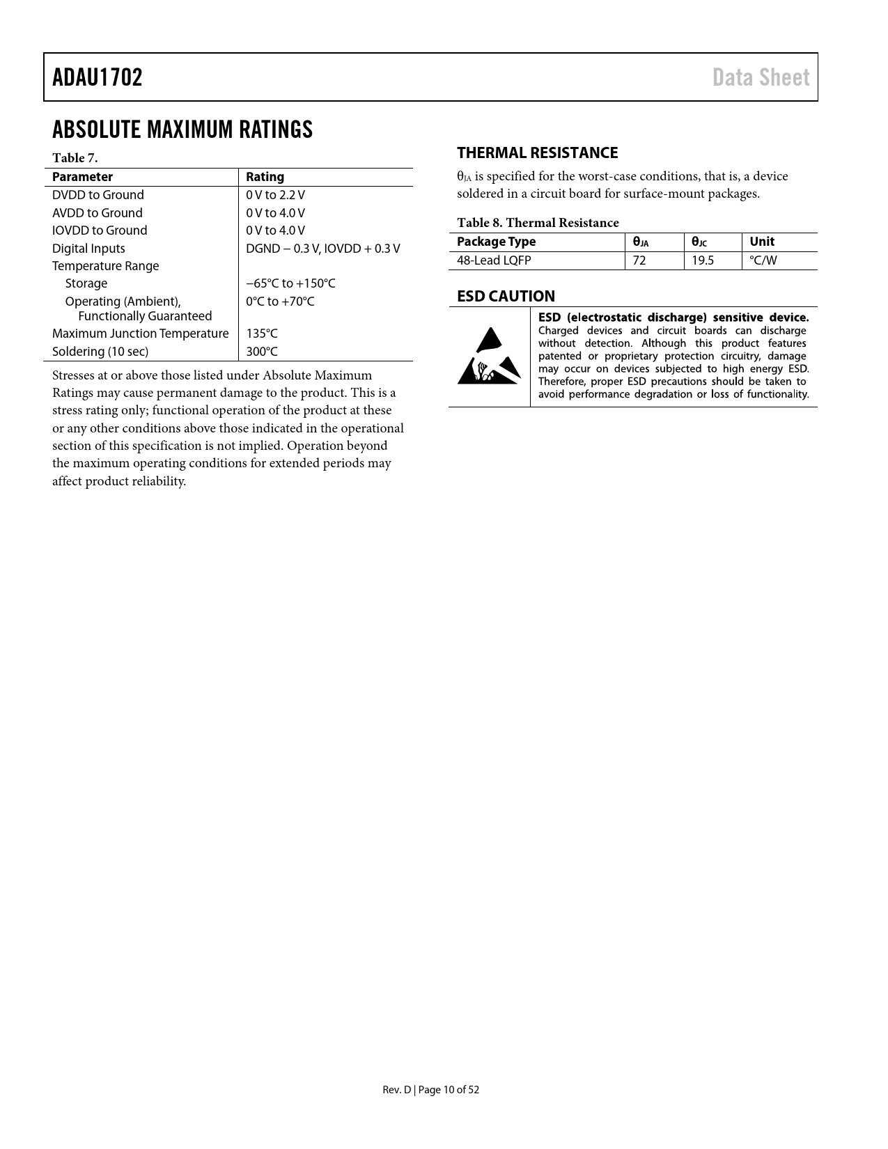 ADAU1702. Data Sheet. ABSOLUTE MAXIMUM RATINGS Table 7. THERMAL RESISTANCE. Parameter. Rating. Table 8. Thermal Resistance