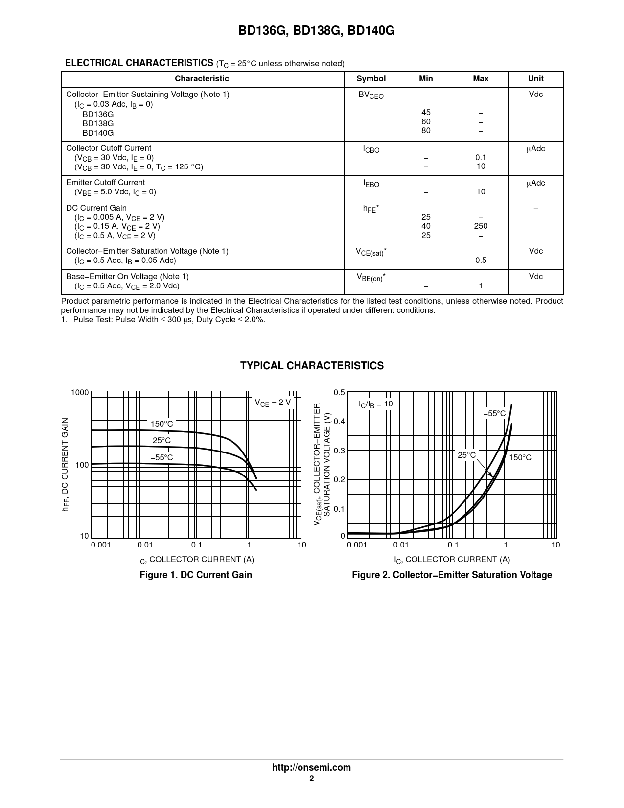 Collector−Emitter Sustaining Voltage (Note 1) BVCEO Vdc (IC = 0.03 Adc, IB = 0) BD136G 45 − BD138G 60 − BD140G 80 − Collector Cutoff Current ICBO mAdc (VCB = 30 Vdc, IE = 0) − 0.1 (VCB = 30 Vdc, IE = 0, TC = 125 _C) − 10 Emitter Cutoff Current IEBO mAdc (VBE = 5.0 Vdc, IC = 0) − 10 DC Current Gain hFE* − (IC = 0.005 A, VCE = 2 V) 25 − (IC = 0.15 A, VCE = 2 V) 40 250 (IC = 0.5 A, VCE = 2 V) 25 − Collector−Emitter Saturation Voltage (Note 1) VCE(sat)* Vdc (IC = 0.5 Adc, IB = 0.05 Adc) − 0.5 Base−Emitter On Voltage (Note 1) VBE(on)* Vdc (IC = 0.5 Adc, VCE = 2.0 Vdc) − 1 Product parametric performance is indicated in the Electrical Characteristics for the listed test conditions, unless otherwise noted. Product performance may not be indicated by the Electrical Characteristics if operated under different conditions. 1. Pulse Test: Pulse Width ≤ 300 ms, Duty Cycle ≤ 2.0%.
