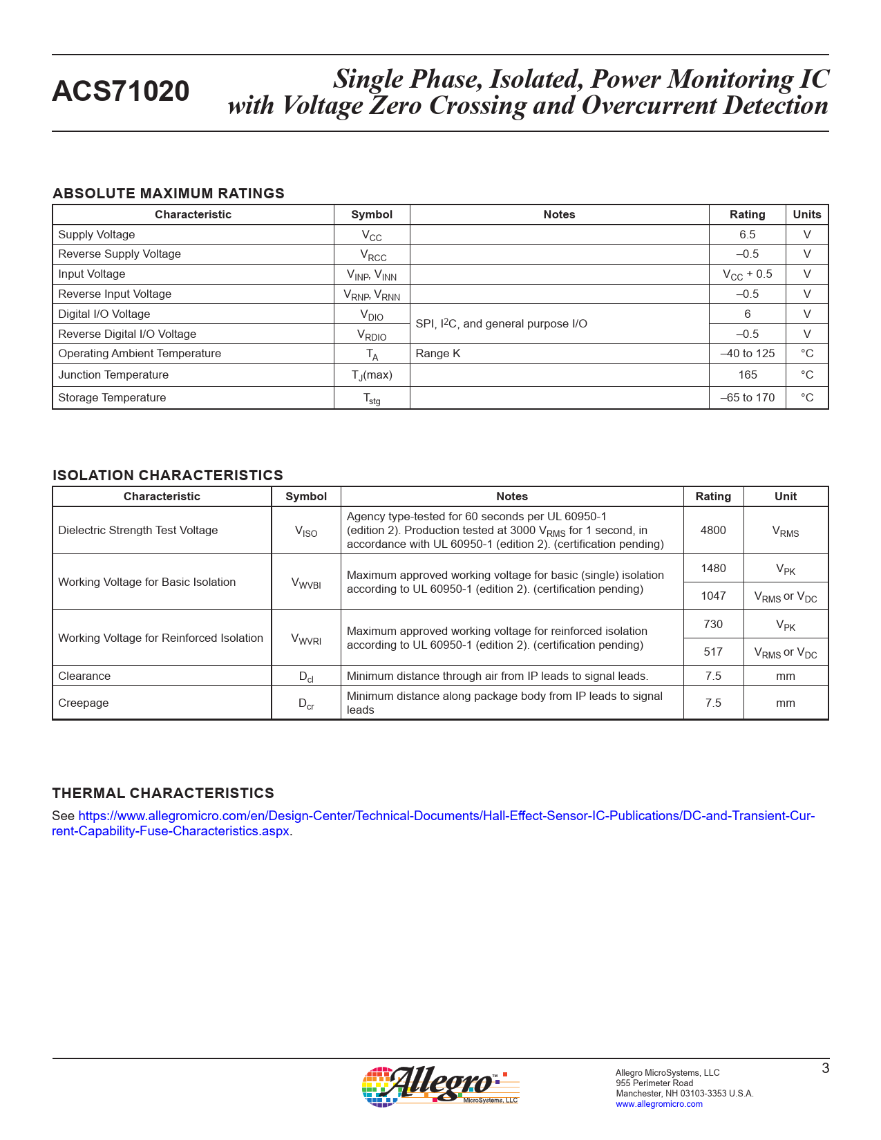 See https://www.allegromicro.com/en/Design-Center/Technical-Documents/Hall-Effect-Sensor-IC-Publications/DC-and-Transient-Cur- rent-Capability-Fuse-Characteristics.aspx. Allegro MicroSystems, LLC 3 955 Perimeter Road Manchester, NH 03103-3353 U.S.A. www.allegromicro.com Document Outline Features and Benefits Description Package Typical Application Selection Guide Absolute Maximum Ratings Isolation Characteristics Thermal Characteristics Functional Block Diagram Pinout Diagram and Terminal List Digital I/O Electrical Characteristics Data Acquisition ADCs Raw Signal Sensitivity and Offset Trim Phase Compensation Zero Crossing Power Calculations Digital Communication Registers and EEPROM EEPROM Error Checking and Correction (ECC) Memory Map Volatile Memory Map Application Connections Recommended PCB Layout Package Outline Drawing