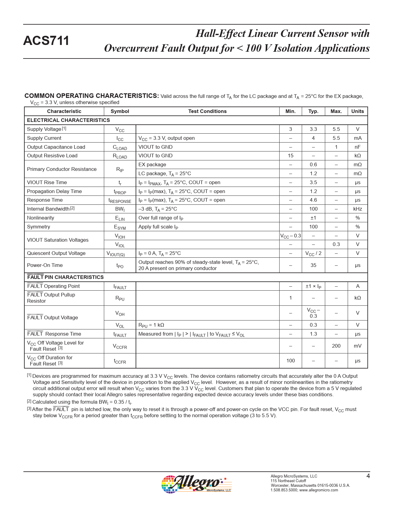 Hall-Effect Linear Current Sensor withACS711Overcurrent Fault Output for < 100 V Isolation ApplicationsCOMMON OPERATING CHARACTERISTICS: Valid across the full range of TA for the LC package and at TA = 25°C for the EX package, VCC = 3.3 V, unless otherwise specified CharacteristicSymbolTest ConditionsMin.Typ.Max.UnitsELECTRICAL CHARACTERISTICS Supply Voltage [1] VCC 3 3.3 5.5 V Supply Current ICC VCC = 3.3 V, output open – 4 5.5 mA Output Capacitance Load CLOAD VIOUT to GND – – 1 nF Output Resistive Load RLOAD VIOUT to GND 15 – – kΩ EX package – 0.6 – mΩ Primary Conductor Resistance RIP LC package, TA = 25°C – 1.2 – mΩ VIOUT Rise Time tr IP = IPMAX, TA = 25°C, COUT = open – 3.5 – μs Propagation Delay Time tPROP IP = IP(max), TA = 25°C, COUT = open – 1.2 – µs Response Time tRESPONSE IP = IP(max), TA = 25°C, COUT = open – 4.6 – µs Internal Bandwidth [2] BWI –3 dB, TA = 25°C – 100 – kHz Nonlinearity ELIN Over full range of IP – ±1 – % Symmetry ESYM Apply full scale IP – 100 – % V VIOUT Saturation Voltages IOH VCC – 0.3 – – V VIOL – – 0.3 V Quiescent Output Voltage VIOUT(Q) IP = 0 A, TA = 25°C – VCC / 2 – V Power-On Time t Output reaches 90% of steady-state level, TA = 25°C, PO 20 A present on primary conductor – 35 – μs ¯F ¯A ¯U ¯L¯ ¯T PIN CHARACTERISTICS ¯F ¯A ¯U ¯L ¯T Operating Point IFAULT – ±1 × IP – A ¯F ¯A ¯U ¯L ¯T Output Pullup Resistor RPU 1 – – kΩ V ¯F ¯A ¯U ¯L ¯T Output Voltage OH – VCC – 0.3 – V VOL RPU = 1 kΩ – 0.3 – V ¯F ¯A ¯U ¯L ¯T Response Time tFAULT Measured from | IP | > | IFAULT | to VFAULT ≤ VOL – 1.3 – µs VCC Off Voltage Level for Fault Reset [3] VCCFR – – 200 mV VCC Off Duration for Fault Reset [3] tCCFR 100 – – µs [1] Devices are programmed for maximum accuracy at 3.3 V VCC levels. The device contains ratiometry circuits that accurately alter the 0 A Output Voltage and Sensitivity level of the device in proportion to the applied VCC level. However, as a result of minor nonlinearities in the ratiometry circuit additional output error will result when VCC varies from the 3.3 V VCC level. Customers that plan to operate the device from a 5 V regulated supply should contact their local Allegro sales representative regarding expected device accuracy levels under these bias conditions. [2] Calculated using the formula BWI = 0.35 / tr. [3] After the ¯F ¯A ¯U ¯L ¯T pin is latched low, the only way to reset it is through a power-off and power-on cycle on the VCC pin. For fault reset, VCC must stay below VCCFR for a period greater than tCCFR before settling to the normal operation voltage (3 to 5.5 V). Allegro MicroSystems, LLC 4 115 Northeast Cutoff Worcester, Massachusetts 01615-0036 U.S.A. 1.508.853.5000; www.allegromicro.com