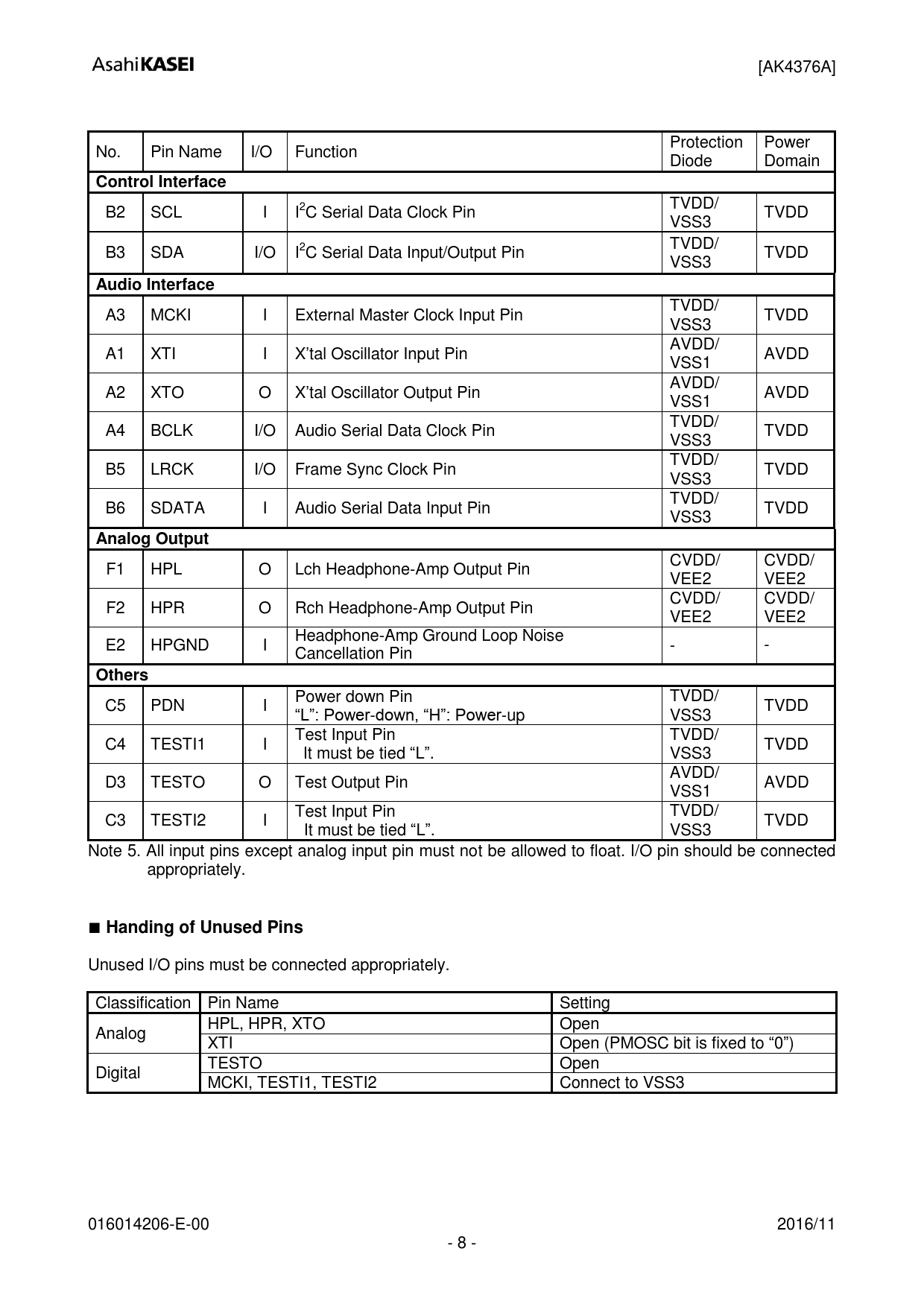 [AK4376A] No. Pin Name I/O Protection Diode Function Power Domain Control Interface TVDD/ VSS3 TVDD/ VSS3 I2C Serial Data Clock Pin B2 SCL I B3 SDA I/O I2C Serial Data Input/Output Pin TVDD TVDD Audio Interface A3 MCKI I External Master Clock Input Pin A1 XTI I X’tal Oscillator Input Pin A2 XTO O X’tal Oscillator Output Pin A4 BCLK I/O Audio Serial Data Clock Pin B5 LRCK I/O Frame Sync Clock Pin B6 SDATA I Audio Serial Data Input Pin TVDD/ VSS3 AVDD/ VSS1 AVDD/ VSS1 TVDD/ VSS3 TVDD/ VSS3 TVDD/ VSS3 TVDD AVDD AVDD TVDD TVDD TVDD Analog Output F1 HPL O Lch Headphone-Amp Output Pin F2 HPR O Rch Headphone-Amp Output Pin E2 HPGND I Headphone-Amp Ground Loop Noise Cancellation Pin CVDD/ VEE2 CVDD/ VEE2 CVDD/ VEE2 CVDD/ VEE2 -Others TVDD/ TVDD VSS3 TVDD/ C4 TESTI1 I TVDD VSS3 AVDD/ D3 TESTO O Test Output Pin AVDD VSS1 TVDD/ Test Input Pin C3 TESTI2 I TVDD It must be tied “L”. VSS3 Note 5. All input pins except analog input pin must not be allowed to float. I/O pin should be connected appropriately. C5 PDN I Power down Pin “L”: Power-down, “H”: Power-up Test Input Pin It must be tied “L”. ■ Handing of Unused Pins Unused I/O pins must be connected appropriately. Classification Pin Name HPL, HPR, XTO Analog XTI TESTO Digital MCKI, TESTI1, TESTI2 Setting Open Open (PMOSC bit is fixed to “0”) Open Connect to VSS3 016014206-E-00 2016/11 -8-