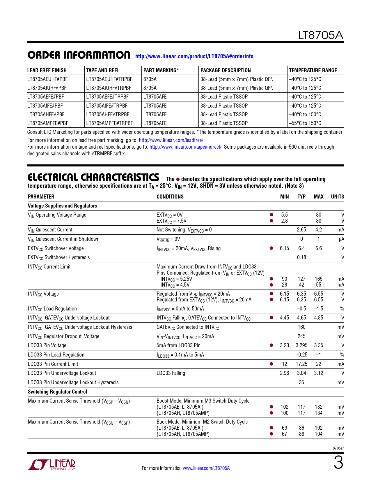 LT8705A orDer inForMaTion http://www.linear.com/product/LT8705A#orderinfoLEAD FREE FINISHTAPE AND REELPART MARKING*PACKAGE DESCRIPTIONTEMPERATURE RANGE LT8705AEUHF#PBF LT8705AEUHF#TRPBF 8705A 38-Lead (5mm × 7mm) Plastic QFN –40°C to 125°C LT8705AIUHF#PBF LT8705AIUHF#TRPBF 8705A 38-Lead (5mm × 7mm) Plastic QFN –40°C to 125°C LT8705AEFE#PBF LT8705AEFE#TRPBF LT8705AFE 38-Lead Plastic TSSOP –40°C to 125°C LT8705AIFE#PBF LT8705AIFE#TRPBF LT8705AFE 38-Lead Plastic TSSOP –40°C to 125°C LT8705AHFE#PBF LT8705AHFE#TRPBF LT8705AFE 38-Lead Plastic TSSOP –40°C to 150°C LT8705AMPFE#PBF LT8705AMPFE#TRPBF LT8705AFE 38-Lead Plastic TSSOP –55°C to 150°C Consult LTC Marketing for parts specified with wider operating temperature ranges. *The temperature grade is identified by a label on the shipping container. For more information on lead free part marking, go to: http://www.linear.com/leadfree/ For more information on tape and reel specifications, go to: http://www.linear.com/tapeandreel/. Some packages are available in 500 unit reels through designated sales channels with #TRMPBF suffix. e lecTrical characTerisTics The l denotes the specifications which apply over the full operatingtemperature range, otherwise specifications are at TA = 25°C. VIN = 12V, SHDN = 3V unless otherwise noted. (Note 3) PARAMETERCONDITIONSMINTYPMAXUNITSVoltage Supplies and Regulators VIN Operating Voltage Range EXTVCC = 0V l 5.5 80 V EXTVCC = 7.5V l 2.8 80 V VIN Quiescent Current Not Switching, VEXTVCC = 0 2.65 4.2 mA VIN Quiescent Current in Shutdown VSHDN = 0V 0 1 µA EXTVCC Switchover Voltage IINTVCC = 20mA, VEXTVCC Rising l 6.15 6.4 6.6 V EXTVCC Switchover Hysteresis 0.18 V INTVCC Current Limit Maximum Current Draw from INTVCC and LDO33 Pins Combined. Regulated from VIN or EXTVCC (12V) INTVCC = 5.25V l 90 127 165 mA INTVCC = 4.5V l 28 42 55 mA INTVCC Voltage Regulated from VIN, IINTVCC = 20mA l 6.15 6.35 6.55 V Regulated from EXTVCC (12V), IINTVCC = 20mA l 6.15 6.35 6.55 V INTVCC Load Regulation IINTVCC = 0mA to 50mA –0.5 –1.5 % INTVCC, GATEVCC Undervoltage Lockout INTVCC Falling, GATEVCC Connected to INTVCC l 4.45 4.65 4.85 V INTVCC, GATEVCC Undervoltage Lockout Hysteresis GATEVCC Connected to INTVCC 160 mV INTVCC Regulator Dropout Voltage VIN-VINTVCC, IINTVCC = 20mA 245 mV LDO33 Pin Voltage 5mA from LDO33 Pin l 3.23 3.295 3.35 V LDO33 Pin Load Regulation ILDO33 = 0.1mA to 5mA –0.25 –1 % LDO33 Pin Current Limit l 12 17.25 22 mA LDO33 Pin Undervoltage Lockout LDO33 Falling 2.96 3.04 3.12 V LDO33 Pin Undervoltage Lockout Hysteresis 35 mV Switching Regulator Control Maximum Current Sense Threshold (VCSP – VCSN) Boost Mode, Minimum M3 Switch Duty Cycle (LT8705AE, LT8705AI) l 102 117 132 mV (LT8705AH, LT8705AMP) l 100 117 134 mV Maximum Current Sense Threshold (VCSN – VCSP) Buck Mode, Minimum M2 Switch Duty Cycle (LT8705AE, LT8705AI) l 69 86 102 mV (LT8705AH, LT8705AMP) l 67 86 104 mV 8705af For more information www.linear.com/LT8705A 3 Document Outline Features Description Applications Typical Application Absolute Maximum Ratings Pin Configuration Order Information Electrical Characteristics Typical Performance Characteristics Pin Functions Block Diagram Operation Applications Information Typical Applications Package Description Typical Application Related Parts