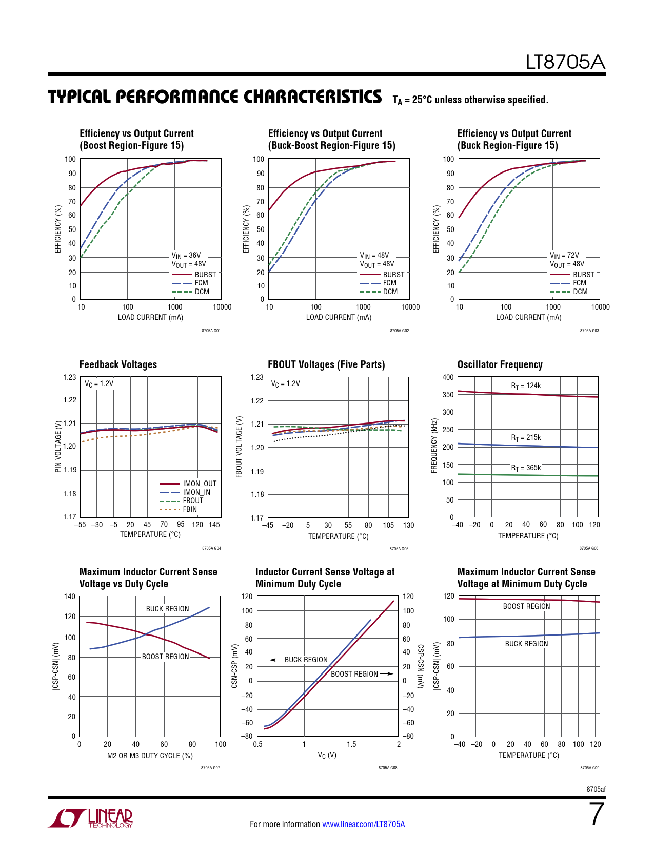 1.23 1.23 400 VC = 1.2V VC = 1.2V RT = 124k 350 1.22 1.22 300 1.21 1.21 250 RT = 215k 1.20 1.20 200 150 PIN VOLTAGE (V) 1.19 FREQUENCY (kHz) RT = 365k FBOUT VOLTAGE (V) 1.19 IMON_OUT 100 1.18 IMON_IN 1.18 FBOUT 50 FBIN 1.17 1.17 0 –55 –30 –5 20 45 70 95 120 145 –45 –20 5 30 55 80 105 130 –40 –20 0 20 40 60 80 100 120 TEMPERATURE (°C) TEMPERATURE (°C) TEMPERATURE (°C) 8705A G04 8705A G05 8705A G06