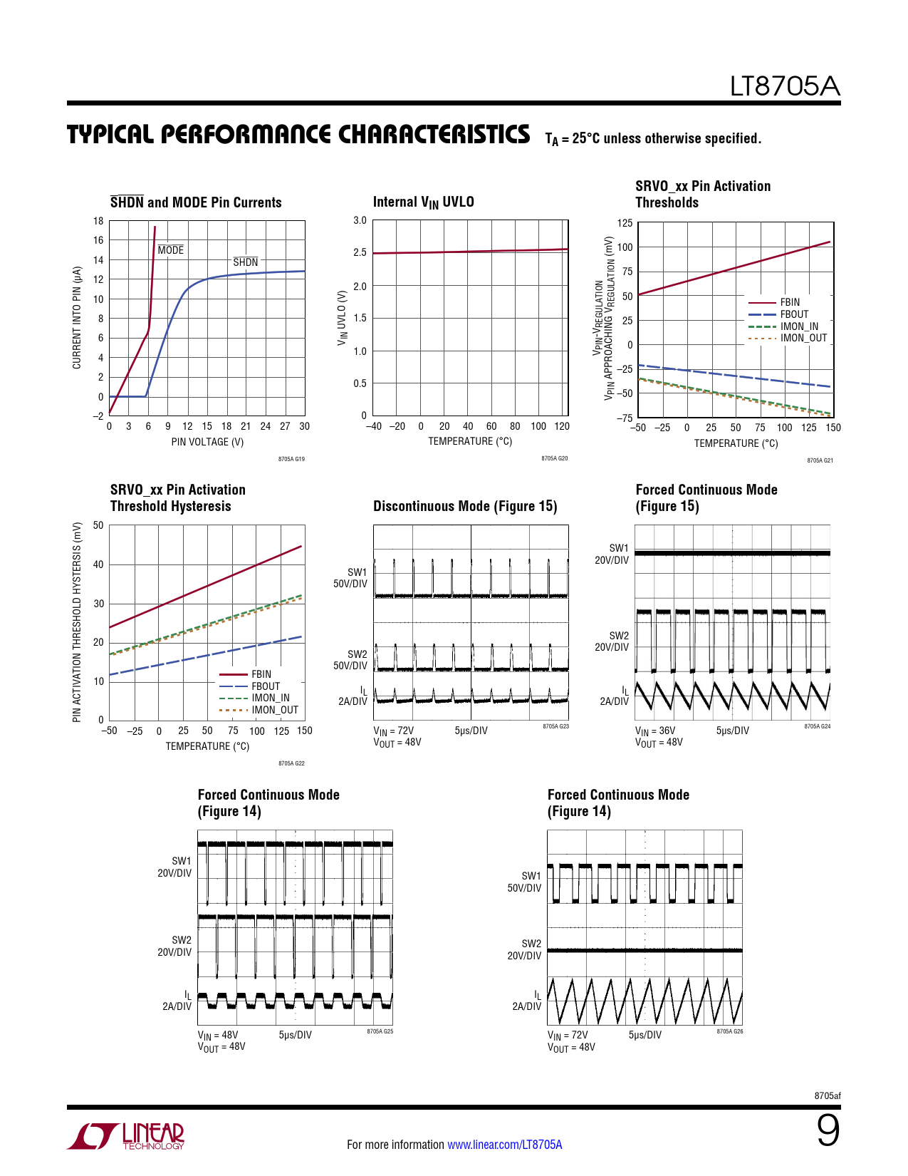50 SW1 40 20V/DIV SW1 50V/DIV 30 SW2 20 20V/DIV SW2 50V/DIV FBIN 10 FBOUT I I IMON_IN L L 2A/DIV 2A/DIV IMON_OUT PIN ACTIVATION THRESHOLD HYSTERSIS (mV) 0–50 –25 0 25 50 75 100 125 150 V 8705A G23 8705A G24 IN = 72V 5µs/DIV VIN = 36V 5µs/DIV TEMPERATURE (°C) VOUT = 48V VOUT = 48V 8705A G22