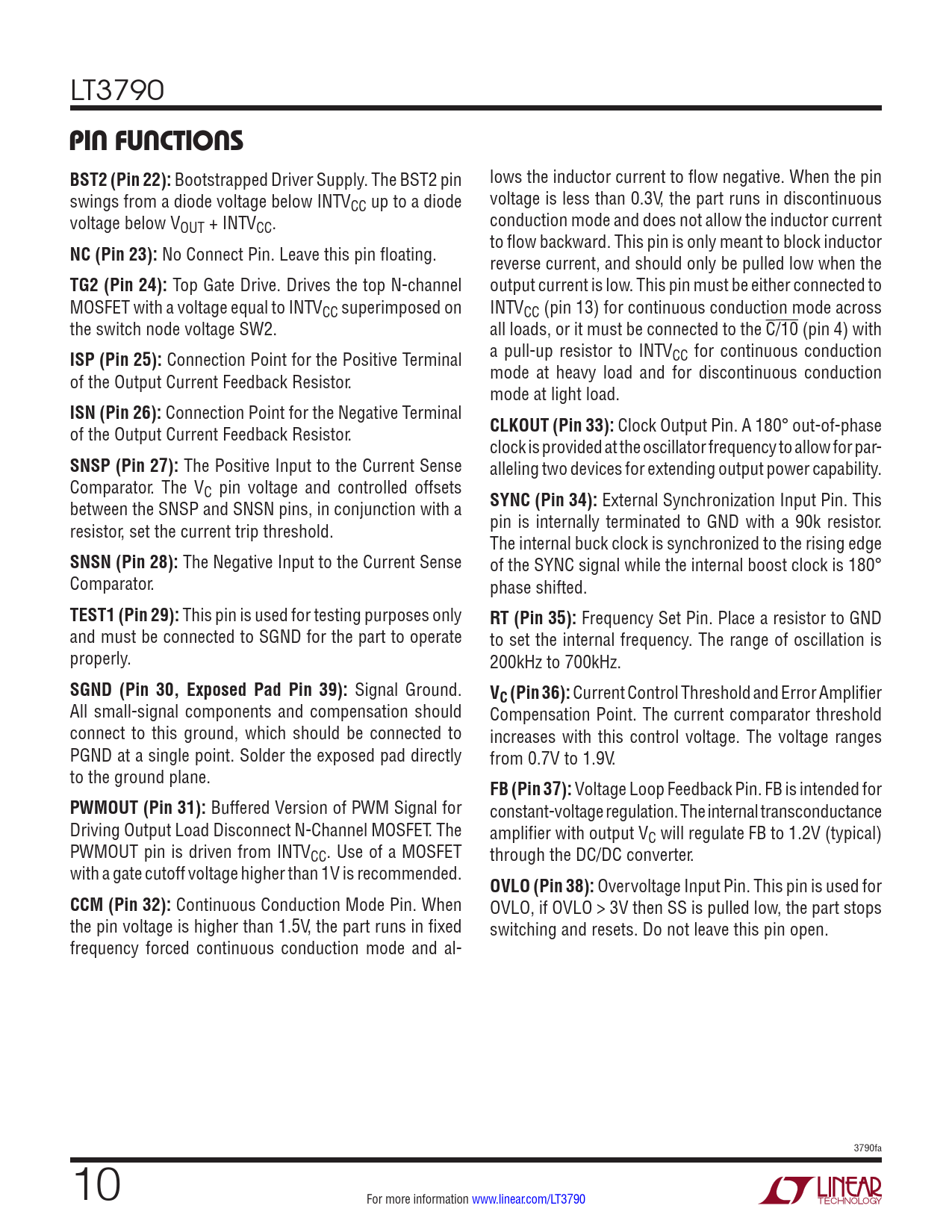 PIN FUNCTIONS. BST2 (Pin 22):. NC (Pin 23):. TG2 (Pin 24):. ISP (Pin 25):. ISN (Pin 26):. CLKOUT (Pin 33):. SNSP (Pin 27):
