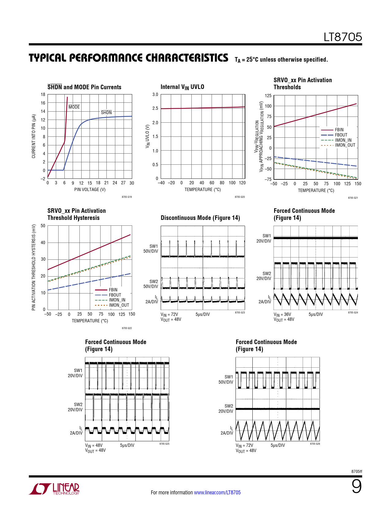 50 SW1 40 20V/DIV SW1 50V/DIV 30 20 SW2 20V/DIV SW2 50V/DIV FBIN 10 FBOUT I I IMON_IN L L 2A/DIV 2A/DIV IMON_OUT PIN ACTIVATION THRESHOLD HYSTERSIS (mV) 0–50 –25 0 25 50 75 100 125 150 V 8705 G23 8705 G24 IN = 72V 5µs/DIV VIN = 36V 5µs/DIV TEMPERATURE (°C) VOUT = 48V VOUT = 48V 8705 G22