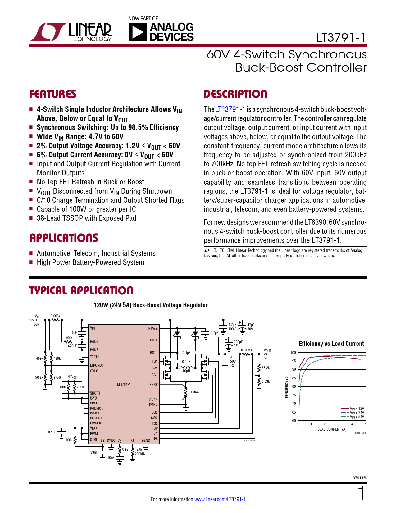 LT3791-1 60V 4-Switch Synchronous Buck-Boost Controller FeaTuresDescripTion n 4-Switch Single Inductor Architecture Allows VIN The LT®3791-1 is a synchronous 4-switch buck-boost volt- Above, Below or Equal to VOUT age/current regulator controller. The controller can regulate n Synchronous Switching: Up to 98.5% Efficiency output voltage, output current, or input current with input n Wide VIN Range: 4.7V to 60V voltages above, below, or equal to the output voltage. The n 2% Output Voltage Accuracy: 1.2V ≤ VOUT < 60V constant-frequency, current mode architecture allows its n 6% Output Current Accuracy: 0V ≤ VOUT < 60V frequency to be adjusted or synchronized from 200kHz n Input and Output Current Regulation with Current to 700kHz. No top FET refresh switching cycle is needed Monitor Outputs in buck or boost operation. With 60V input, 60V output n No Top FET Refresh in Buck or Boost capability and seamless transitions between operating n VOUT Disconnected from VIN During Shutdown regions, the LT3791-1 is ideal for voltage regulator, bat- n C/10 Charge Termination and Output Shorted Flags tery/super-capacitor charger applications in automotive, n Capable of 100W or greater per IC industrial, telecom, and even battery-powered systems. n 38-Lead TSSOP with Exposed Pad For new designs we recommend the LT8390: 60V synchro- nous 4-switch buck-boost controller due to its numerous applicaTions performance improvements over the LT3791-1. L, LT, LTC, LTM, Linear Technology and the Linear logo are registered trademarks of Analog n Automotive, Telecom, Industrial Systems Devices, Inc. All other trademarks are the property of their respective owners. n High Power Battery-Powered System Typical applicaTion120W (24V 5A) Buck-Boost Voltage Regulator VIN 0.003Ω 12V TO 58V + 4.7µF 47µF VIN INTVCC 100V 80V 1µF 4.7µF 50Ω BST2 + IVINN 220µF 470nF 35V Efficiency vs Load Current IVINP 0.015Ω V BST1 0.1µF OUT 100 24V TEST1 499k 499k 4.7µF 5A TG1 0.1µF 50V 95 EN/UVLO ×2 SWI 73.2k 90 OVLO 10µH BG1 56.2k 27.4k INTVCC 85 3.83k LT3791-1 SNSP 100k 200k 80 SHORT 0.004Ω EFFICIENCY (%) 75 C/10 SNSN CCM PGND 70 IVINMON VIN = 12V BG2 65 ISMON VIN = 24V V CLKOUT SW2 IN = 54V 60 PWMOUT TG2 0 1 2 3 4 5 VREF ISP LOAD CURRENT (A) 0.1µF 37911 TA01b PWM ISN 100k CTRL SS SYNC V FB C RT SGND 37911 TA01a 5.1k 147k 33nF 200kHz 10nF 37911fb For more information www.linear.com/LT3791-1 1 Document Outline Features Applications Description Typical Application Absolute Maximum Ratings Pin Configuration Electrical Characteristics Typical Performance Characteristics Pin Functions Block Diagram Operation Applications Information Typical Applications Typical Application Related Parts