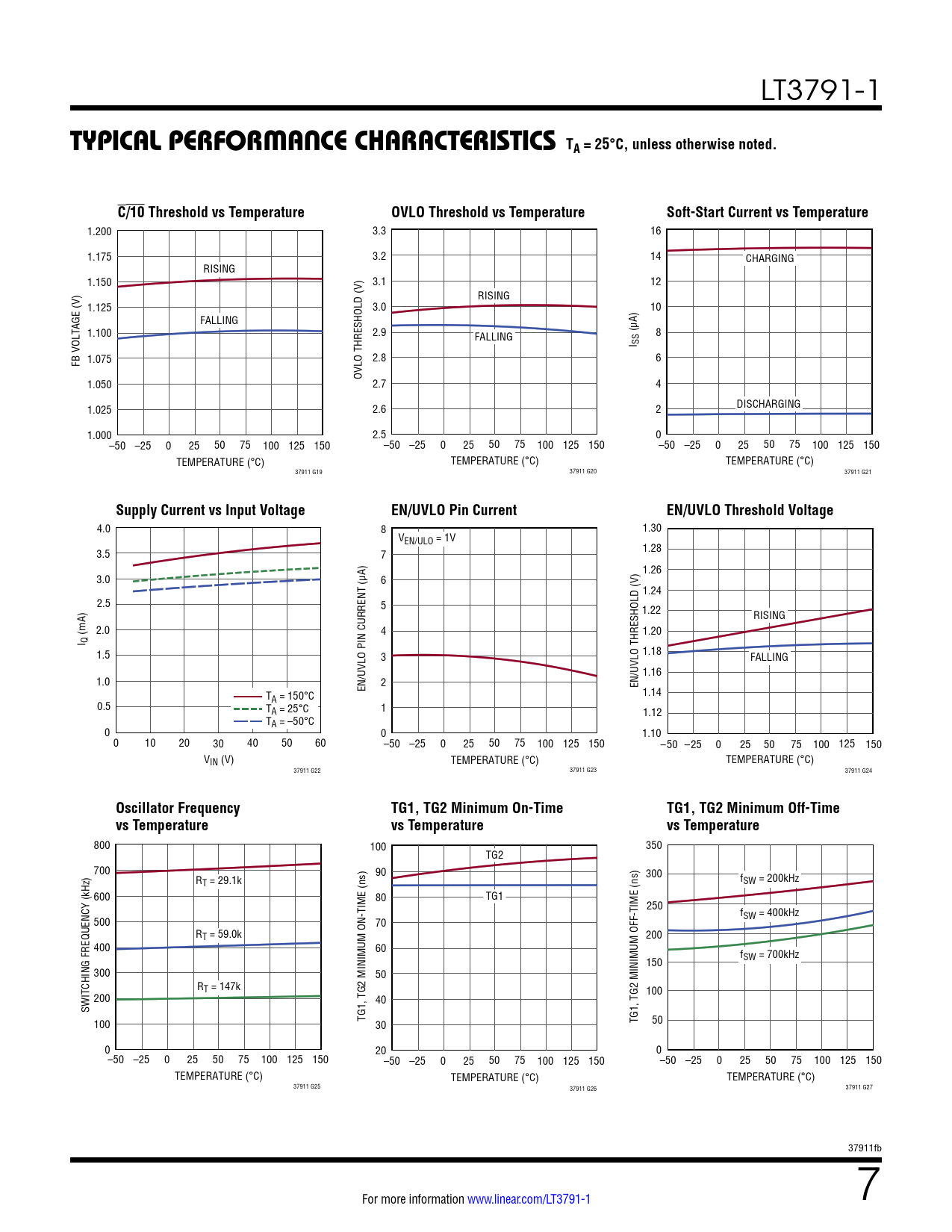 800 100 350 TG2 700 90 R 300 T = 29.1k fSW = 200kHz 600 80 TG1 250 f 500 SW = 400kHz 70 RT = 59.0k 200 400 60 f 150 SW = 700kHz 300 50 RT = 147k 100 200 40 SWITCHING FREQUENCY (kHz) 100 TG1, TG2 MINIMUM ON-TIME (ns) 30 TG1, TG2 MINIMUM OFF-TIME (ns) 50 0 20 0 –50 –25 0 25 50 75 100 125 150 –50 –25 0 25 50 75 100 125 150 –50 –25 0 25 50 75 100 125 150 TEMPERATURE (°C) TEMPERATURE (°C) TEMPERATURE (°C) 37911 G25 37911 G26 37911 G27 37911fb For more information www.linear.com/LT3791-1 7 Document Outline Features Applications Description Typical Application Absolute Maximum Ratings Pin Configuration Electrical Characteristics Typical Performance Characteristics Pin Functions Block Diagram Operation Applications Information Typical Applications Typical Application Related Parts