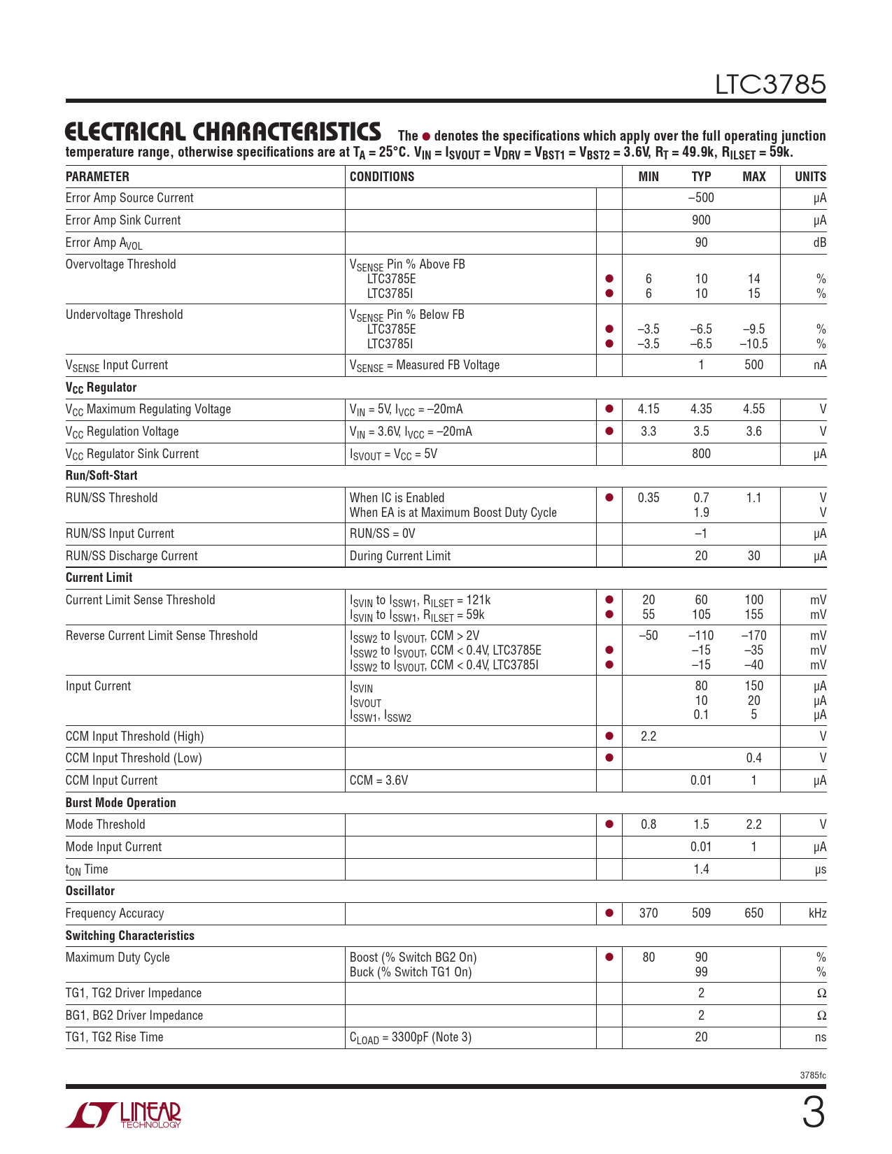 Current Limit Sense Threshold ISVIN to ISSW1, RILSET = 121k l 20 60 100 mV ISVIN to ISSW1, RILSET = 59k l 55 105 155 mV Reverse Current Limit Sense Threshold ISSW2 to ISVOUT, CCM > 2V –50 –110 –170 mV ISSW2 to ISVOUT, CCM < 0.4V, LTC3785E l –15 –35 mV ISSW2 to ISVOUT, CCM < 0.4V, LTC3785I l –15 –40 mV Input Current ISVIN 80 150 µA ISVOUT 10 20 µA ISSW1, ISSW2 0.1 5 µA CCM Input Threshold (High) l 2.2 V CCM Input Threshold (Low) l 0.4 V CCM Input Current CCM = 3.6V 0.01 1 µA