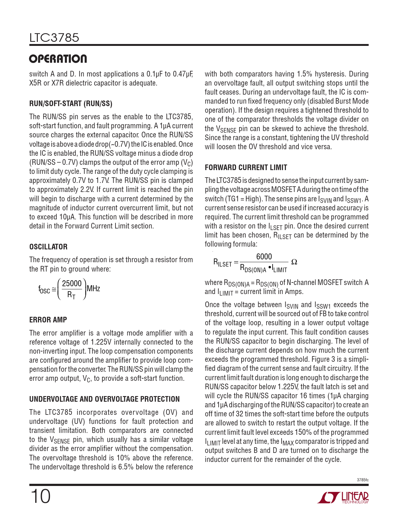 LTC3785 operaTion switch A and D. In most applications a 0.1µF to 0.47µF, with both comparators having 1.5% hysteresis. During X5R or X7R dielectric capacitor is adequate. an overvoltage fault, all output switching stops until the fault ceases. During an undervoltage fault, the IC is com- RUN/SOFT-START (RUN/SS) manded to run fixed frequency only (disabled Burst Mode operation). If the design requires a tightened threshold to The RUN/SS pin serves as the enable to the LTC3785, one of the comparator thresholds the voltage divider on soft-start function, and fault programming. A 1µA current the V source charges the external capacitor. Once the RUN/SS SENSE pin can be skewed to achieve the threshold. Since the range is a constant, tightening the UV threshold voltage is above a diode drop(~0.7V) the IC is enabled. Once will loosen the OV threshold and vice versa. the IC is enabled, the RUN/SS voltage minus a diode drop (RUN/SS – 0.7V) clamps the output of the error amp (VC) to limit duty cycle. The range of the duty cycle clamping is FORWARD CURRENT LIMIT approximately 0.7V to 1.7V. The RUN/SS pin is clamped The LTC3785 is designed to sense the input current by sam- to approximately 2.2V. If current limit is reached the pin pling the voltage across MOSFET A during the on time of the will begin to discharge with a current determined by the switch (TG1 = High). The sense pins are ISVIN and ISSW1. A magnitude of inductor current overcurrent limit, but not current sense resistor can be used if increased accuracy is to exceed 10µA. This function will be described in more required. The current limit threshold can be programmed detail in the Forward Current Limit section. with a resistor on the ILSET pin. Once the desired current limit has been chosen, RILSET can be determined by the OSCILLATOR following formula: The frequency of operation is set through a resistor from 6000 R Ω the RT pin to ground where: ILSET = R DS(ON)A •ILIMIT 25000 where R f ≅ MHz DS(ON)A = RDS(ON) of N-channel MOSFET switch A OSC and ILIMIT = current limit in Amps. RT Once the voltage between ISVIN and ISSW1 exceeds the threshold, current will be sourced out of FB to take control ERROR AMP of the voltage loop, resulting in a lower output voltage The error amplifier is a voltage mode amplifier with a to regulate the input current. This fault condition causes reference voltage of 1.225V internally connected to the the RUN/SS capacitor to begin discharging. The level of non-inverting input. The loop compensation components the discharge current depends on how much the current are configured around the amplifier to provide loop com- exceeds the programmed threshold. Figure 3 is a simpli- pensation for the converter. The RUN/SS pin will clamp the fied diagram of the current sense and fault circuitry. If the error amp output, VC, to provide a soft-start function. current limit fault duration is long enough to discharge the RUN/SS capacitor below 1.225V, the fault latch is set and UNDERVOLTAGE AND OVERVOLTAGE PROTECTION will cycle the RUN/SS capacitor 16 times (1µA charging and 1µA discharging of the RUN/SS capacitor) to create an The LTC3785 incorporates overvoltage (OV) and off time of 32 times the soft-start time before the outputs undervoltage (UV) functions for fault protection and are allowed to switch to restart the output voltage. If the transient limitation. Both comparators are connected current limit fault level exceeds 150% of the programmed to the VSENSE pin, which usually has a similar voltage ILIMIT level at any time, the IMAX comparator is tripped and divider as the error amplifier without the compensation. output switches B and D are turned on to discharge the The overvoltage threshold is 10% above the reference. inductor current for the remainder of the cycle. The undervoltage threshold is 6.5% below the reference 3785fc 0 Document Outline Features Applications Description Typical Application Absolute Maximum Ratings Pin Configuration Order Information Electrical Characteristics Typical Performance Characteristics Pin Functions Block Diagram Operation Applications Information Typical Application Package Description Revision History Typical Application Related Parts