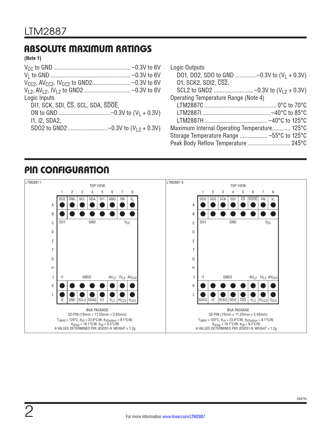 LTM2887 ABSOLUTE MAXIMUM RATINGS(Note 1) VCC to GND .. –0.3V to 6V Logic Outputs VL to GND .. –0.3V to 6V DO1, DO2, SDO to GND ..–0.3V to (VL + 0.3V) VCC2, AVCC2, IVCC2 to GND2... –0.3V to 6V O1, SCK2, SDI2, CS2, VL2, AVL2, IVL2 to GND2 .. –0.3V to 6V SCL2 to GND2 ..–0.3V to (VL2 + 0.3V) Logic Inputs Operating Temperature Range (Note 4) DI1, SCK, SDI, CS, SCL, SDA, SDOE, LTM2887C ... 0°C to 70°C ON to GND ..–0.3V to (VL + 0.3V) LTM2887I ..–40°C to 85°C I1, I2, SDA2, LTM2887H ... –40°C to 125°C SDO2 to GND2 ..–0.3V to (VL2 + 0.3V) Maximum Internal Operating Temperature .. 125°C Storage Temperature Range .. –55°C to 125°C Peak Body Reflow Temperature .. 245°C PIN CONFIGURATION LTM2887-I LTM2887-S TOP VIEW TOP VIEW 1 2 3 4 5 6 7 8 1 2 3 4 5 6 7 8 DO2 DNC SCL SDA DI1 GND ON VL SDO DO2 SCK SDI CS SDOE ON VL A A B B DO1 GND V C CC DO1 GND V C CC D D E E F F G G H H J I1 GND2 AVL2 IVL2 AVCC2 J I1 GND2 AVL2 IVL2 AVCC2 K K L L I2 DNC SCL2 SDA2 O1 VL2 IVCC2 VCC2 SDO2 I2 SCK2 SDI2 CS2 VL2 IVCC2 VCC2 BGA PACKAGE BGA PACKAGE 32-PIN (15mm × 11.25mm × 3.42mm) 32-PIN (15mm × 11.25mm × 3.42mm) TJMAX = 125°C, θJA = 23.9°C/W, θJCbottom = 8.1°C/W, TJMAX = 125°C, θJA = 23.9°C/W, θJCbottom = 8.1°C/W, θJCtop = 18.1°C/W, θJB = 9.3°C/W θJCtop = 18.1°C/W, θJB = 9.3°C/W θ VALUES DETERMINED PER JESD51-9, WEIGHT = 1.2g θ VALUES DETERMINED PER JESD51-9, WEIGHT = 1.2g 2887fb 2 For more information www.linear.com/LTM2887 Document Outline Features Applications Description Typical Application Absolute Maximum Ratings Pin Configuration Product Selection Guide Order Information Electrical Characteristics Switching Characteristics Isolation Characteristics Typical Performance Characteristics Pin Functions Block Diagrams Test Circuits Applications Information Typical Applications Package Description Revision History Typical Application Related Parts