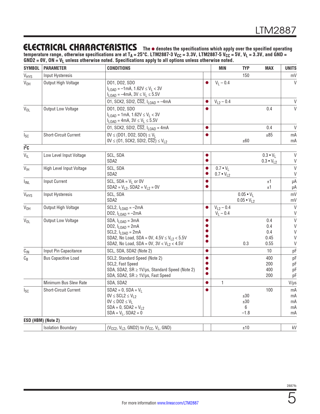 LTM2887 ELECTRICAL CHARACTERISTICSThe l denotes the specifications which apply over the specified operatingtemperature range, otherwise specifications are at TA = 25°C. LTM2887-3 VCC = 3.3V, LTM2887-5 VCC = 5V, VL = 3.3V, and GND =GND2 = 0V, ON = VL unless otherwise noted. Specifications apply to all options unless otherwise noted. SYMBOL PARAMETERCONDITIONSMINTYPMAXUNITS VHYS Input Hysteresis 150 mV VOH Output High Voltage DO1, DO2, SDO l VL – 0.4 V ILOAD = –1mA, 1.62V ≤ VL < 3V ILOAD = –4mA, 3V ≤ VL ≤ 5.5V O1, SCK2, SDI2, CS2, ILOAD = –4mA l VL2 – 0.4 V VOL Output Low Voltage DO1, DO2, SDO l 0.4 V ILOAD = 1mA, 1.62V ≤ VL < 3V ILOAD = 4mA, 3V ≤ VL ≤ 5.5V O1, SCK2, SDI2, CS2, ILOAD = 4mA l 0.4 V ISC Short-Circuit Current 0V ≤ (DO1, DO2, SDO) ≤ VL l ±85 mA 0V ≤ (O1, SCK2, SDI2, CS2) ≤ VL2 ±60 mA I2C VIL Low Level Input Voltage SCL, SDA l 0.3 • VL V SDA2 l 0.3 • VL2 V VIH High Level Input Voltage SCL, SDA l 0.7 • VL V SDA2 l 0.7 • VL2 V IINL Input Current SCL, SDA = VL or 0V l ±1 µA SDA2 = VL2, SDA2 = VL2 = 0V l ±1 µA VHYS Input Hysteresis SCL, SDA 0.05 • VL mV SDA2 0.05 • VL2 mV VOH Output High Voltage SCL2, ILOAD = –2mA l VL2 – 0.4 V DO2, ILOAD = –2mA VL – 0.4 V VOL Output Low Voltage SDA, ILOAD = 3mA l 0.4 V DO2, ILOAD = 2mA l 0.4 V SCL2, ILOAD = 2mA l 0.4 V SDA2, No Load, SDA = 0V, 4.5V ≤ V l L2 < 5.5V 0.45 V SDA2, No Load, SDA = 0V, 3V < V l L2 < 4.5V 0.3 0.55 V CIN Input Pin Capacitance SCL, SDA, SDA2 (Note 2) l 10 pF CB Bus Capacitive Load SCL2, Standard Speed (Note 2) l 400 pF SCL2, Fast Speed l 200 pF SDA, SDA2, SR ≥ 1V/µs, Standard Speed (Note 2) l 400 pF SDA, SDA2, SR ≥ 1V/µs, Fast Speed l 200 pF Minimum Bus Slew Rate SDA, SDA2 l 1 V/µs ISC Short-Circuit Current SDA2 = 0, SDA = VL l 100 mA 0V ≤ SCL2 ≤ VL2 ±30 mA 0V ≤ DO2 ≤ VL ±30 mA SDA = 0, SDA2 = VL2 6 mA SDA = VL, SDA2 = 0 –1.8 mA ESD (HBM) (Note 2) Isolation Boundary (VCC2, VL2, GND2) to (VCC, VL, GND) ±10 kV 2887fb For more information www.linear.com/LTM2887 5 Document Outline Features Applications Description Typical Application Absolute Maximum Ratings Pin Configuration Product Selection Guide Order Information Electrical Characteristics Switching Characteristics Isolation Characteristics Typical Performance Characteristics Pin Functions Block Diagrams Test Circuits Applications Information Typical Applications Package Description Revision History Typical Application Related Parts