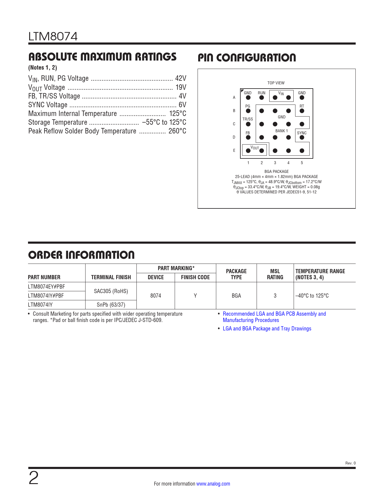 LTM8074 ABSOLUTE MAXIMUM RATINGSPIN CONFIGURATION(Notes 1, 2) VIN, RUN, PG Voltage .. 42V V TOP VIEW OUT Voltage ... 19V FB, TR/SS Voltage ... 4V GND RUN VIN GND A SYNC Voltage .. 6V PG RT Maximum Internal Temperature .. 125°C B GND Storage Temperature .. –55°C to 125°C TR/SS C Peak Reflow Solder Body Temperature ... 260°C BANK 1 FB SYNC D V E OUT 1 2 3 4 5 BGA PACKAGE 25-LEAD (4mm × 4mm × 1.82mm) BGA PACKAGE TJMAX = 125°C, θJA = 48.9°C/W, θJCbottom = 17.2°C/W θJCtop = 33.4°C/W, θJB = 19.4°C/W, WEIGHT = 0.08g θ VALUES DETERMINED PER JEDEC51-9, 51-12 ORDER INFORMATIONPART MARKING*PACKAGEMSLTEMPERATURE RANGEPART NUMBERTERMINAL FINISHDEVICEFINISH CODETYPERATING(NOTES 3, 4) LTM8074EY#PBF SAC305 (RoHS) LTM8074IY#PBF 8074 Y BGA 3 –40°C to 125°C LTM8074IY SnPb (63/37) • Consult Marketing for parts specified with wider operating temperature • Recommended LGA and BGA PCB Assembly and ranges. *Pad or ball finish code is per IPC/JEDEC J-STD-609. Manufacturing Procedures • LGA and BGA Package and Tray Drawings Rev. 0 2 For more information www.analog.com Document Outline Features Applications Typical Application Description Absolute Maximum Ratings Order Information Pin Configuration Electrical Characteristics Typical Performance Characteristics Pin Functions Block Diagram Operation Applications Information Package Photo Package Description Typical Application Related Parts
