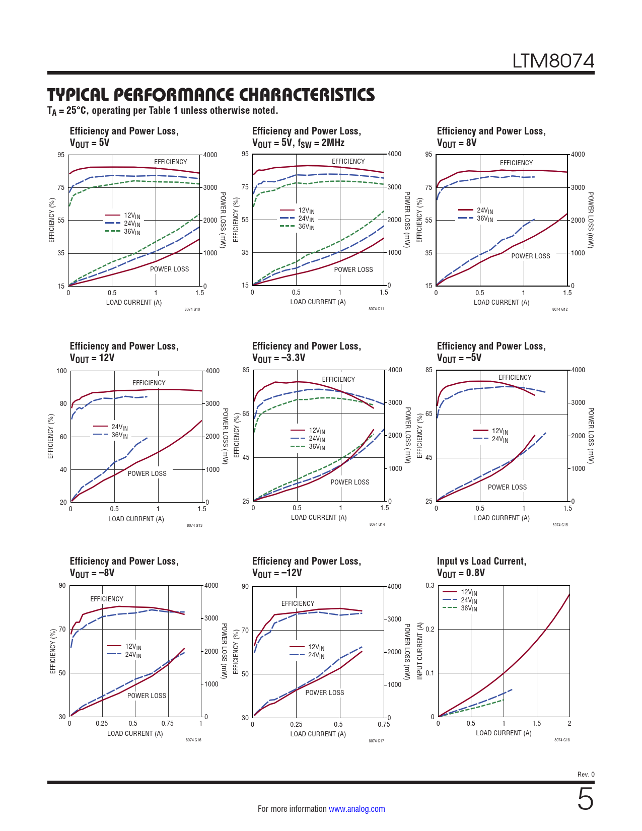 LTM8074 TYPICAL PERFORMANCE CHARACTERISTICSTA = 25°C, operating per Table 1 unless otherwise noted.Efficiency and Power Loss,Efficiency and Power Loss,Efficiency and Power Loss,VOUT = 5VVOUT = 5V, fSW = 2MHzVOUT = 8V 95 4000 95 4000 95 4000 EFFICIENCY EFFICIENCY EFFICIENCY 75 3000 POWER LOSS (mW) 75 3000 POWER LOSS (mW) 75 3000 POWER LOSS (mW) 12V 24V 12V IN IN IN 55 55 24V 36V 24V 2000 IN 2000 55 IN 2000 IN 36V 36V IN IN EFFICIENCY (%) EFFICIENCY (%) EFFICIENCY (%) 35 1000 35 1000 35 POWER LOSS 1000 POWER LOSS POWER LOSS 15 0 15 0 15 0 0 0.5 1 1.5 0 0.5 1 1.5 0 0.5 1 1.5 LOAD CURRENT (A) LOAD CURRENT (A) LOAD CURRENT (A) 8074 G10 8074 G11 8074 G12 Efficiency and Power Loss,Efficiency and Power Loss,Efficiency and Power Loss,VOUT = 12VVOUT = –3.3VVOUT = –5V 100 4000 85 4000 85 4000 EFFICIENCY EFFICIENCY EFFICIENCY 80 3000 POWER LOSS (mW) 3000 POWER LOSS (mW) 3000 POWER LOSS (mW) 65 65 24VIN 36V 12V 12V 60 IN IN IN 2000 24V 2000 2000 IN 24VIN 36VIN EFFICIENCY (%) EFFICIENCY (%) 45 EFFICIENCY (%) 45 40 1000 1000 POWER LOSS 1000 POWER LOSS POWER LOSS 20 0 25 0 25 0 0 0.5 1 1.5 0 0.5 1 1.5 0 0.5 1 1.5 LOAD CURRENT (A) LOAD CURRENT (A) LOAD CURRENT (A) 8074 G13 8074 G14 8074 G15 Efficiency and Power Loss,Efficiency and Power Loss,Input vs Load Current,VOUT = –8VVOUT = –12VVOUT = 0.8V 90 4000 90 4000 0.3 12VIN EFFICIENCY EFFICIENCY 24VIN 36VIN 3000 POWER LOSS (mW) 3000 POWER LOSS (mW) 70 70 0.2 12VIN 12VIN 24V 2000 2000 IN 24VIN EFFICIENCY (%) 50 EFFICIENCY (%) 50 0.1 INPUT CURRENT (A) 1000 1000 POWER LOSS POWER LOSS 30 0 30 0 0 0 0.25 0.5 0.75 1 0 0.25 0.5 0.75 0 0.5 1 1.5 2 LOAD CURRENT (A) LOAD CURRENT (A) LOAD CURRENT (A) 8074 G16 8074 G17 8074 G18 Rev. 0 For more information www.analog.com 5 Document Outline Features Applications Typical Application Description Absolute Maximum Ratings Order Information Pin Configuration Electrical Characteristics Typical Performance Characteristics Pin Functions Block Diagram Operation Applications Information Package Photo Package Description Typical Application Related Parts