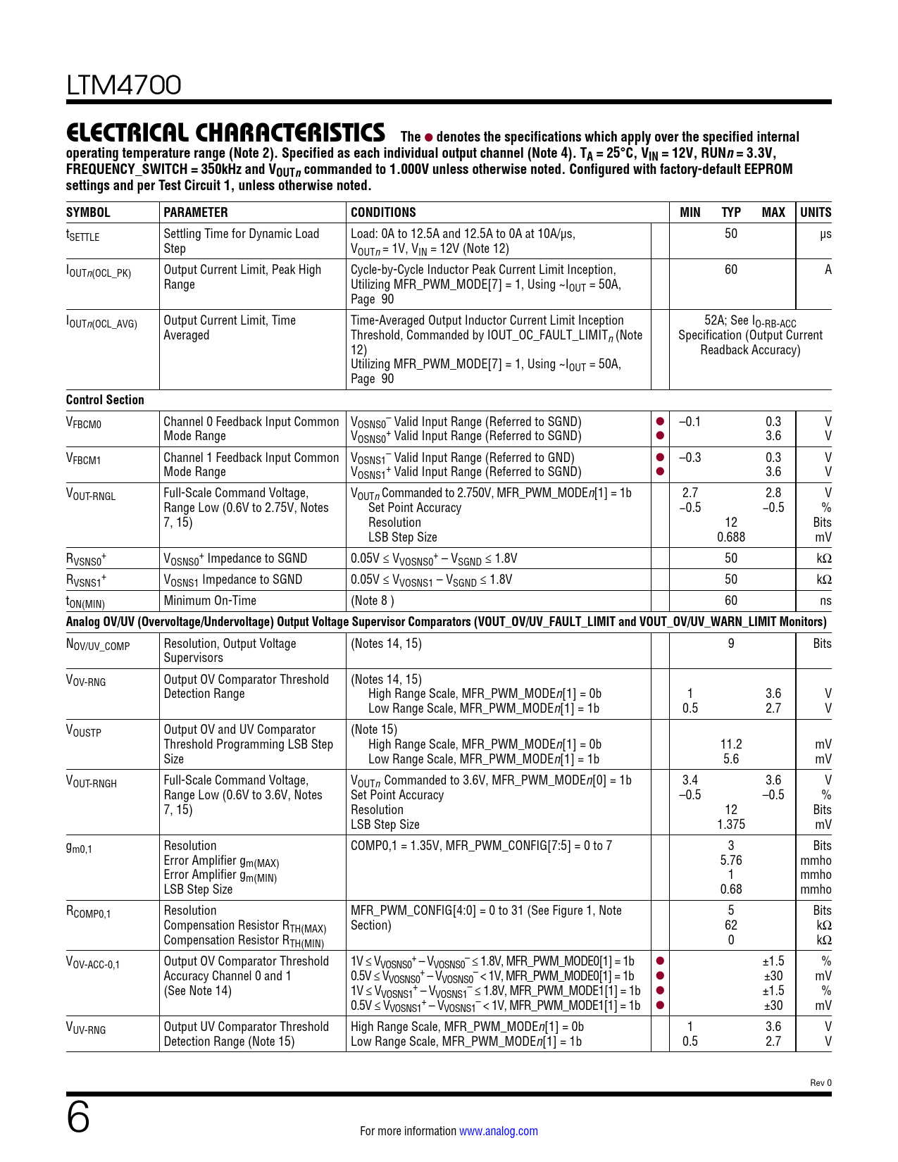 link to page 90 link to page 90 link to page 11 LTM4700 ELECTRICAL CHARACTERISTICSThe l denotes the specifications which apply over the specified internaloperating temperature range (Note 2). Specified as each individual output channel (Note 4). TA = 25°C, VIN = 12V, RUNn= 3.3V,FREQUENCY_SWITCH = 350kHz and VOUTncommanded to 1.000V unless otherwise noted. Configured with factory-default EEPROMsettings and per Test Circuit 1, unless otherwise noted.SYMBOLPARAMETERCONDITIONSMINTYPMAX UNITS tSETTLE Settling Time for Dynamic Load Load: 0A to 12.5A and 12.5A to 0A at 10A/µs, 50 µs Step VOUTn = 1V, VIN = 12V (Note 12) IOUTn(OCL_PK) Output Current Limit, Peak High Cycle-by-Cycle Inductor Peak Current Limit Inception, 60 A Range Utilizing MFR_PWM_MODE[7] = 1, Using ~IOUT = 50A, Page 90 IOUTn(OCL_AVG) Output Current Limit, Time Time-Averaged Output Inductor Current Limit Inception 52A; See IO-RB-ACC Averaged Threshold, Commanded by IOUT_OC_FAULT_LIMITn (Note Specification (Output Current 12) Readback Accuracy) Utilizing MFR_PWM_MODE[7] = 1, Using ~IOUT = 50A, Page 90 Control Section V – FBCM0 Channel 0 Feedback Input Common VOSNS0 Valid Input Range (Referred to SGND) l –0.1 0.3 V Mode Range V + OSNS0 Valid Input Range (Referred to SGND) l 3.6 V V – FBCM1 Channel 1 Feedback Input Common VOSNS1 Valid Input Range (Referred to GND) l –0.3 0.3 V Mode Range V + OSNS1 Valid Input Range (Referred to SGND) l 3.6 V VOUT-RNGL Full-Scale Command Voltage, VOUTn Commanded to 2.750V, MFR_PWM_MODEn[1] = 1b 2.7 2.8 V Range Low (0.6V to 2.75V, Notes Set Point Accuracy −0.5 −0.5 % 7, 15) Resolution 12 Bits LSB Step Size 0.688 mV R + + + VSNS0 VOSNS0 Impedance to SGND 0.05V ≤ VVOSNS0 – VSGND ≤ 1.8V 50 kΩ R + VSNS1 VOSNS1 Impedance to SGND 0.05V ≤ VVOSNS1 – VSGND ≤ 1.8V 50 kΩ tON(MIN) Minimum On-Time (Note 8 ) 60 ns Analog OV/UV (Overvoltage/Undervoltage) Output Voltage Supervisor Comparators (VOUT_OV/UV_FAULT_LIMIT and VOUT_OV/UV_WARN_LIMIT Monitors) NOV/UV_COMP Resolution, Output Voltage (Notes 14, 15) 9 Bits Supervisors VOV-RNG Output OV Comparator Threshold (Notes 14, 15) Detection Range High Range Scale, MFR_PWM_MODEn[1] = 0b 1 3.6 V Low Range Scale, MFR_PWM_MODEn[1] = 1b 0.5 2.7 V VOUSTP Output OV and UV Comparator (Note 15) Threshold Programming LSB Step High Range Scale, MFR_PWM_MODEn[1] = 0b 11.2 mV Size Low Range Scale, MFR_PWM_MODEn[1] = 1b 5.6 mV VOUT-RNGH Full-Scale Command Voltage, VOUTn Commanded to 3.6V, MFR_PWM_MODEn[0] = 1b 3.4 3.6 V Range Low (0.6V to 3.6V, Notes Set Point Accuracy –0.5 –0.5 % 7, 15) Resolution 12 Bits LSB Step Size 1.375 mV gm0,1 Resolution COMP0,1 = 1.35V, MFR_PWM_CONFIG[7:5] = 0 to 7 3 Bits Error Amplifier gm(MAX) 5.76 mmho Error Amplifier gm(MIN) 1 mmho LSB Step Size 0.68 mmho RCOMP0,1 Resolution MFR_PWM_CONFIG[4:0] = 0 to 31 (See Figure 1, Note 5 Bits Compensation Resistor RTH(MAX) Section) 62 kΩ Compensation Resistor RTH(MIN) 0 kΩ V + – OV-ACC-0,1 Output OV Comparator Threshold 1V ≤ VVOSNS0 – VVOSNS0 ≤ 1.8V, MFR_PWM_MODE0[1] = 1b l ±1.5 % Accuracy Channel 0 and 1 0.5V ≤ V + – VOSNS0 – VVOSNS0 < 1V, MFR_PWM_MODE0[1] = 1b l ±30 mV (See Note 14) 1V ≤ V + – VOSNS1 – VVOSNS1 ≤ 1.8V, MFR_PWM_MODE1[1] = 1b l ±1.5 % 0.5V ≤ V + – VOSNS1 – VVOSNS1 < 1V, MFR_PWM_MODE1[1] = 1b l ±30 mV VUV-RNG Output UV Comparator Threshold High Range Scale, MFR_PWM_MODEn[1] = 0b 1 3.6 V Detection Range (Note 15) Low Range Scale, MFR_PWM_MODEn[1] = 1b 0.5 2.7 V Rev 0 6 For more information www.analog.com Document Outline Features Applications Typical Application Description Table of Contents Absolute Maximum Ratings Order Information Pin Configuration Electrical Characteristics Typical Performance Characteristics Pin Functions Simplified Block Diagram Decoupling Requirements Functional Diagram Test Circuits Operation PMBus Command Summary Applications Information Applications Information-Derating Curves Typical Applications PMBus Command Details Package Description Typical Applications Package Photograph Related Parts Features Applications Typical Application Description Table of Contents Absolute Maximum Ratings Order Information Pin Configuration Electrical Characteristics Typical Performance Characteristics Pin Functions Simplified Block Diagram Decoupling Requirements Functional Diagram Test Circuits Operation Power Module Introduction Power Module Overview, Major Features EEPROM with ECC Power-Up and Initialization Soft-Start Time-Based Sequencing Voltage-Based Sequencing Shutdown Light-Load Current Operation Switching Frequency and Phase PWM Loop Compensation Output Voltage Sensing INTVCC and Build-in 5V Bias Converter Output Current Sensing and Sub Milliohm DCR Current Sensing Input Current Sensing PolyPhase Load Sharing External/Internal Temperature Sense RCONFIG (Resistor Configuration) Pins Fault Detection and Handling Status Registers and ALERT Masking Mapping Faults to FAULT Pins Power Good Pins CRC Protection Serial Interface Communication Protection Device Addressing Responses to VOUT and IIN/IOUT Faults Output Overvoltage Fault Response Output Undervoltage Response Peak Output Overcurrent Fault Response Responses to Timing Faults Responses to VIN OV Faults Responses to OT/UT Faults Internal Overtemperature Fault Response External Overtemperature and Undertemperature Fault Response Responses to Input Overcurrent and Output Undercurrent Faults Responses to External Faults Fault Logging Bus Timeout Protection Similarity Between PMBus, SMBus and I2C 2-Wire Interface PMBus Serial Digital Interface Figures 7 to 24 PMBus Protocols PMBus Command Summary PMBus Commands Applications Information VIN to VOUT Step-Down Ratios Input Capacitors Output Capacitors Light Load Current Operation Switching Frequency and Phase Output Current Limit Programming Minimum On-Time Considerations Variable Delay Time, Soft-Start and Output Voltage Ramping Digital Servo Mode Soft Off (Sequenced Off) Undervoltage Lockout Fault Detection and Handling Open-