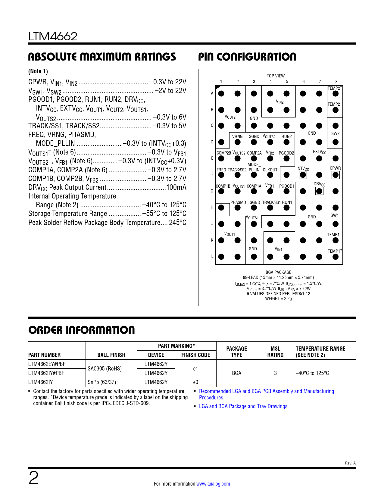 LTM4662 ABSOLUTE MAXIMUM RATINGSPIN CONFIGURATION(Note 1) TOP VIEW CPWR, VIN1, VIN2 ... –0.3V to 22V 1 2 3 4 5 6 7 8 V TEMP2– SW1, VSW2 ... –2V to 22V A PGOOD1, PGOOD2, RUN1, RUN2, DRVCC, VIN2 INTV TEMP2+ CC, EXTVCC, VOUT1, VOUT2, VOUTS1, B VOUTS2 ... –0.3V to 6V VOUT2 GND TRACK/SS1, TRACK/SS2 ... –0.3V to 5V C FREQ, VRNG, PHASMD, – GND SW2 VRNG SGND VOUTS2 RUN2 MODE_PLLIN ... –0.3V to (INTVCC+0.3) D V – OUTS1 (Note 6) ... –0.3V to VFB1 COMP2B VOUTS2 COMP2A V EXTV FB2 PGOOD2 CC V – E OUTS2 , VFB1 (Note 6).. –0.3V to (INTVCC+0.3V) MODE_ COMP1A, COMP2A (Note 6) ... –0.3V to 2.7V FREQ INTV CPWR TRACK/SS2 PLLIN CLKOUT CC COMP1B, COMP2B, V F FB2 .. –0.3V to 2.7V DRV COMP1B V COMP1A V CC Peak Output Current ...100mA OUTS1 FB1 PGOOD1 DRVCC G Internal Operating Temperature Range (Note 2) .. –40°C to 125°C PHASMD SGND TRACK/SS1 RUN1 H Storage Temperature Range .. –55°C to 125°C – SW1 V GND Peak Solder Reflow Package Body Temperature .. 245°C OUTS1 J VOUT1 TEMP1– K GND VIN1 TEMP1+ L BGA PACKAGE 88-LEAD (15mm × 11.25mm × 5.74mm) TJMAX = 125°C, θJA = 7°C/W, θJCbottom = 1.5°C/W, θJCtop = 3.7°C/W, θJB + θBA ≅ 7°C/W θ VALUES DEFINED PER JESD51-12 WEIGHT = 2.2g ORDER INFORMATIONPART MARKING*PACKAGEMSLTEMPERATURE RANGEPART NUMBERBALL FINISHDEVICEFINISH CODETYPERATING(SEE NOTE 2) LTM4662EY#PBF LTM4662Y SAC305 (RoHS) e1 LTM4662IY#PBF LTM4662Y BGA 3 –40°C to 125°C LTM4662IY SnPb (63/37) LTM4662Y e0 • Contact the factory for parts specified with wider operating temperature • Recommended LGA and BGA PCB Assembly and Manufacturing ranges. *Device temperature grade is indicated by a label on the shipping Procedures container. Ball finish code is per IPC/JEDEC J-STD-609. • LGA and BGA Package and Tray Drawings Rev. A 2 For more information www.analog.com Document Outline Operation Applications Information Package Description Package Photo Related Parts Features Applications Typical Application Description Absolute Maximum Ratings Order Information Pin Configuration Electrical Characteristics Typical Performance Characteristics Pin Functions Block Diagram Decoupling Requirements Operation Applications Information Package Description Revision History Package Photo Design Resources Related Parts
