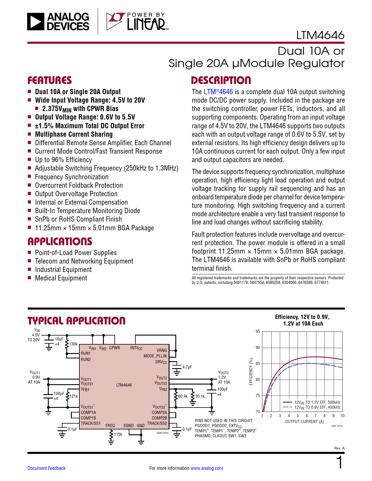 LTM4646 Dual 10A or Single 20A µModule Regulator FEATURESDESCRIPTION n Dual 10A or Single 20A Output The LTM®4646 is a complete dual 10A output switching n Wide Input Voltage Range: 4.5V to 20V mode DC/DC power supply. Included in the package are n 2.375VMIN with CPWR Bias the switching controller, power FETs, inductors, and all n Output Voltage Range: 0.6V to 5.5V supporting components. Operating from an input voltage n ±1.5% Maximum Total DC Output Error range of 4.5V to 20V, the LTM4646 supports two outputs n Multiphase Current Sharing each with an output voltage range of 0.6V to 5.5V, set by n Differential Remote Sense Amplifier, Each Channel external resistors. Its high efficiency design delivers up to n Current Mode Control/Fast Transient Response 10A continuous current for each output. Only a few input n Up to 96% Efficiency and output capacitors are needed. n Adjustable Switching Frequency (250kHz to 1.3MHz) The device supports frequency synchronization, multiphase n Frequency Synchronization operation, high efficiency light load operation and output n Overcurrent Foldback Protection voltage tracking for supply rail sequencing and has an n Output Overvoltage Protection onboard temperature diode per channel for device tempera- n Internal or External Compensation ture monitoring. High switching frequency and a current n Built-In Temperature Monitoring Diode mode architecture enable a very fast transient response to n SnPb or RoHS Compliant Finish line and load changes without sacrificing stability. n 11.25mm × 15mm × 5.01mm BGA Package Fault protection features include overvoltage and overcur- APPLICATIONS rent protection. The power module is offered in a small n Point-of-Load Power Supplies footprint 11.25mm × 15mm × 5.01mm BGA package. n Telecom and Networking Equipment The LTM4646 is available with SnPb or RoHS compliant n Industrial Equipment terminal finish. n All registered trademarks and trademarks are the property of their respective owners. Protected Medical Equipment by U.S. patents, including 5481178, 5847554, 6580258, 6304066, 6476589, 6774611. TYPICAL APPLICATIONEfficiency, 12V to 0.9V,1.2V at 10A Each VIN 95 4.5V TO 20V 10μF ×4 130k VIN1 VIN2 CPWR INTVCC 90 VRNG RUN1 MODE_PLLIN RUN2 DRVCC 85 4.7µF VOUT1 VOUT2 0.9V V V 1.2V OUT1 OUT2 80 AT 10A VOUTS1 VOUTS2 AT 10A LTM4646 EFFICIENCY (%) VFB1 VFB2 100µF 100μF ×4 121k 60.4k 30.1k 75 ×4 12VIN TO 1.2V EFF, 500kHz V – – OUTS1 VOUTS2 12VIN TO 0.9V EFF, 400kHz COMP1A COMP2A 70 COMP1B COMP2B 1 2 3 4 5 6 7 8 9 10 PINS NOT USED IN THIS CIRCUIT: TRACK/SS1 TRACK/SS2 OUTPUT CURRENT (A) FREQ SGND GND PGOOD1, PGOOD2, EXTV 4646 TA01b 0.1µF 0.1µF CC, TEMP1+, TEMP1–, TEMP2+, TEMP2– 4646 TA01a 115k PHASMD, CLKOUT, SW1, SW2 Rev. A Document Feedback For more information www.analog.com 1 Document Outline Operation Applications Information Package Description Package Photo Related Parts Features Applications Typical Application Description Absolute Maximum Ratings Order Information Pin Configuration Electrical Characteristics Typical Performance Characteristics Pin Functions Block Diagram Decoupling Requirements Operation Applications Information Package Description Revision History Package Photo Design Resources Related Parts