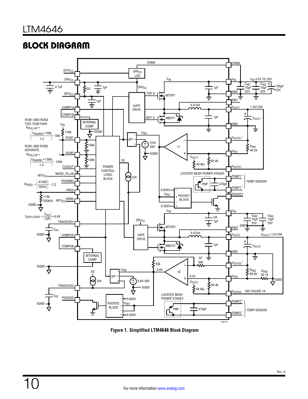 CPWR CPWR EXTVCC DRVCC LDO DRVCC VIN VIN VIN 4.5V TO 20V CIN1 CIN2 + 4.7µF 1µF DRV 2Ω CC 1µF 10µF 10µF 100µF GND 25V 25V 25V INTVCC TOP G MTOP1 1µF SW1 GATE 0.47µH COMP1A V DRIVE OUT1 1.5V/10A COMP1B + BOT G MBOT1 1µF COUT1 RUN1 AND RUN2 TIED TOGETHER: INTERNAL VIN GND COMP RPULLUP = 130k SGND V V IN(MIN) • 50k – 50k – FB1 ( ) RUN1 1.3 – – gm + VOUTS1 + + 0.6V RUN1 AND RUN2 100k – REF ×1 RFB1 SEPARATE: + 40.2k RUN2 V R SGND FB1 PULLUP = VOUT1 VIN(MIN) • 100k 100k SS 60.4k – 100k ( ) 49.9Ω 1.3 CLKOUT POWER VOUTS1 CONTROL MODE_PLLIN INTV LOGIC LOCATED NEAR POWER STAGES CC TEMP1+ BLOCK 1µA PHASMD 41550 TEMP SENSOR RFREQ = – 2.2 PNP 470pF ( ) f(kHz) TEMP1– FREQ 0.645V – VFB1 PGOOD1 115k PGOOD1 VRNG + 350kHz INTV BLOCK CC – SGND 0.555V + VIN VIN tSOFT-START = CSS C8 CIN3 CIN4 (1µA • 0.6V ) DRV 10µF 10µF CC TRACK/SS1 1µF 25V 25V MTOP2 GND SW2 CSS 0.47µH SGND COMP2A GATE VOUT2 VOUT2 1.2V/10A DRIVE + COMP2B MBOT2 1µF COUT2 GND INTERNAL COMP R7 – – 50k 50k VOUTS2 SGND V 0.6V SS – FB2 RFB2 x2 RFB3 60.4k gm + + 0.3V V 30.1k FB2 1µA + + SGND – 0.6V REF VOUT2 TRACK/SS2 60.4k SGND 49.9Ω VOUTS2 SEE FIGURE 18 C LOCATED NEAR SS PGOOD2 – 0.645V POWER STAGES TEMP2+ SGND PGOOD2 VFB1 BLOCK + PNP 470pF – TEMP SENSOR TEMP2– + 0.555V 4646 F01