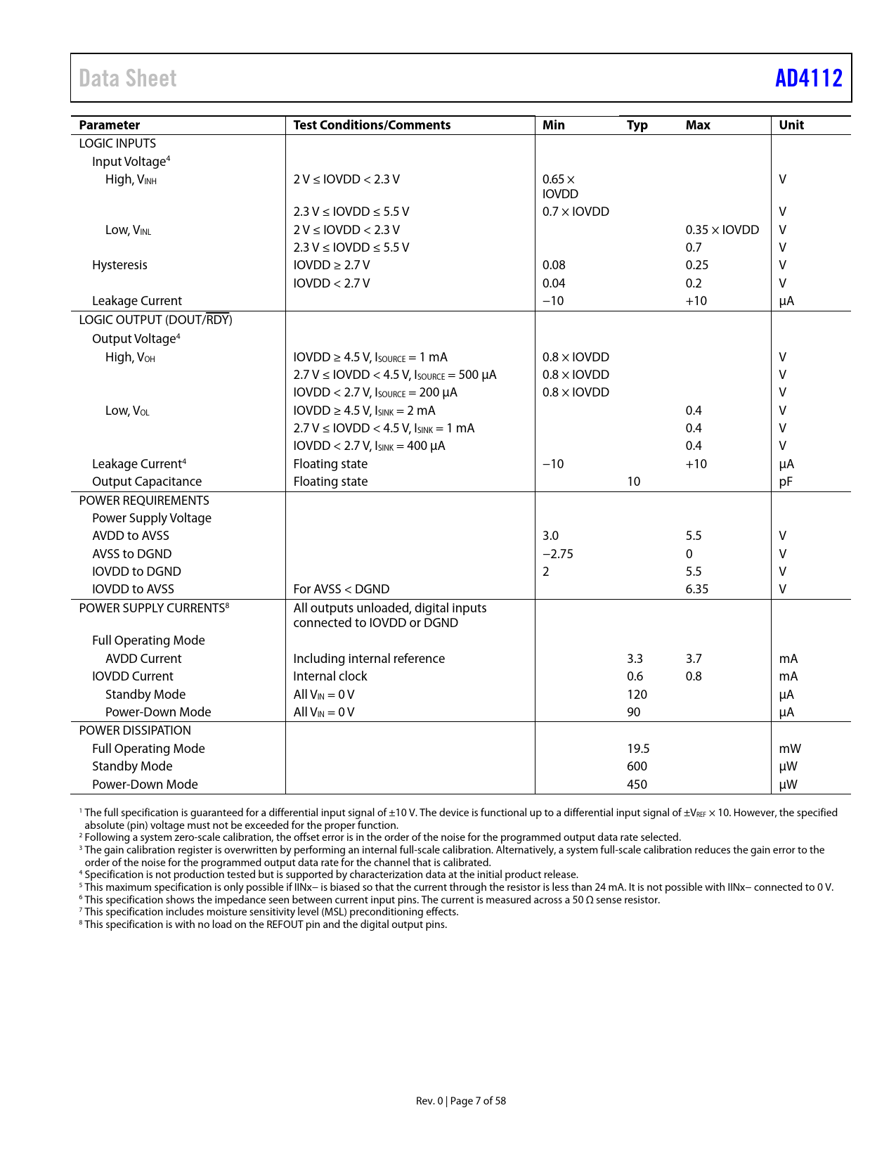 Páginas / Página58 / 7 — Data Sheet. AD4112. Parameter. Test Conditions/Comments. Min. Typ. Max. …