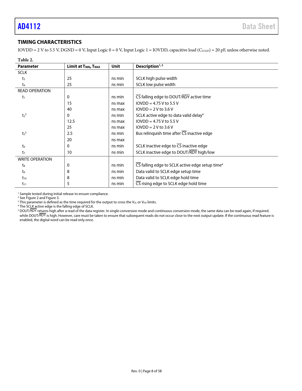 link to page 9 link to page 9 AD4112Data SheetTIMING CHARACTERISTICS IOVDD = 2 V to 5.5 V, DGND = 0 V, Input Logic 0 = 0 V, Input Logic 1 = IOVDD, capacitive load (CLOAD) = 20 pF, unless otherwise noted. Table 2. Parameter LimitatTMIN, TMAXUnitDescription1, 2 SCLK t3 25 ns min SCLK high pulse width t4 25 ns min SCLK low pulse width READ OPERATION t1 0 ns min CS falling edge to DOUT/RDY active time 15 ns max IOVDD = 4.75 V to 5.5 V 40 ns max IOVDD = 2 V to 3.6 V t 3 2 0 ns min SCLK active edge to data valid delay4 12.5 ns max IOVDD = 4.75 V to 5.5 V 25 ns max IOVDD = 2 V to 3.6 V t 5 5 2.5 ns min Bus relinquish time after CS inactive edge 20 ns max t6 0 ns min SCLK inactive edge to CS inactive edge t7 10 ns min SCLK inactive edge to DOUT/RDY high/low WRITE OPERATION t8 0 ns min CS falling edge to SCLK active edge setup time4 t9 8 ns min Data valid to SCLK edge setup time t10 8 ns min Data valid to SCLK edge hold time t11 5 ns min CS rising edge to SCLK edge hold time 1 Sample tested during initial release to ensure compliance. 2 See Figure 2 and Figure 3. 3 This parameter is defined as the time required for the output to cross the VOL or VOH limits. 4 The SCLK active edge is the falling edge of SCLK. 5 DOUT/RDY returns high after a read of the data register. In single-conversion mode and continuous conversion mode, the same data can be read again, if required, while DOUT/RDY is high. However, care must be taken to ensure that subsequent reads do not occur close to the next output update. If the continuous read feature is enabled, the digital word can be read only once. Rev. 0 | Page 8 of 58 Document Outline FEATURES APPLICATIONS GENERAL DESCRIPTION TABLE OF CONTENTS REVISION HISTORY FUNCTIONAL BLOCK DIAGRAM SPECIFICATIONS TIMING CHARACTERISTICS Timing Diagrams ABSOLUTE MAXIMUM RATINGS THERMAL RESISTANCE ESD CAUTION PIN CONFIGURATION AND FUNCTION DESCRIPTIONS TYPICAL PERFORMANCE CHARACTERISTICS NOISE PERFORMANCE AND RESOLUTION THEORY OF OPERATION POWER SUPPLIES Single-Supply Operation (AVSS = DGND) DIGITAL COMMUNICATION AD4112 RESET CONFIGURATION OVERVIEW Channel Configuration Channel Registers ADC Setups Setup Configuration Registers Filter Configuration Registers Gain Registers Offset Registers ADC Mode and Interface Mode Configuration ADC Mode Register Interface Mode Register CIRCUIT DESCRIPTION MULTIPLEXER CURRENT INPUTS VOLTAGE INPUTS Fully Differential Inputs Single-Ended Inputs Adjusting Voltage Input Gain AD4112 REFERENCE Internal Reference External Reference BUFFERED REFERENCE INPUT CLOCK SOURCE Internal Oscillator External Crystal External Clock DIGITAL FILTER SINC5 + SINC1 FILTER SINC3 FILTER SINGLE CYCLE SETTLING ENHANCED 50 Hz AND 60 Hz REJECTION FILTERS OPERATING MODES CONTINUOUS CONVERSION MODE CONTINUOUS READ MODE SINGLE CONVERSION MODE STANDBY AND POWER-DOWN MODES CALIBRATION DIGITAL INTERFACE CHECKSUM PROTECTION CRC CALCULATION Polynomial Example of a Polynomial CRC Calculation—24-Bit Word: 0x654321 (Eight Command Bits and 16-Bit Data) XOR Calculation Example of an XOR Calculation—24-Bit Word: 0x654321 (Eight Command Bits and 16-Bit Data) INTEGRATED FUNCTIONS GENERAL-PURPOSE OUPUTS DELAY 16-BIT/24-BIT CONVERSIONS DOUT_RESET SYNCHRONIZATION Normal Synchronization Alternate Synchronization ERROR FLAGS ADC_ERROR CRC_ERROR REG_ERROR ERRORB Input/Output DATA_STAT IOSTRENGTH INTERNAL TEMPERATURE SENSOR APPLICATIONS INFORMATION GROUNDING AND LAYOUT REGISTER SUMMARY REGISTER DETAILS COMMUNICATIONS REGISTER STATUS REGISTER ADC MODE REGISTER INTERFACE MODE REGISTER REGISTER CHECK DATA REGISTER GPIO CONFIGURATION REGISTER ID REGISTER CHANNEL REGISTER 0 CHANNEL REGISTER 1 TO CHANNEL REGISTER 15 SETUP CONFIGURATION REGISTER 0 SETUP CONFIGURATION REGISTER 1 TO SETUP CONFIGURATION REGISTER 7 FILTER CONFIGURATION REGISTER 0 FILTER CONFIGURATION REGISTER 1 TO FILTER CONFIGURATION REGISTER 7 OFFSET REGISTER 0 OFFSET REGISTER 1 TO OFFSET REGISTER 7 GAIN REGISTER 0 GAIN REGISTER 1 TO GAIN REGISTER 7 OUTLINE DIMENSIONS ORDERING GUIDE