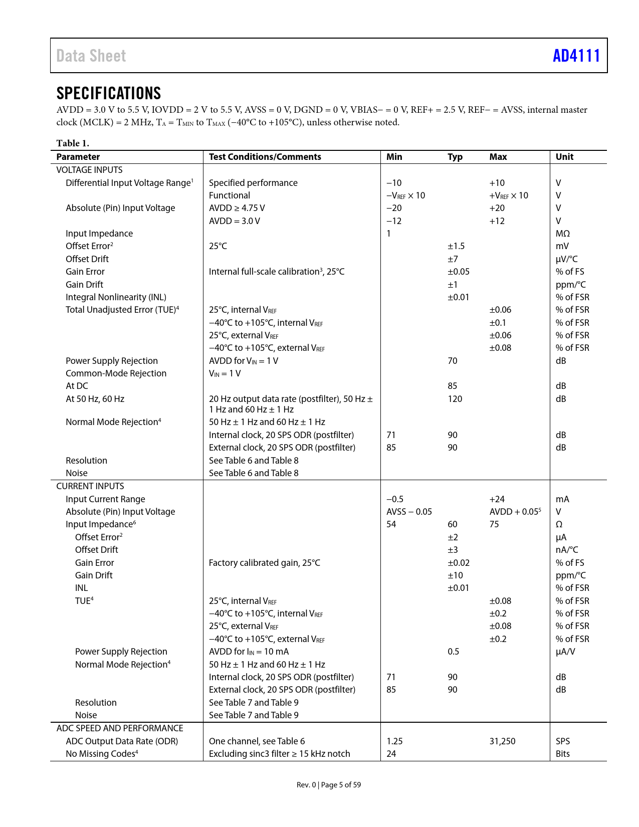 Páginas / Página59 / 5 — Data Sheet. AD4111. SPECIFICATIONS. Table 1. Parameter. Test …
