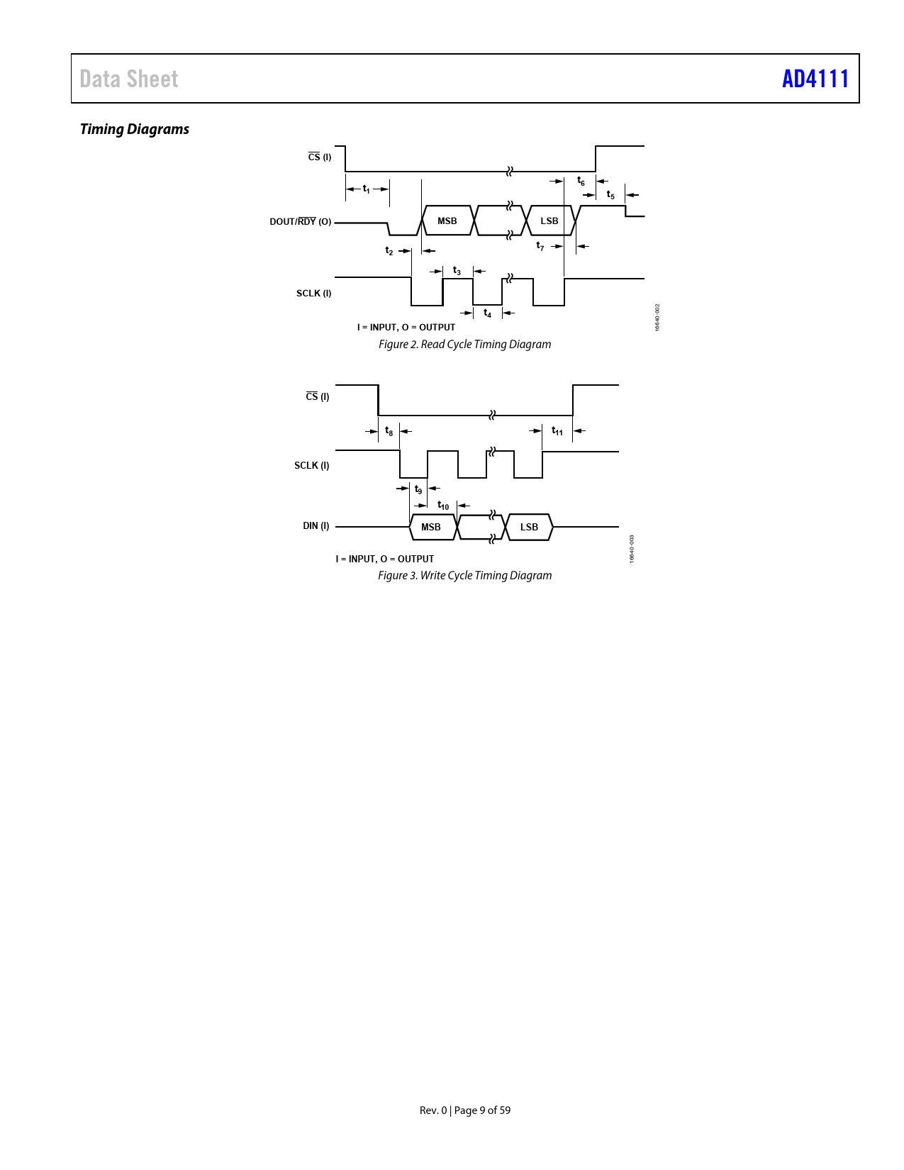 Data Sheet. AD4111. Timing Diagrams. CS (I). DOUT/RDY (O). MSB. LSB. SCLK (I). I = INPUT, O = OUTPUT. t11. t10. DIN (I)