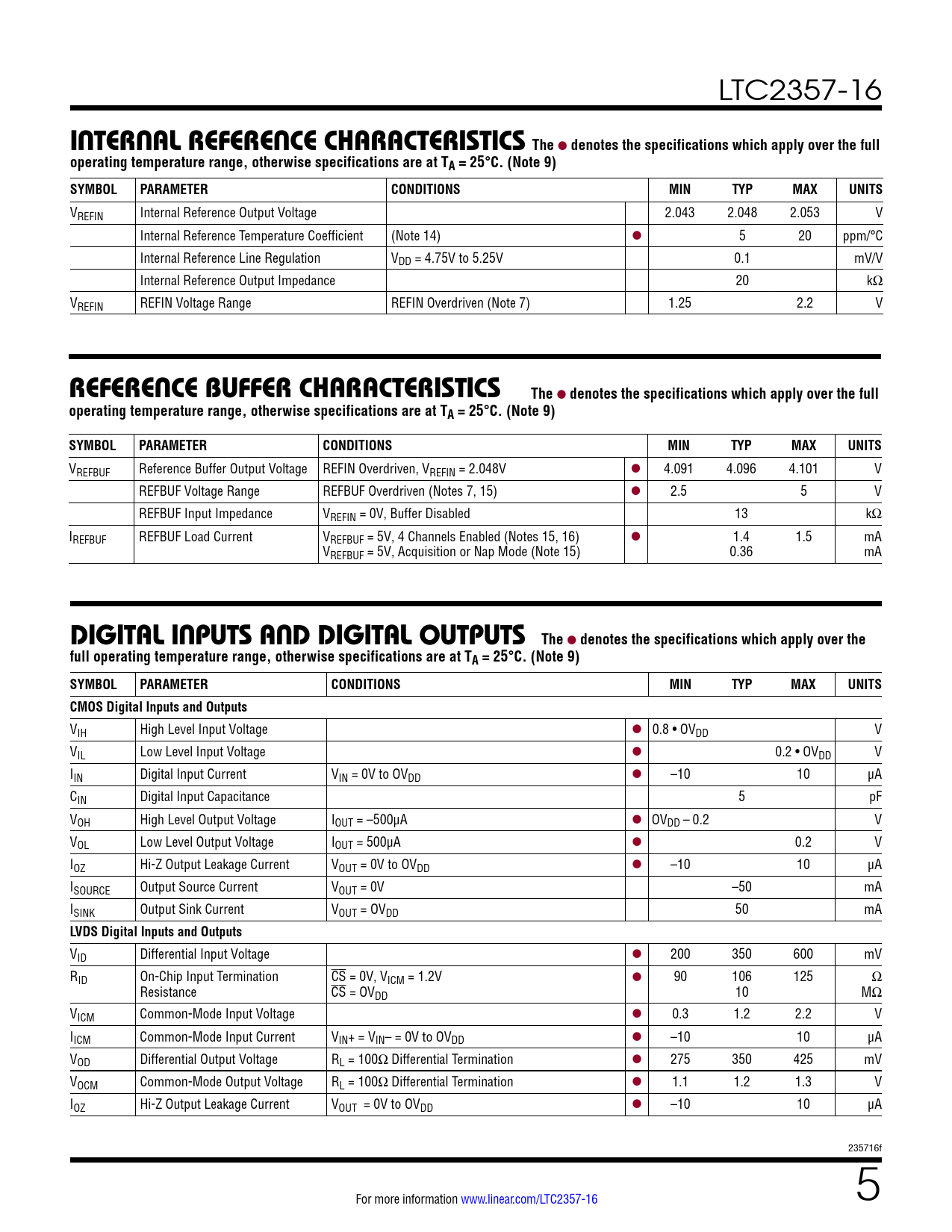 LTC2357-16 inTernal reFerencecharacTerisTicsThe l denotes the specifications which apply over the fulloperating temperature range, otherwise specifications are at TA = 25°C. (Note 9) SYMBOLPARAMETERCONDITIONSMINTYPMAXUNITS VREFIN Internal Reference Output Voltage 2.043 2.048 2.053 V Internal Reference Temperature Coefficient (Note 14) l 5 20 ppm/°C Internal Reference Line Regulation VDD = 4.75V to 5.25V 0.1 mV/V Internal Reference Output Impedance 20 kΩ VREFIN REFIN Voltage Range REFIN Overdriven (Note 7) 1.25 2.2 V reFerence buFFercharacTerisTicsThe l denotes the specifications which apply over the fulloperating temperature range, otherwise specifications are at TA = 25°C. (Note 9)SYMBOLPARAMETERCONDITIONSMINTYPMAXUNITS VREFBUF Reference Buffer Output Voltage REFIN Overdriven, VREFIN = 2.048V l 4.091 4.096 4.101 V REFBUF Voltage Range REFBUF Overdriven (Notes 7, 15) l 2.5 5 V REFBUF Input Impedance VREFIN = 0V, Buffer Disabled 13 kΩ IREFBUF REFBUF Load Current VREFBUF = 5V, 4 Channels Enabled (Notes 15, 16) l 1.4 1.5 mA VREFBUF = 5V, Acquisition or Nap Mode (Note 15) 0.36 mA DigiTal inpuTs anD DigiTal ouTpuTsThe l denotes the specifications which apply over thefull operating temperature range, otherwise specifications are at TA = 25°C. (Note 9) SYMBOLPARAMETERCONDITIONSMINTYPMAXUNITSCMOS Digital Inputs and Outputs VIH High Level Input Voltage l 0.8 • OVDD V VIL Low Level Input Voltage l 0.2 • OVDD V IIN Digital Input Current VIN = 0V to OVDD l –10 10 μA CIN Digital Input Capacitance 5 pF VOH High Level Output Voltage IOUT = –500μA l OVDD – 0.2 V VOL Low Level Output Voltage IOUT = 500μA l 0.2 V IOZ Hi-Z Output Leakage Current VOUT = 0V to OVDD l –10 10 μA ISOURCE Output Source Current VOUT = 0V –50 mA ISINK Output Sink Current VOUT = OVDD 50 mA LVDS Digital Inputs and Outputs VID Differential Input Voltage l 200 350 600 mV RID On-Chip Input Termination CS = 0V, VICM = 1.2V l 90 106 125 Ω Resistance CS = OVDD 10 MΩ VICM Common-Mode Input Voltage l 0.3 1.2 2.2 V IICM Common-Mode Input Current VIN+ = VIN– = 0V to OVDD l –10 10 μA VOD Differential Output Voltage RL = 100Ω Differential Termination l 275 350 425 mV VOCM Common-Mode Output Voltage RL = 100Ω Differential Termination l 1.1 1.2 1.3 V IOZ Hi-Z Output Leakage Current VOUT = 0V to OVDD l –10 10 μA 235716f For more information www.linear.com/LTC2357-16 5 Document Outline Features Applications Typical Application Description Absolute Maximum Ratings Order Information Pin Configuration Electrical Characteristics Converter Characteristics Dynamic Accuracy Internal Reference Characteristics Reference Buffer Characteristics Digital Inputs and Digital Outputs Power Requirements ADC Timing Characteristics Typical Performance Characteristics Pin Functions Configuration Tables Functional Block Diagram Timing Diagram Applications Information Board Layout Package Description Typical Application Related Parts