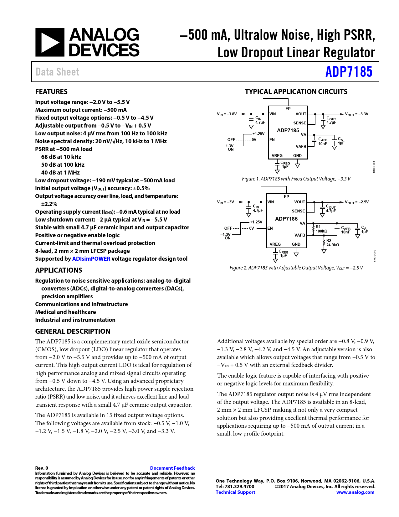 −500 mA, Ultralow Noise, High PSRR,. Low Dropout Linear Regulator. Data Sheet. ADP7185. FEATURES. TYPICAL APPLICATION CIRCUITS