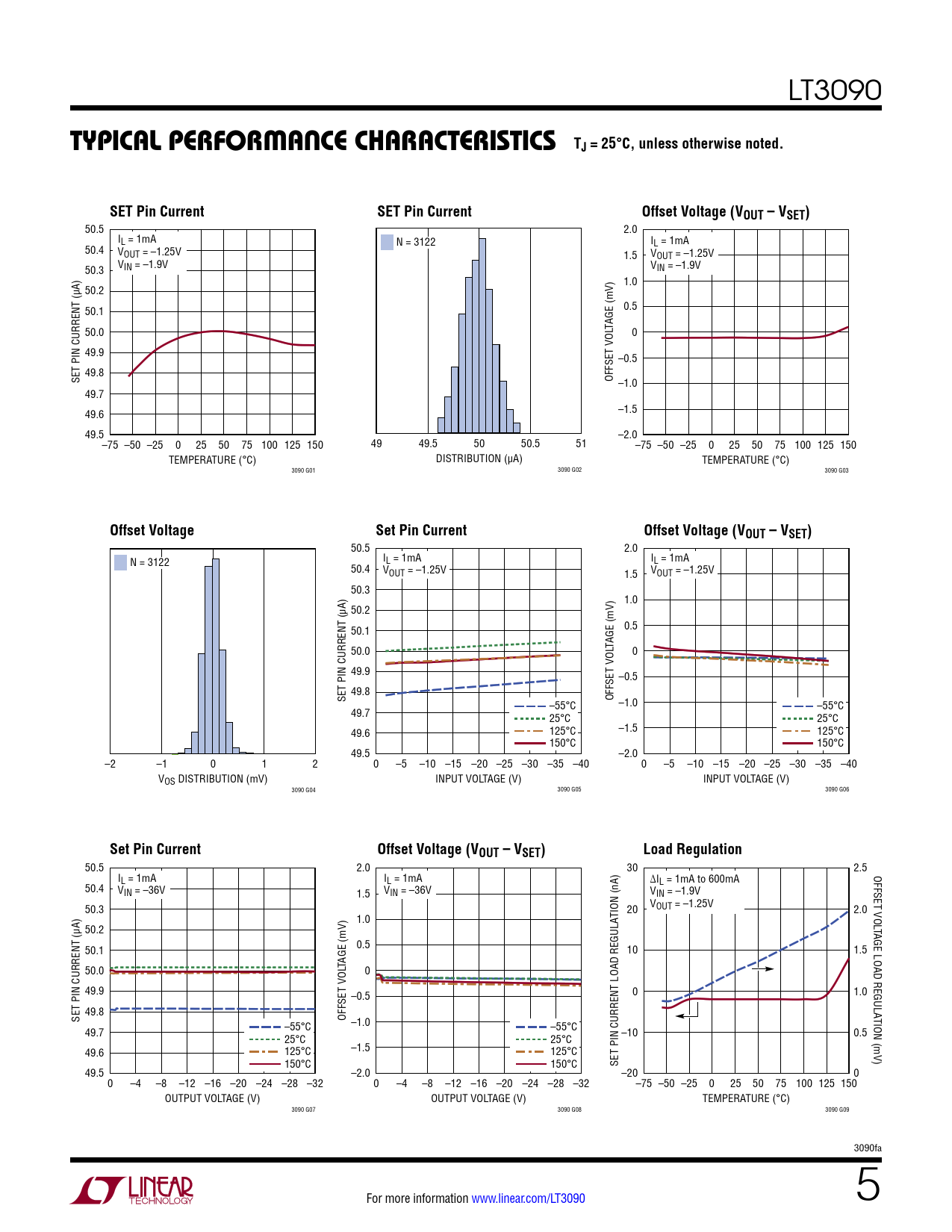 50.5 2.0 IL = 1mA IL = 1mA N = 3122 50.4 VOUT = –1.25V 1.5 VOUT = –1.25V 50.3 1.0 50.2 50.1 0.5 TAGE (mV) 50.0 0 49.9 –0.5 SET PIN CURRENT (µA) 49.8 OFFSET VOL –55°C –1.0 –55°C 49.7 25°C 25°C 49.6 125°C –1.5 125°C 150°C 150°C 49.5 –2.0 –2 –1 0 1 2 0 –5 –10 –15 –20 –25 –30 –35 –40 0 –5 –10 –15 –20 –25 –30 –35 –40 VOS DISTRIBUTION (mV) INPUT VOLTAGE (V) INPUT VOLTAGE (V) 3090 G04 3090 G05 3090 G06
