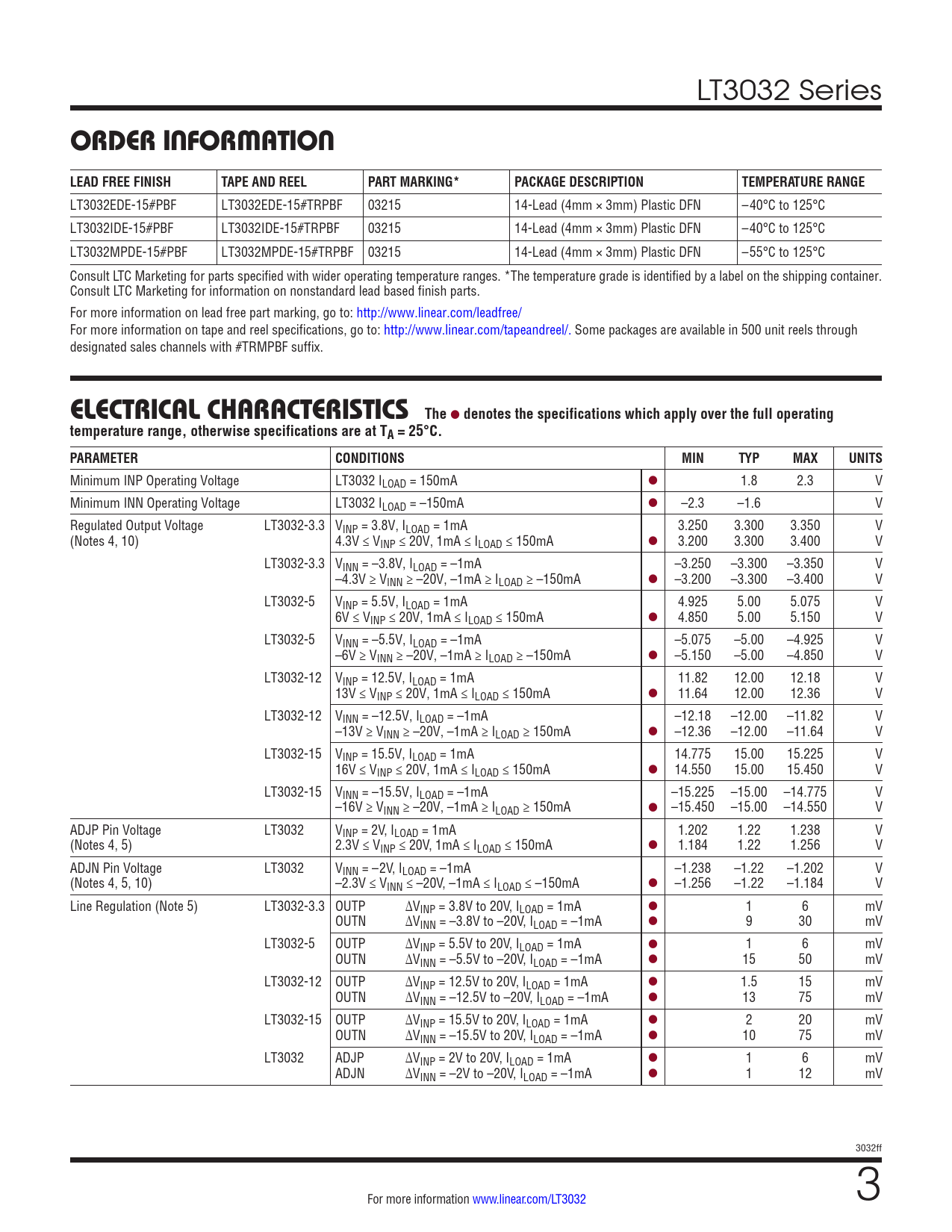 LT3032EDE-15#PBF LT3032EDE-15#TRPBF 03215 14-Lead (4mm × 3mm) Plastic DFN –40°C to 125°C LT3032IDE-15#PBF LT3032IDE-15#TRPBF 03215 14-Lead (4mm × 3mm) Plastic DFN –40°C to 125°C LT3032MPDE-15#PBF LT3032MPDE-15#TRPBF 03215 14-Lead (4mm × 3mm) Plastic DFN –55°C to 125°C Consult LTC Marketing for parts specified with wider operating temperature ranges. *The temperature grade is identified by a label on the shipping container. Consult LTC Marketing for information on nonstandard lead based finish parts. For more information on lead free part marking, go to: http://www.linear.com/leadfree/ For more information on tape and reel specifications, go to: http://www.linear.com/tapeandreel/. Some packages are available in 500 unit reels through designated sales channels with #TRMPBF suffix.