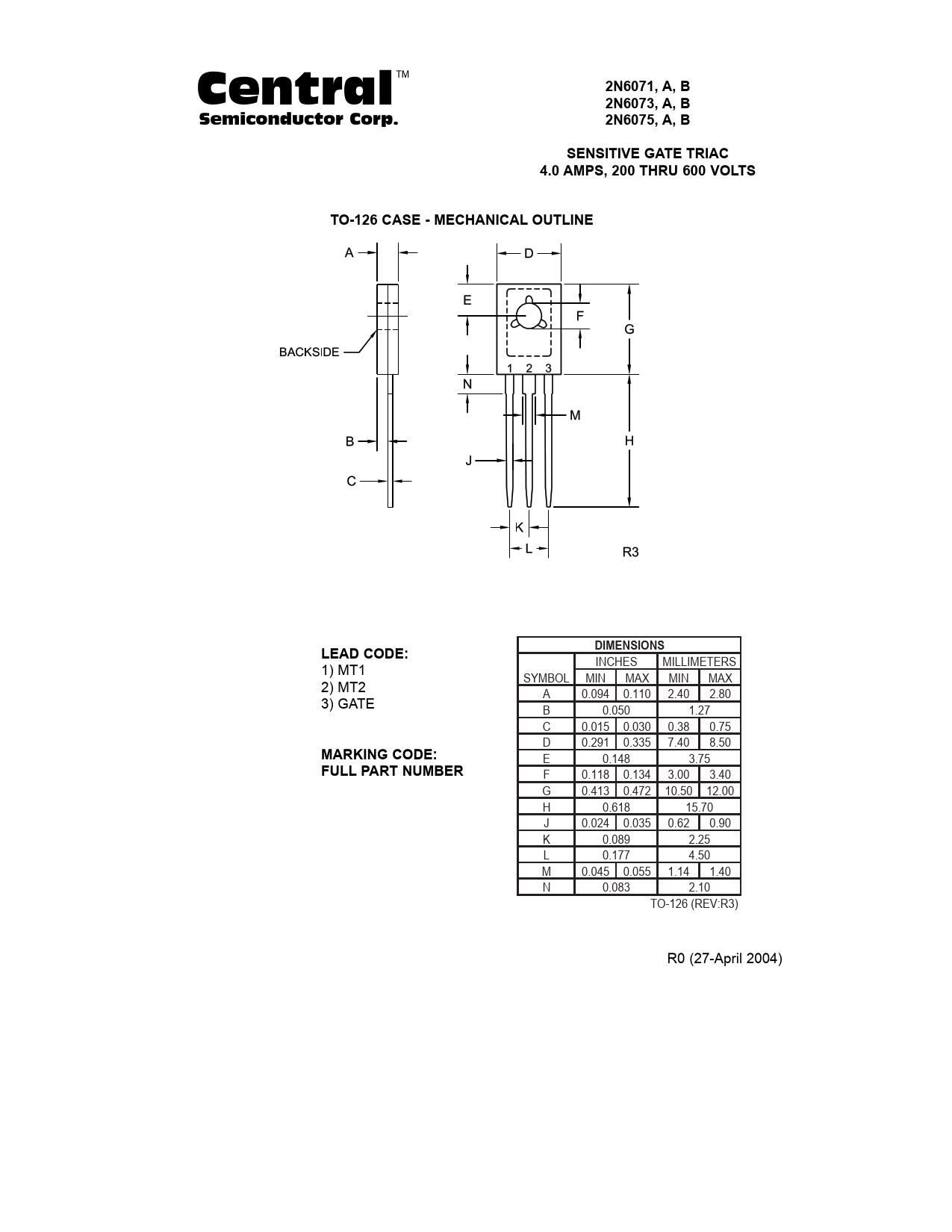 2N6071, A, B 2N6073, A, B. 2N6075, A, B. SENSITIVE GATE TRIAC. 4.0 AMPS, 200 THRU 600 VOLTS. TO-126 CASE - MECHANICAL OUTLINE