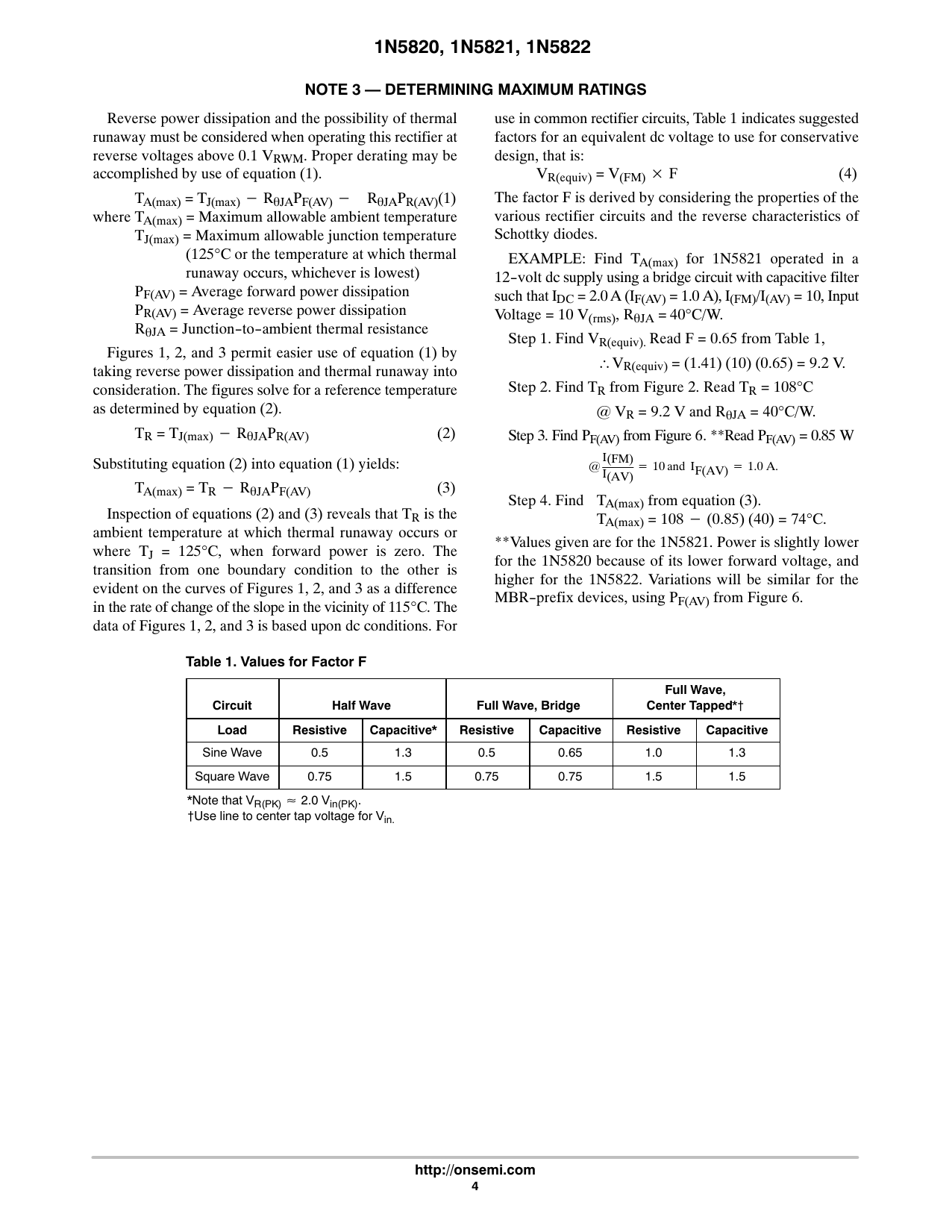 link to page 5 link to page 5 link to page 5 link to page 5 link to page 5 link to page 5 link to page 5 link to page 5 link to page 5 link to page 4 link to page 4 link to page 5 link to page 6 link to page 6 1N5820, 1N5821, 1N5822NOTE 3 — DETERMINING MAXIMUM RATINGS Reverse power dissipation and the possibility of thermal use in common rectifier circuits, Table 1 indicates suggested runaway must be considered when operating this rectifier at factors for an equivalent dc voltage to use for conservative reverse voltages above 0.1 VRWM. Proper derating may be design, that is: accomplished by use of equation (1). VR(equiv) = V(FM) F (4) TA(max) = TJ(max) RqJAPF(AV) RqJAPR(AV)(1) The factor F is derived by considering the properties of the where TA(max) = Maximum allowable ambient temperature various rectifier circuits and the reverse characteristics of TJ(max) = Maximum allowable junction temperature Schottky diodes. (125°C or the temperature at which thermal EXAMPLE: Find TA(max) for 1N5821 operated in a runaway occurs, whichever is lowest) 12-volt dc supply using a bridge circuit with capacitive filter PF(AV) = Average forward power dissipation such that IDC = 2.0 A (IF(AV) = 1.0 A), I(FM)/I(AV) = 10, Input PR(AV) = Average reverse power dissipation Voltage = 10 V(rms), RqJA = 40°C/W. RqJA = Junction-to-ambient thermal resistance Step 1. Find VR(equiv). Read F = 0.65 from Table 1, Figures 1, 2, and 3 permit easier use of equation (1) by V taking reverse power dissipation and thermal runaway into R(equiv) = (1.41) (10) (0.65) = 9.2 V. consideration. The figures solve for a reference temperature Step 2. Find TR from Figure 2. Read TR = 108°C as determined by equation (2). @ VR = 9.2 V and RqJA = 40°C/W. TR = TJ(max) RqJAPR(AV) (2) Step 3. Find PF(AV) from Figure 6. **Read PF(AV) = 0.85 W Substituting equation (2) into equation (1) yields: I(FM) @ 10 and I I F(AV) 1.0A. (AV) TA(max) = TR RqJAPF(AV) (3) Step 4. Find TA(max) from equation (3). Inspection of equations (2) and (3) reveals that TR is the TA(max) = 108 (0.85) (40) = 74°C. ambient temperature at which thermal runaway occurs or **Values given are for the 1N5821. Power is slightly lower where TJ = 125°C, when forward power is zero. The for the 1N5820 because of its lower forward voltage, and transition from one boundary condition to the other is higher for the 1N5822. Variations will be similar for the evident on the curves of Figures 1, 2, and 3 as a difference MBR-prefix devices, using P in the rate of change of the slope in the vicinity of 115°C. The F(AV) from Figure 6. data of Figures 1, 2, and 3 is based upon dc conditions. For Table 1. Values for Factor FFull Wave,CircuitHalf WaveFull Wave, BridgeCenter Tapped *† LoadResistiveCapacitive*ResistiveCapacitiveResistiveCapacitive Sine Wave 0.5 1.3 0.5 0.65 1.0 1.3 Square Wave 0.75 1.5 0.75 0.75 1.5 1.5 *Note that VR(PK) 2.0 Vin(PK). †Use line to center tap voltage for Vin. http://onsemi.com4