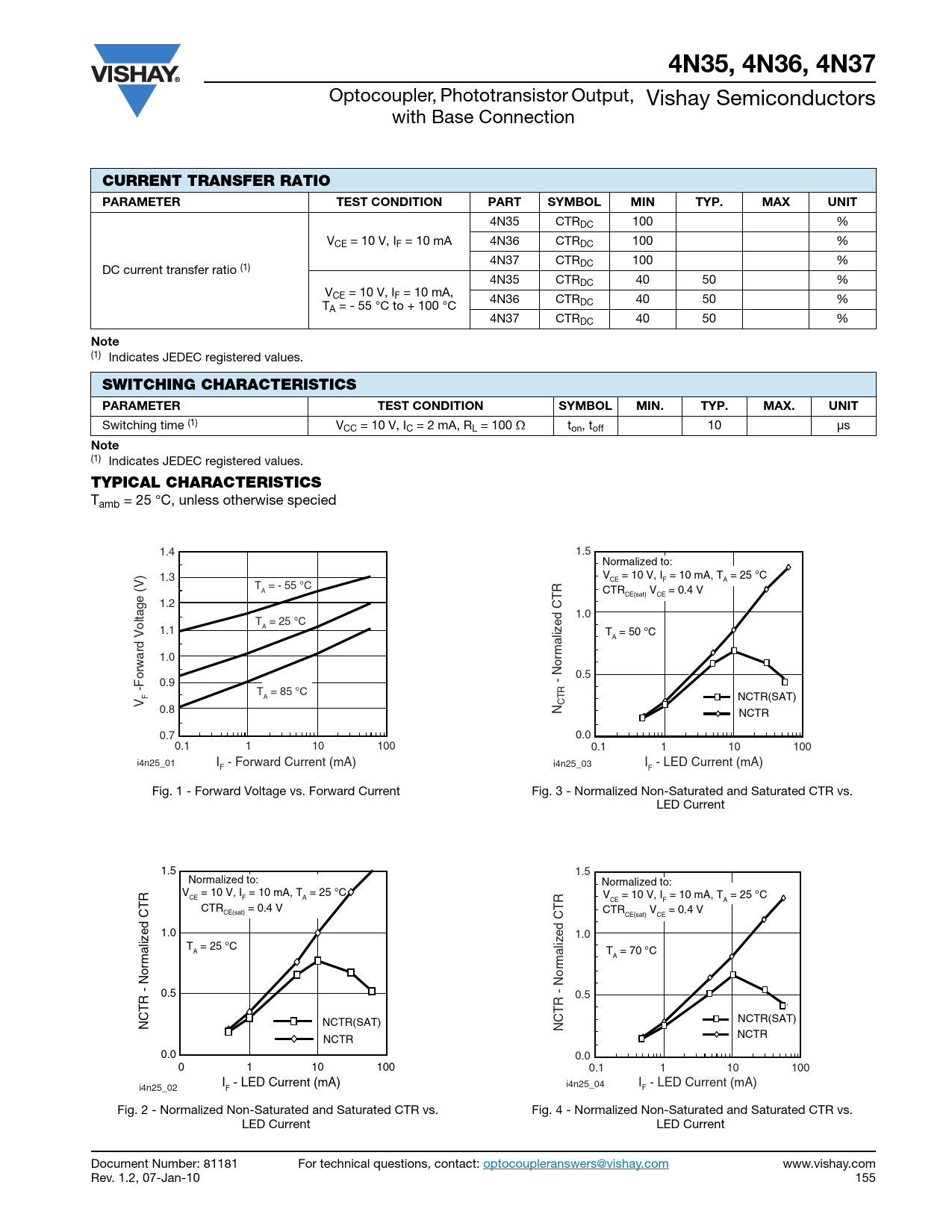 4N35, 4N36, 4N37. CURRENT TRANSFER RATIO. PARAMETER. TEST CONDITION. PART. SYMBOL. MIN. TYP. MAX. UNIT. Note. SWITCHING CHARACTERISTICS. MIN. MAX
